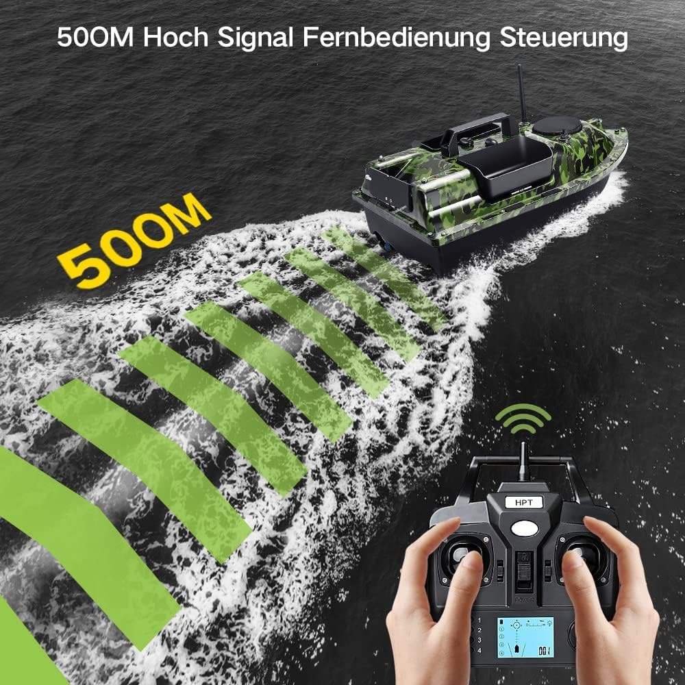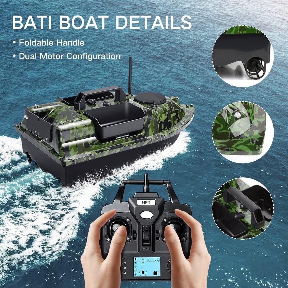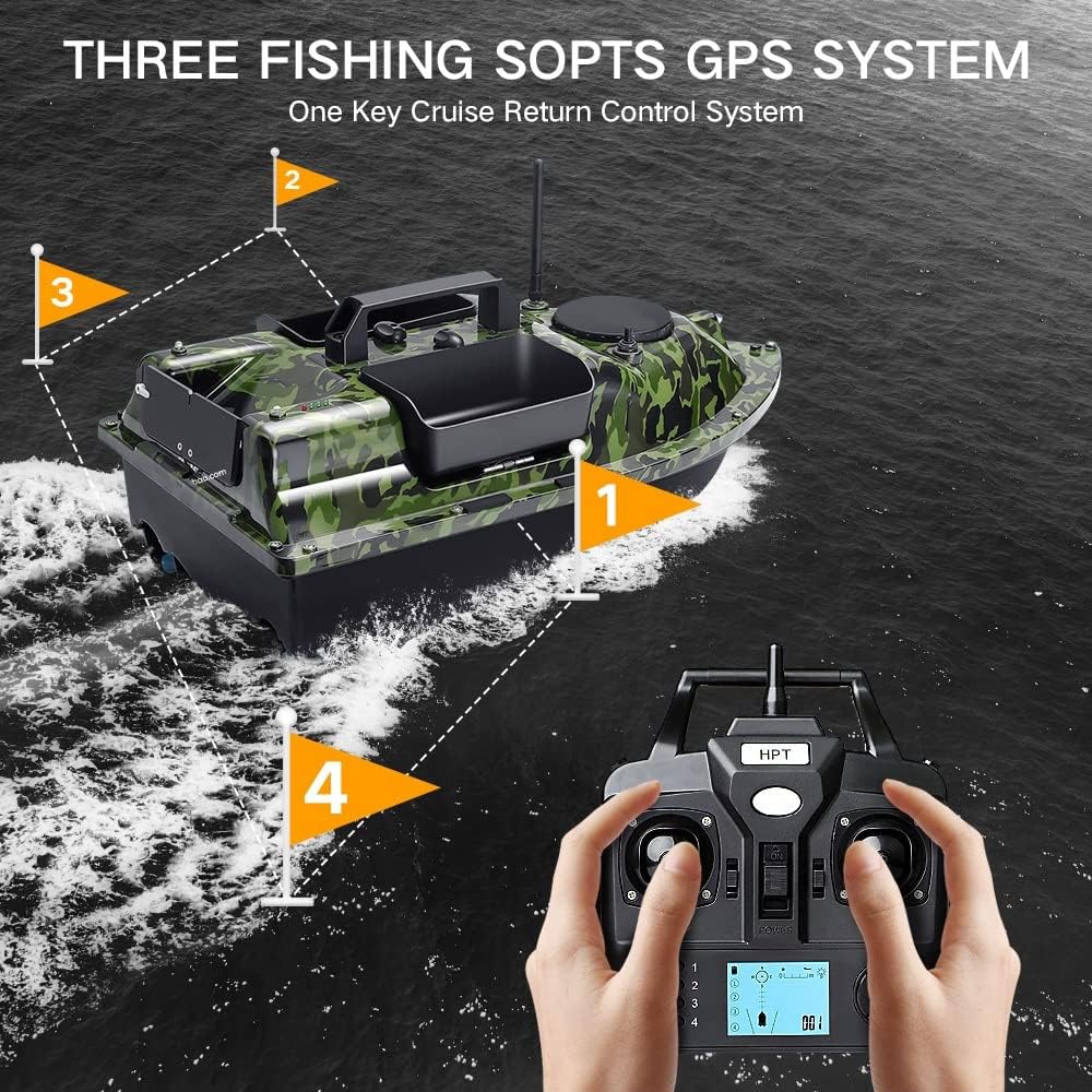 16 punti di memoria programmabili: consente di impostare fino a 16 posizioni di memoria per una facile navigazione. Dispone di una funzione di ritorno a un tasto per un rapido ritorno al punto di partenza, garantendo un funzionamento semplice e un comodo controllo. Batteria ad alta capacità da 12.000 mAh: dotata di tre batterie da 12.000 mAh, ognuna delle quali fornisce 4-6 ore di funzionamento continuo, garantendo un uso prolungato senza frequenti ricariche. Esca e gancio integrati: progettato per il posizionamento senza sforzo di esche e ami. La barca può essere controllata a distanza fino a 500 metri, con ritorno intelligente a un pulsante e crociera automatica per un funzionamento senza problemi. Navigazione a LED per la pesca notturna: include indicatori LED per facilitare le operazioni notturne, consentendo un facile giudizio della direzione di navigazione e garantendo un lancio preciso dell'esca in condizioni di scarsa illuminazione. Ricezione del segnale migliorata: offre un raggio di controllo remoto di 300-500 metri. Nota: la distanza può variare a seconda degli ostacoli o delle interferenze del segnale, garantendo un funzionamento affidabile in varie condizioni.