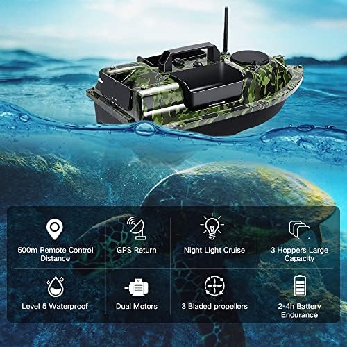 16 punti di memoria: facilmente impostare e navigare attraverso 16 diversi punti di memoria. Utilizza il comodo pulsante "ritorno a un tasto" per tornare rapidamente alla posizione di partenza con un semplice funzionamento. Batteria ad alta capacità da 12.000 mAh: dotata di tre batterie da 12.000 mAh, garantendo che ognuno possa funzionare per 4-6 ore, fornendo sessioni di pesca estese. Comodo posizionamento del gancio: posiziona facilmente esche e ami con precisione. Il telecomando consente di azionare la barca entro un raggio di 500 metri, con un solo pulsante di ritorno intelligente e funzione di crociera automatica. Pronta per la pesca notturna: la barca è dotata di indicatori LED per l'uso notturno, aiutandoti a navigare facilmente e garantendo un lancio preciso dell'esca. Forte ricezione del segnale: la barca telecomandata può mantenere una portata di 300-500 metri. Si prega di notare che ostacoli o interferenze di segnale possono ridurre questa distanza.