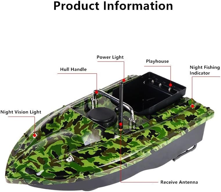 Il corpo della barca impermeabile e resistente agli urti è progettato per una maggiore durata e resistenza. Dispone di un serbatoio di esche super grande capacità in grado di contenere fino a 1,5 kg di esca. Dotato di una batteria integrata da 5200 mAh 18650, offre un lungo tempo di standby fino a 2-3 ore. La distanza del telecomando si estende fino a 500 m senza interferenze e include una luce LED per la pesca notturna per localizzare accuratamente le aree di pesca. Le specifiche includono: Materiale: ABS + acciaio inossidabile, colore: come mostrato, tensione: 110-240 V, distanza del telecomando: 500 m, peso del carico: 1,5 kg, tempo di standby: 3H, dimensioni: ca. 49 x 27 x 16 cm. Batteria per barca: batteria 18650 da 5200 mAh, batteria del telecomando: 2 batterie AAA (non incluse). Inoltre, è compatibile con Fishfinder GPS, dotato di un sistema di frequenza sonar con uno schermo LCD per prestazioni potenti fino a 120 piedi, pesce udibile e allarme di profondità, ed è compatto, leggero e portatile. Supporta vari metodi di pesca tra cui pesca in barca, pesca a piattaforma, pesca a lunga distanza e pesca sul ghiaccio. Il dispositivo offre un raggio di funzionamento wireless di 100 m e una capacità di profondità di 45 m, con un angolo di fascio di 90 gradi in 125 Khz. Specifiche per i Fishfinder GPS includono: Batterie: 4 * batterie AAA (non incluse), Potenza: 0.1W, Profondità: 2-120Ft, Funzionamento wireless: 100m, Frequenza Sonar: 125KHZ, Angolo del fascio sonar: 90 gradi, Frequenza radio: 433,92 MHz, Temperatura di funzionamento: -20 ~ + 70 ° C, Formato dell'articolo: 125 * 72 * 30 mm/4,92 millimetri *2.83 * 1.18in, Peso dell'articolo: 205g/7.23oz, Formato della confezione: 250*110*80mm/9.84*4.33*3.15in, Peso della confezione: 350g/14.11oz. Importanti avvertenze sulla batteria includono evitare sovraccarico, scaricamento eccessivo, alte temperature, fuoco e acqua. Nota: il sensore sonar ha due piccoli fori per il fissaggio a una barca esca telecomando o per l'uso in modalità galleggiante stazionaria notturna.