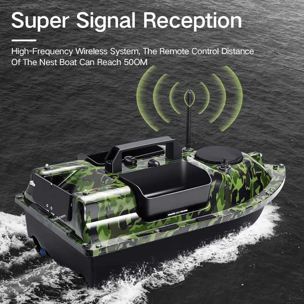 16 punti di memoria: consente di impostare fino a 16 punti di memoria, consentendo una navigazione senza sforzo tra di loro. Dispone di una funzione di ritorno a un tasto per un rapido ritorno dell'origine, garantendo un funzionamento semplice e un comodo controllo. Batteria ad alta capacità: dotata di tre batterie da 12.000 mAh, ciascuna in grado di supportare il funzionamento per 4-6 ore, fornendo un tempo di utilizzo prolungato senza frequenti ricariche. Sistema di aggancio integrato: progettato per un facile posizionamento di esche e ami, migliorando l'efficienza della pesca. La barca può essere controllata a distanza entro un raggio di 500 metri, con ritorno intelligente a un pulsante e crociera automatica per comodità dell'utente. Capacità di pesca notturna: include indicatori LED per il funzionamento notturno, aiutando nel giudizio della direzione di navigazione e garantendo un lancio preciso dell'esca in condizioni di scarsa illuminazione. Ricezione del segnale migliorata: offre un raggio di controllo remoto fino a 300-500 metri. Si noti che la presenza di ostacoli o interferenze del segnale può ridurre questa distanza operativa.