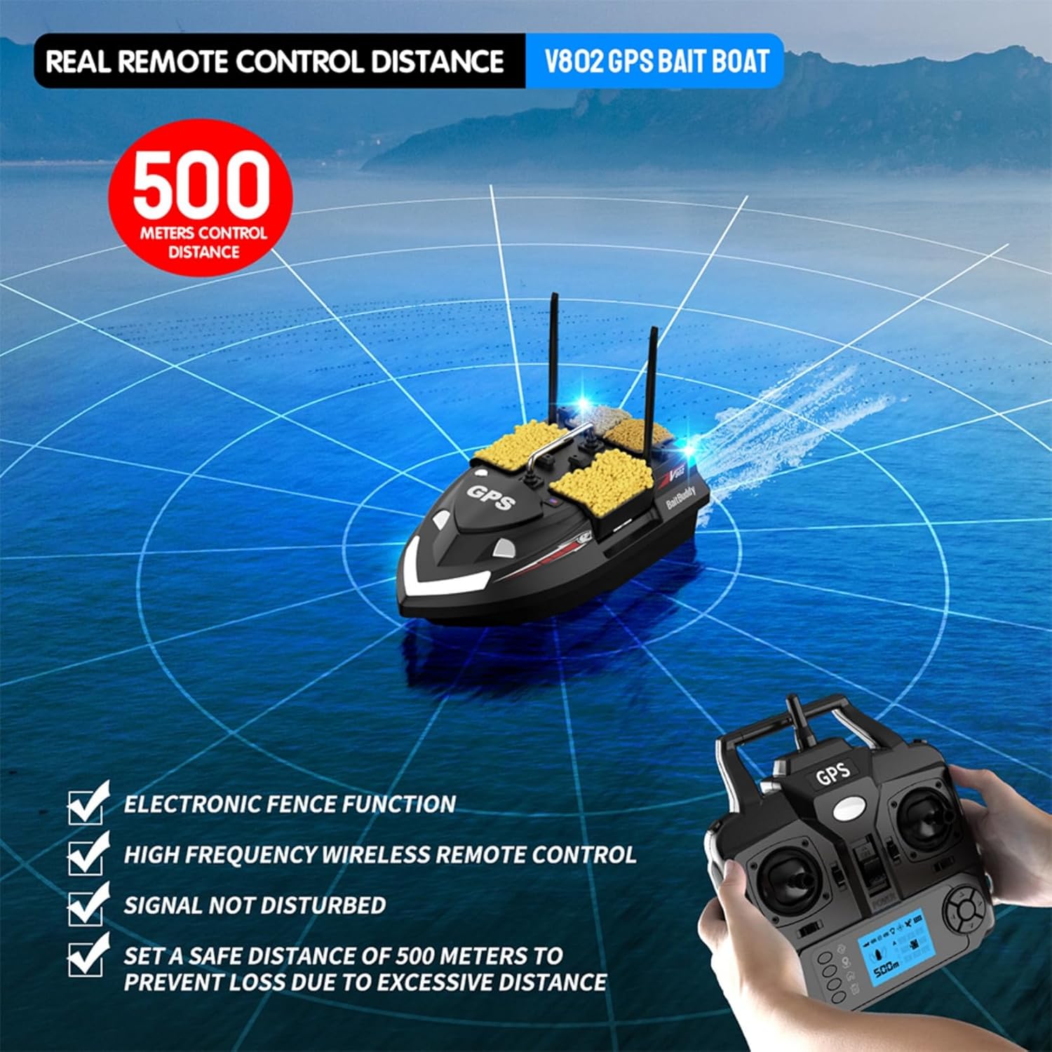 4 Imbuto con nidificazione indipendente: quattro imbuti sono controllati in modo indipendente, alimentazione precisa e soddisfano diverse esigenze di pesca. Batteria al litio: batteria al litio da 12000 mAh ad alta capacità e durata. Situato nel mezzo dello scafo, è più stabile. Se la batteria è insufficiente, tornerà automaticamente alla sua origine. Doppio cavo di alimentazione: doppio cavo di alimentazione, supporta l'alimentazione ininterrotta da due batterie e raddoppia la durata della batteria. Design del prodotto: Esca barca GPS intelligente distanza di controllo remoto 100-500 metri (acqua pulita senza interferenze), navigazione GPS può essere controllata individualmente, a basso rumore, con faro a LED per la pesca notturna, 4 imbuto esca e design a doppio motore per un funzionamento più veloce, peso portante circa 3 kg. Organizer portatile: ognuna delle nostre barche viene fornita con una borsa a mano per un facile trasporto e viaggio.