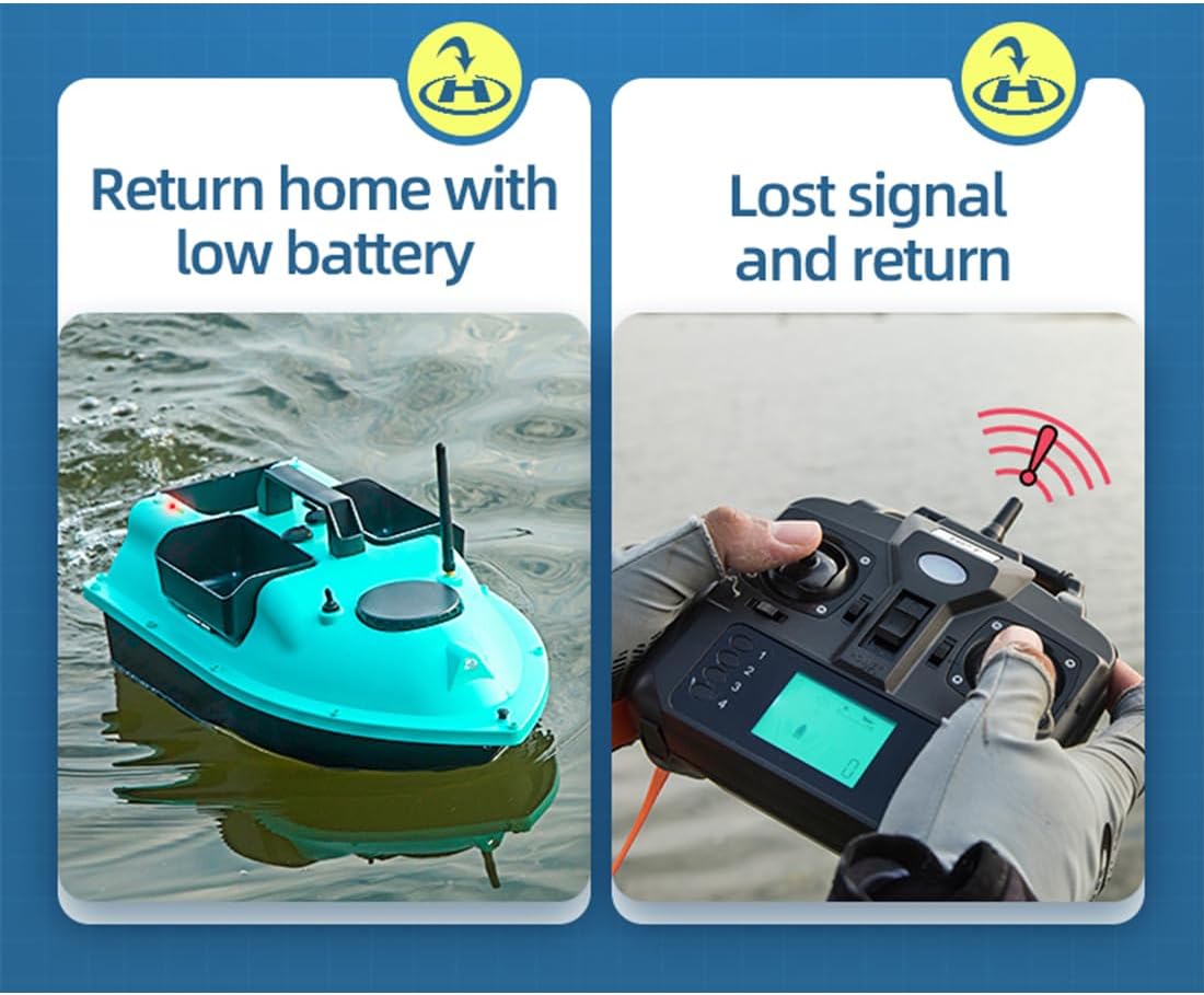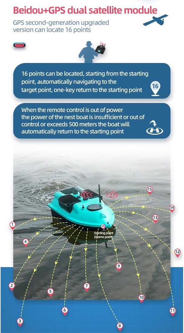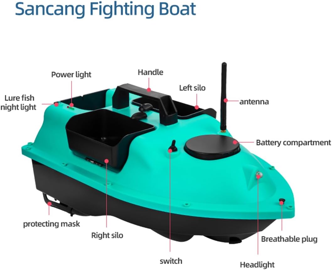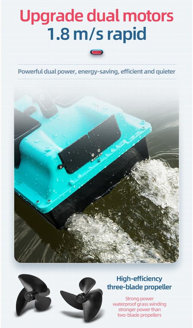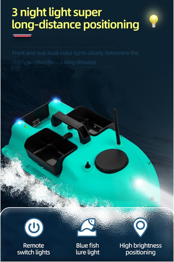RC Bait Boat con LED: Un faro bianco brillante e due luci di posizione posteriori blu per una navigazione chiara dopo il tramonto. Batteria a lunga durata: dispone di una batteria da 12.000 mAh, che offre una resistenza eccezionale per sessioni di pesca più lunghe senza frequenti ricariche. Design indipendente a 4 esche Hopper: include illuminazione controllata separatamente e tre tramogge indipendenti per una distribuzione precisa e versatile dell'esca durante le battute di pesca Barca esca ad alte prestazioni: dotata di doppi motori e eliche doppie per una spinta potente e una conversione efficiente dell'energia Luoghi applicabili: fiumi, laghi, acque offshore, ecc.