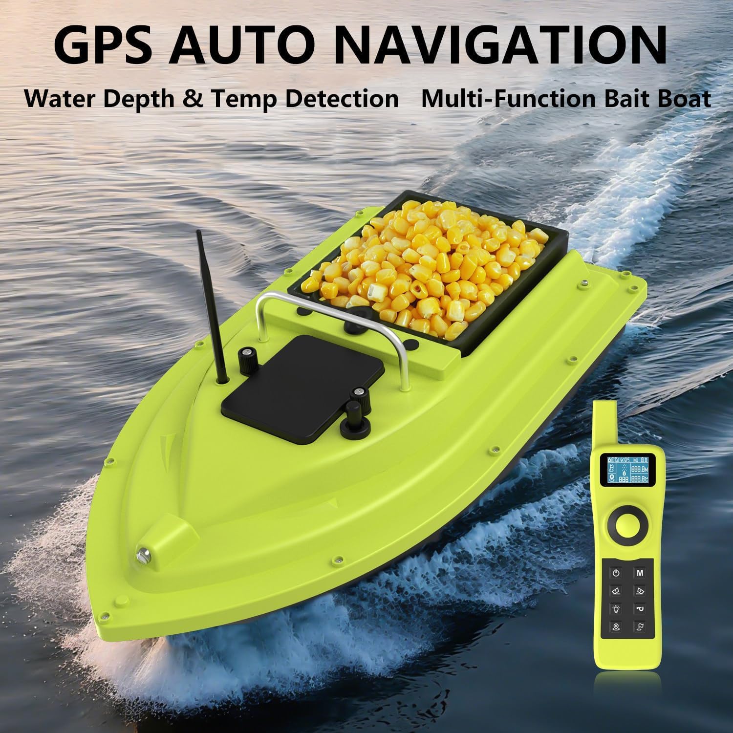 La barca da pesca con esca GPS RC aggiornata presenta test di profondità dell'acqua e monitoraggio della temperatura (0-50 ° C) per aiutare a localizzare punti di pesca ottimali, con un telecomando impermeabile, due punti GPS per le posizioni di origine e pesca, ritorno automatico sulla batteria scarica o perdita di segnale e un display di portata 500 m. Costruita in materiale ABS, questa barca esca RC include un grande silo indipendente in grado di contenere fino a 2 kg di esca, consentendo un rilascio silenzioso ed efficace senza disturbare i pesci, ideale per esche pesanti o esche grandi. Alimentata da due batterie da 24000 mAh, la barca offre una durata prolungata per lunghe sessioni di pesca, riducendo la necessità di frequenti ricariche e manipolazione delle onde fino al livello 5-6 e condizioni di tempesta. Progettato per la pesca notturna con luci di navigazione per aiutare la direzione e attirare i pesci, dotato di uno schermo LCD impermeabile che visualizza distanza, carica della batteria, stato della luce notturna, tasto di posizione e funzioni di ritorno a un tasto. Dotato di un sistema di propulsione a doppio motore e di uno scafo in ABS aerodinamico per stabilità e durata in acque difficili, completamente impermeabile per l'uso in tutte le stagioni, garantendo prestazioni affidabili sia per i principianti che per i pescatori esperti.