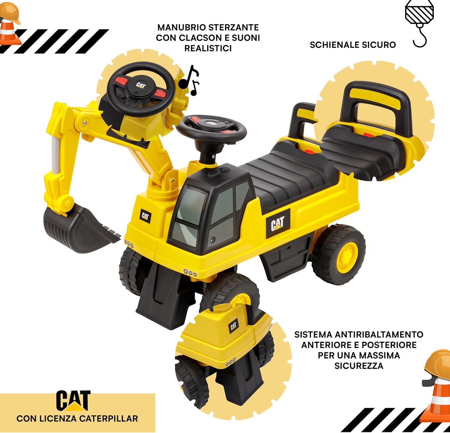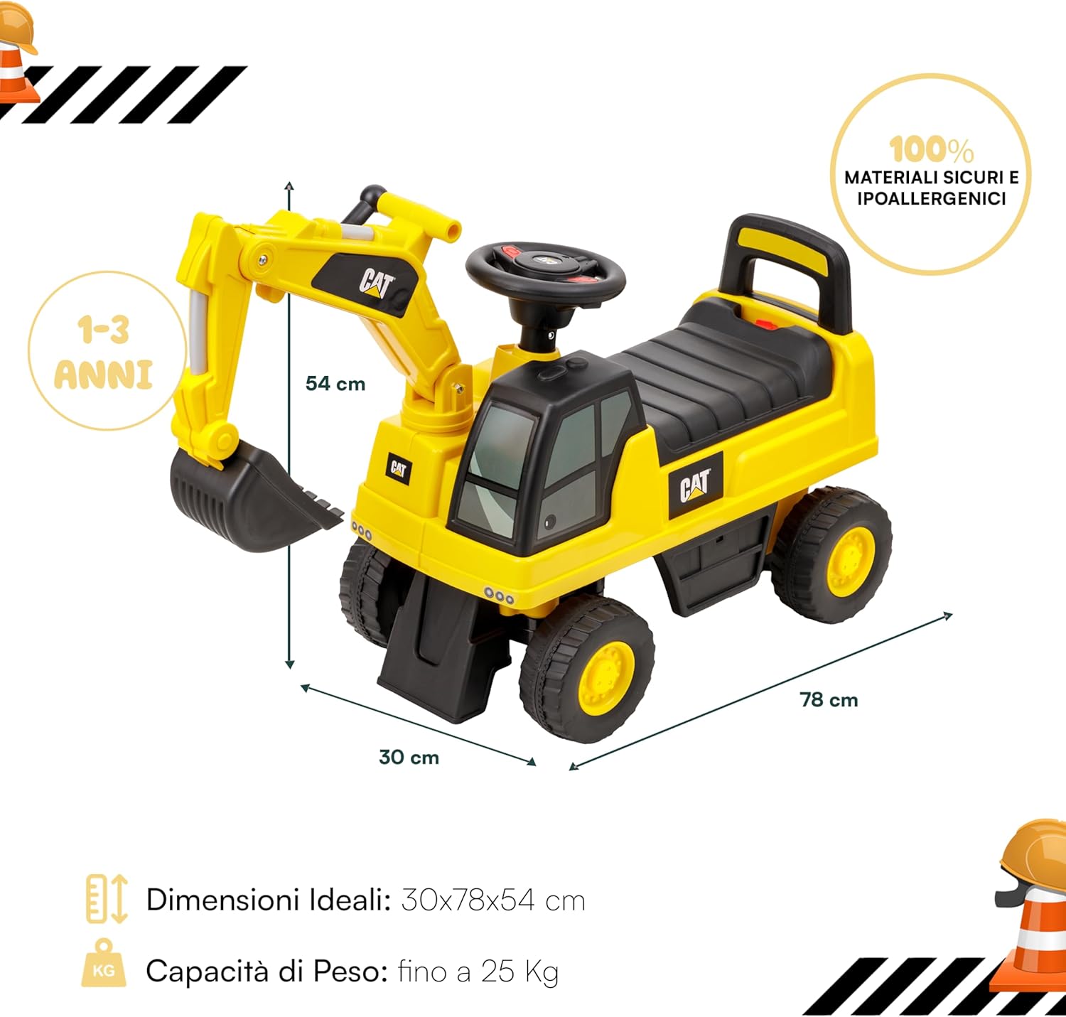 SICURO E STABILE: Dotato di ruote profilate che garantiscono un'ottima aderenza su tutti i tipi di terreno. La protezione antiribaltamento fornisce ulteriore sicurezza, mentre i materiali ipoallergenici garantiscono che il giocattolo sia sicuro per la pelle sensibile dei bambini. LICENZA UFFICIALE CATERPILLAR: questo bulldozer/escavatore a bordo presenta un design autentico e dettagli realistici che forniscono un'esperienza di gioco coinvolgente ed educativa. I bambini possono vestire i panni di un vero operatore di macchine edili e promuovere così la loro immaginazione e creatività. CARATTERISTICHE REALISTICHE: Dotato di un manubrio orientabile per una facile manovrabilità e di una leva di comando che consente di spostare manualmente il braccio su e giù. Inoltre la leva è dotata di un dispositivo girevole per il controllo direzionale. Il pulsante del clacson acustico aggiunge un ulteriore tocco di realismo al gioco e garantisce un'esperienza di gioco interattiva e divertente. FACILE DA INSTALLARE E LEGGERO: questo escavatore/frantoio richiede solo 15 minuti per essere assemblato, così i bambini possono iniziare subito a giocare. Con un peso di soli 3 kg, è facile da trasportare e spostare, rendendolo ideale per un uso versatile sia interno che esterno. ADATTO PER INTERNI ED ESTERNI: questo escavatore è perfetto per il gioco indoor e outdoor grazie alla sua struttura robusta. Pensato per i bambini da 1 a 3 anni, misura 30 cm di larghezza, 78 cm di lunghezza e 54 cm di altezza. Può sostenere un massimo di 25 kg e offre un gioco sicuro, versatile e duraturo.