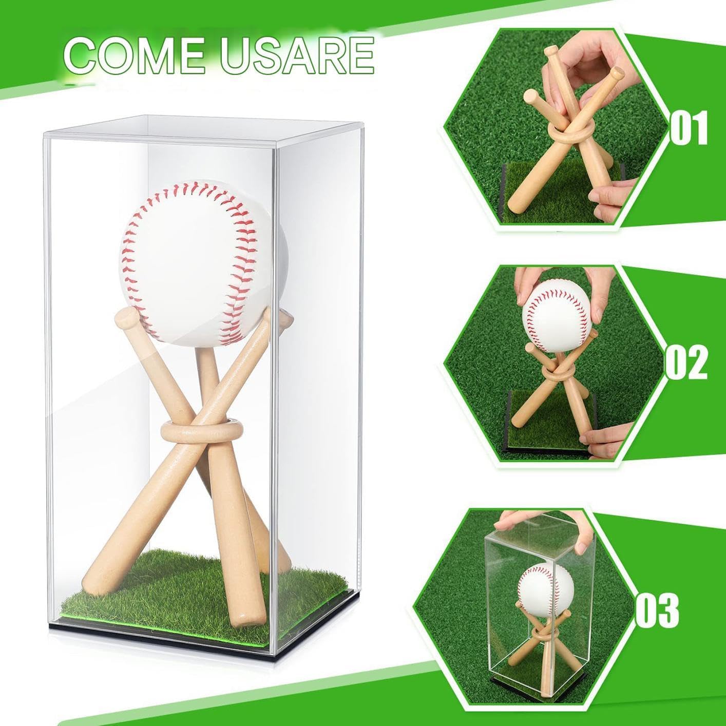 Stabilità senza sforzo: con scorrimento delicato, l'innovativa struttura della copertura scorrevole garantisce che la palla da baseball sia stabile e sicura, eliminando completamente le vibrazioni per un display in qualsiasi situazione Vista a 360 gradi: mostra la tua palla da baseball da ogni angolazione con la nostra vetrina trasparente con una trasparenza del 98%, catturando ogni dettaglio senza punti ciechi Robusto materiale acrilico: realizzata in resistente materiale acrilico, questa custodia protettiva previene sbiadimenti e , garantendo che la tua collezione di baseball mantenga il suo fascino e la sua longevità Robusto design triangolare: dotata di 3 piccole mazze di legno e un anello di legno, costruiti per formare un supporto triangolare stabile, questa vetrina esalta la bellezza e la praticità, garantendo un facile assemblaggio per sfoggiare in sicurezza la tua palla da baseball con un effetto stabile e non traballante Ideale per la sicurezza dei souvenir: ampia applicazione, non solo per le palle da baseball ma perfetta anche per softball, palline da golf, palline da tennis e una varietà di oggetti da collezione, rendendolo la scelta migliore per salvaguardare ricordi preziosi e il tocco finale 'arredamento della casa o 'ufficio