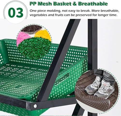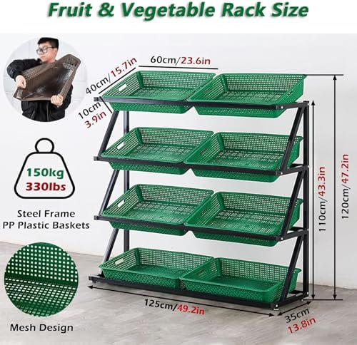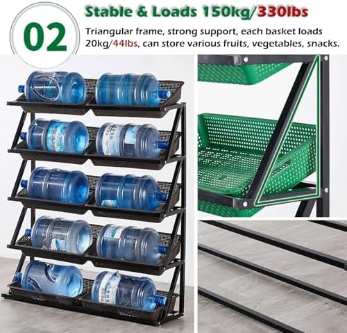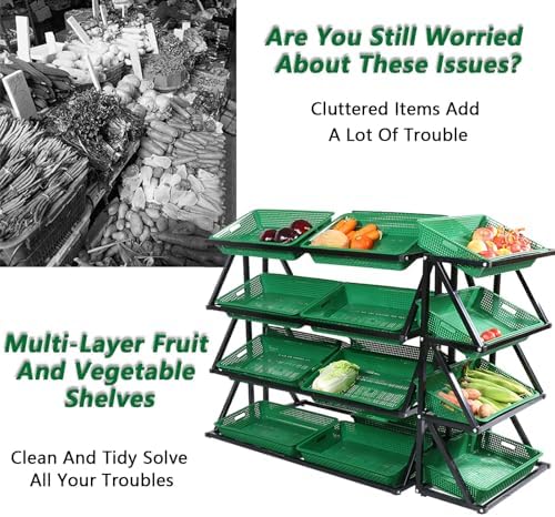 Ampia capacità di archiviazione: questo espositore per snack dispone di 4 o 8 ampi cestini, consentendo una facile organizzazione di frutta, verdura, giocattoli, libri, snack e molto altro ancora. Migliora l'ordine e l'organizzazione del tuo spazio deliziando i tuoi clienti con una soluzione funzionale ed elegante. Perfetto per negozi, bar e uso domestico. Struttura in acciaio resistente: progettato per negozi di alimentari, questo espositore per snack presenta un design triangolare stabile che garantisce stabilità e impedisce oscillazioni. Realizzato con tubi in acciaio ispessiti e durevoli, è robusto, impermeabile e resistente alla ruggine, costruito per resistere a carichi pesanti senza collassare, fornendo tranquillità. Applicazione versatile: perfetta sia per uso commerciale che domestico, questa mensola è ideale per supermercati, farmacie, minimarket, dormitori, salotti, camere da letto, cucine e molto altro ancora. Offre una soluzione efficiente per conservare frutta, verdura, cibi freschi, giocattoli, generi alimentari e oggetti essenziali per tutti i giorni. Mantieni il tuo spazio organizzato con questa pratica soluzione di archiviazione. Piedini regolabili per una maggiore stabilità: i piedini del rack possono essere facilmente regolati per adattarsi a varie superfici irregolari. Ogni parte sporgente è dotata di angoli protettivi per evitare graffi sul pavimento, consentendo un movimento fluido garantendo sicurezza e stabilità. Applicazione versatile: ideale sia per uso commerciale che commerciale, questo scaffale è perfetto per supermercati, farmacie, minimarket, dormitori, salotti, camere da letto, cucine e molto ancora, fornendo una soluzione efficiente per conservare frutta, verdura, alimenti freschi, giocattoli, prodotti agricoli e oggetti essenziali di uso quotidiano.