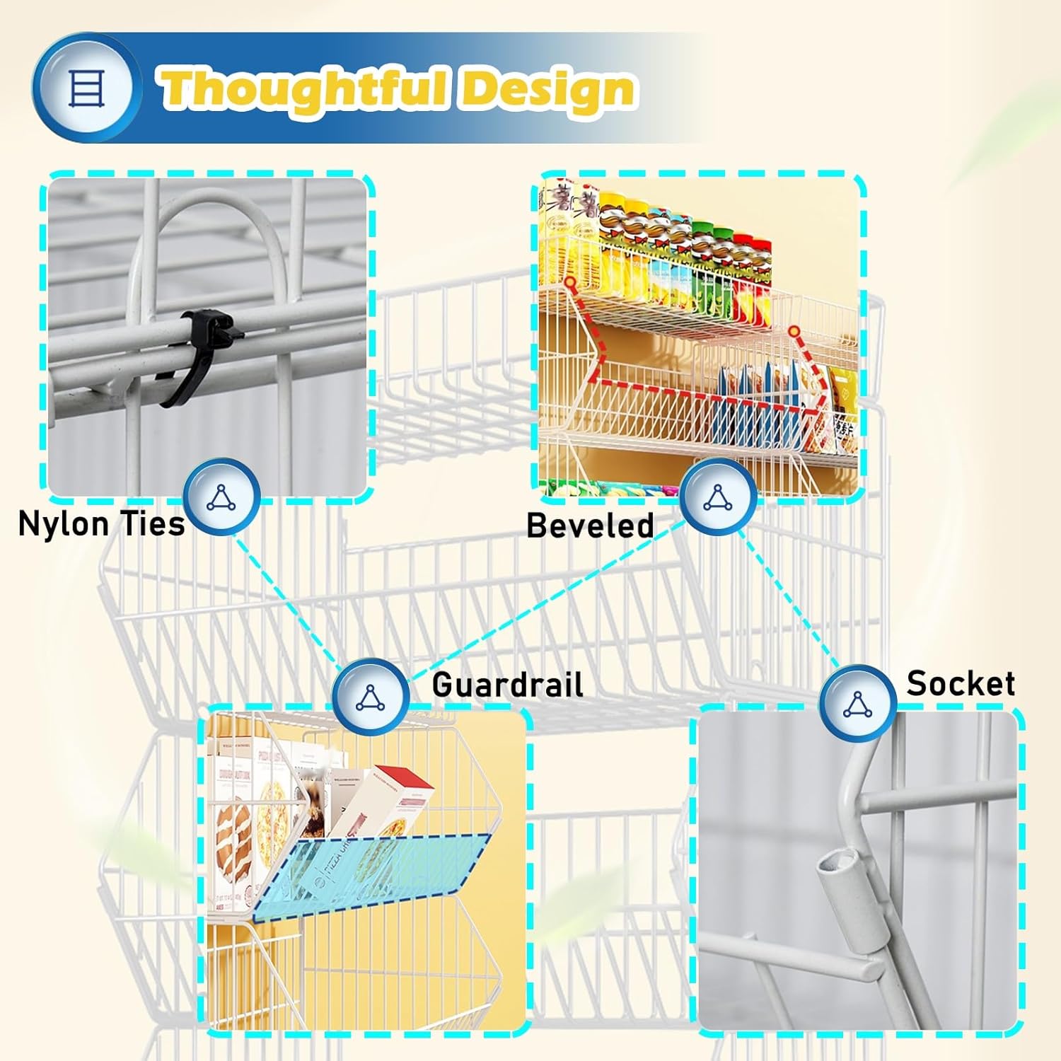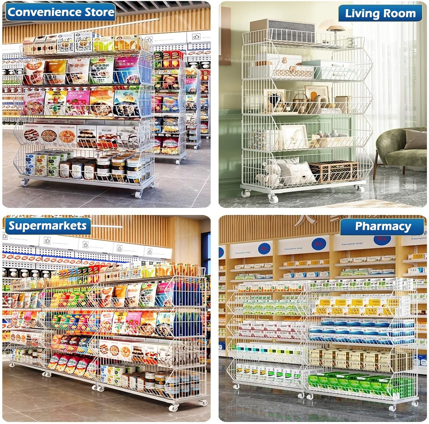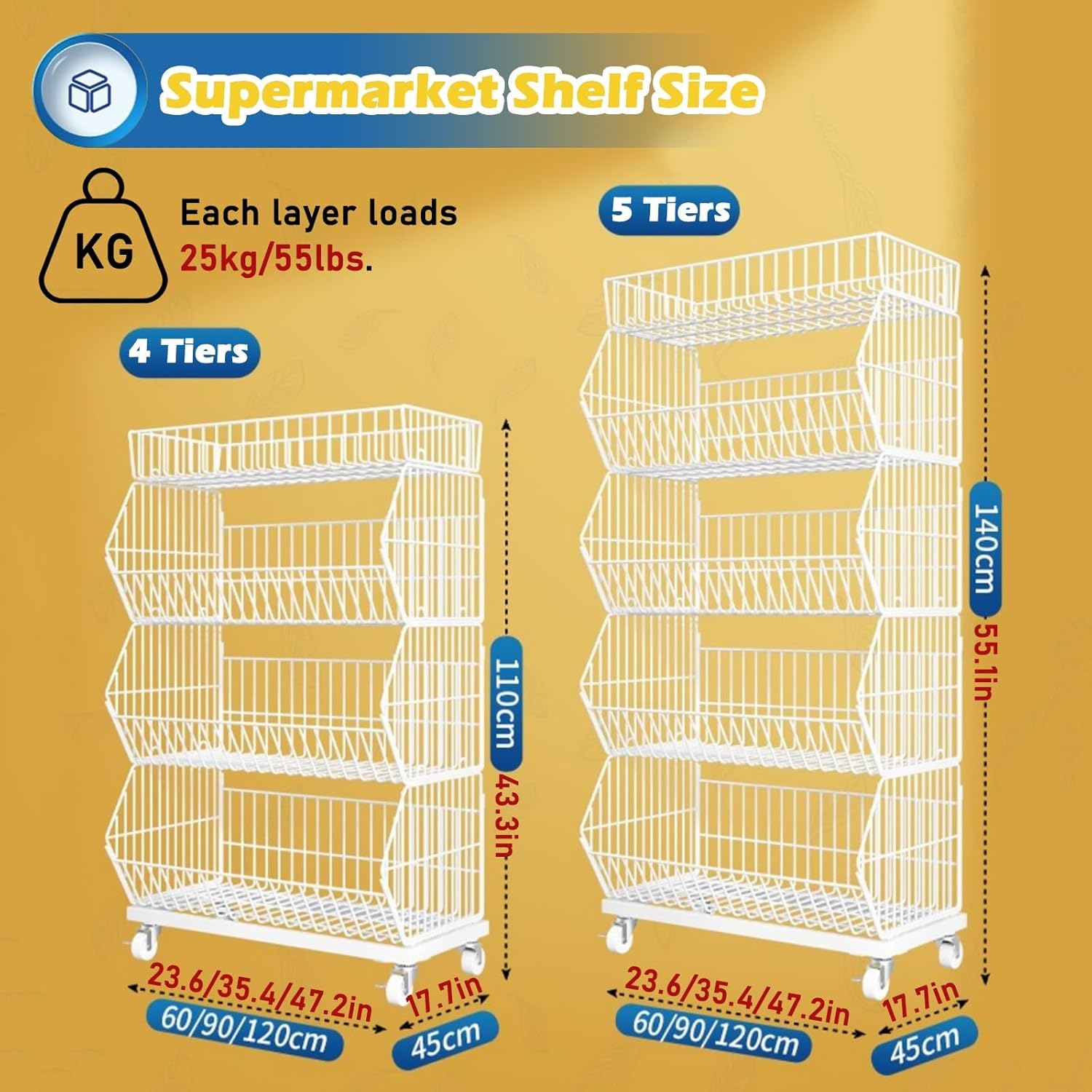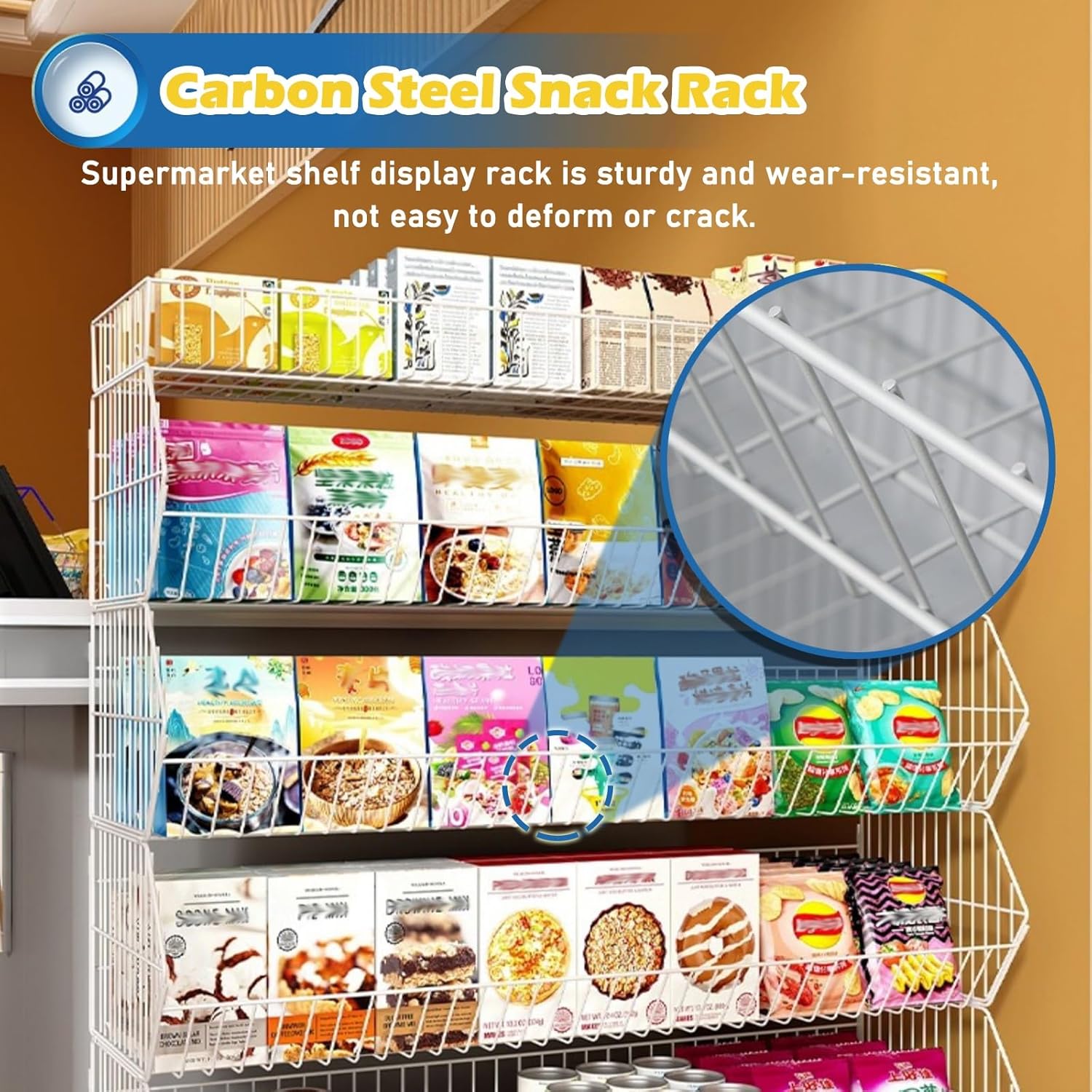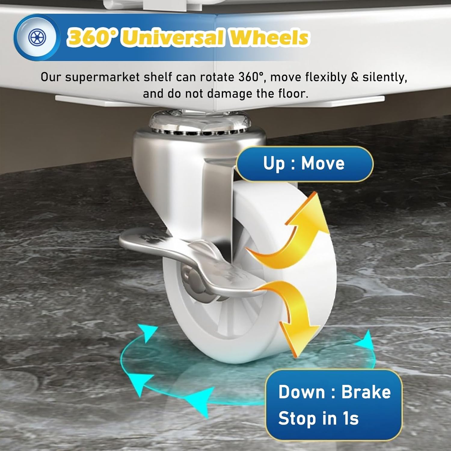 Scaffale per snack in acciaio al carbonio ▶ Realizzato in robusto acciaio al carbonio, il ripiano per scaffali da supermercato è robusto e resistente all'usura, non si deforma o si rompe facilmente. La vernice superficiale è impermeabile, antiruggine e inodore. Ogni strato ha una portata di 25 kg/55 libbre, è stabile e non si capovolge facilmente. Ben organizzato ▶ Con 4/5 ripiani, il nostro espositore per snack è perfetto per uso domestico, commerciale o al dettaglio. Può essere utilizzato in supermercati, farmacie, minimarket, enoteche, negozi di forniture per ufficio, dormitori, soggiorni, camere da letto, cucine, ecc. per conservare snack, frutta, verdura, libri, giocattoli e così via. Ringhiere di sicurezza e design smussato Gli scaffali del supermercato sono dotati di ringhiere laterali, per evitare che gli snack cadano facilmente. L'apertura smussata è progettata per contenere una varietà di articoli e sfruttare al meglio lo spazio. Ruote universali silenziose ▶ 4 ruote universali ti aiutano a spostare facilmente il portafrutta del supermercato dove vuoi. Girevole a 360°, flessibile da spostare, antiscivolo e resistente all'usura, senza danneggiare il pavimento. Installazione rapida ▶ L'installazione del ripiano snack richiede solo pochi minuti, con viti per installare tutti i componenti, rendendolo molto facile da usare. Quando è il momento di pulire o riporre, lo smontaggio è altrettanto semplice.