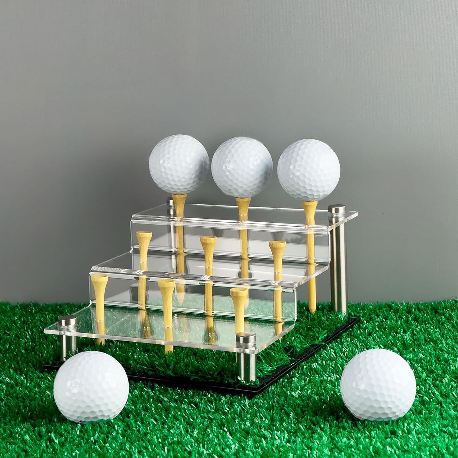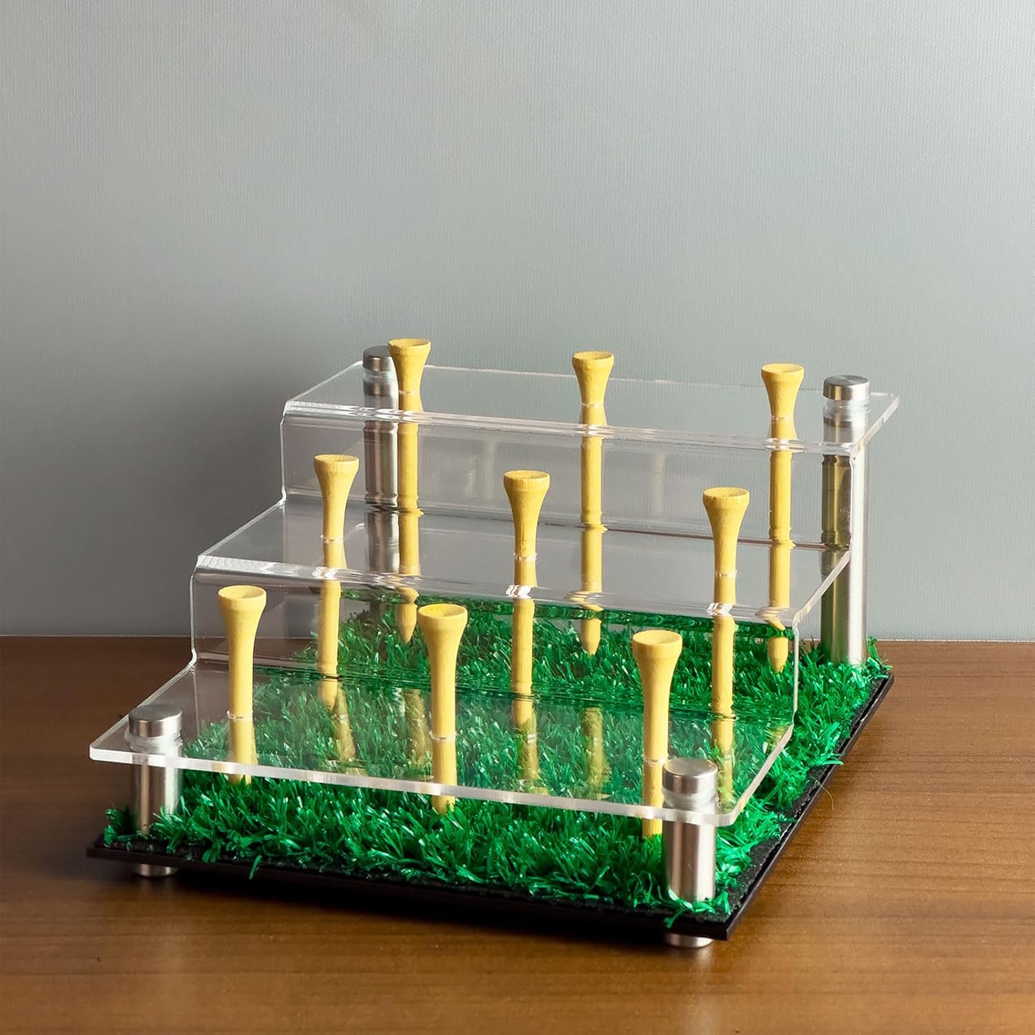 Realizzato in acrilico qualità, questo espositore offre trasparenza e resistenza superiori, essendo più leggero e più resistente alla rottura rispetto vetro, adatto per spostamenti frequenti o presentazioni in vari ambienti come negozi o mostre La caratteristica struttura a gradini organizza e presenta in modo efficiente a 9 palline da golf, massimizzando l'efficienza dello spazio rispetto ai tradizionali supporti piatti, ideale per case, uffici o club per organizzare ordinatamente le collezioni golf Include un manto erboso simulato che un vero campo da golf, esaltandone l'impatto estetico e creando un'area sportiva dedicata agli appassionati negli spazi residenziali Dotato un fondo antiscivolo, display rimane sicuro varie superfici lisce come banconi in vetro o scrivanie in legno, garantendo la protezione dei tuoi oggetti da golf da collezione Semplice da montare senza la necessità attrezzi, questo supporto è comodo e veloce da installare, adatto a coloro che apprezzano la facilità, in particolare in situazioni che richiedono un'installazione rapida