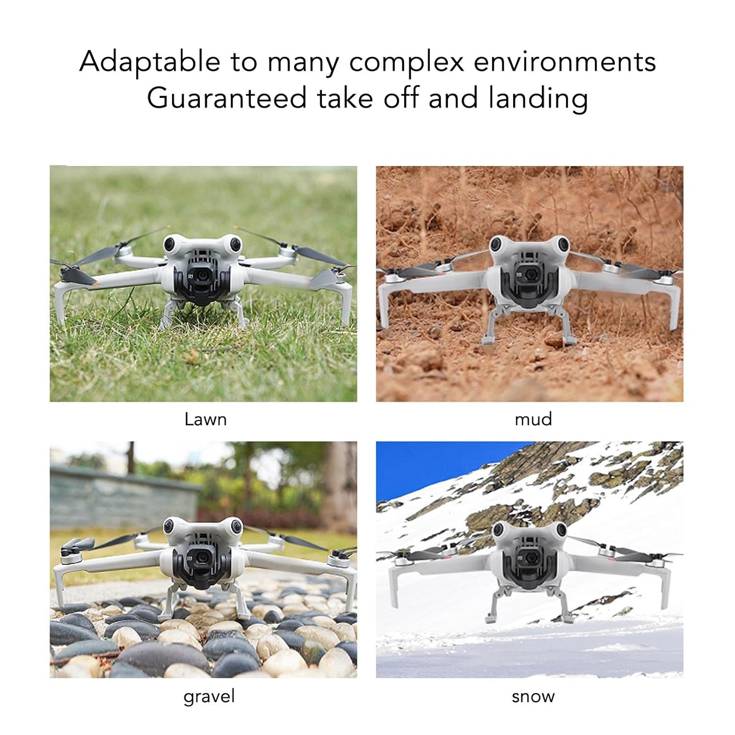 Migliora l'adattabilità: le estensioni degli attrezzi di atterraggio dei droni migliorano efficacemente l'adattabilità del drone all'ambiente a terra durante il decollo e l'atterraggio e proteggi la fusoliera dall'essere graffiata e sporca. Protezione della fusoliera: l'estensione dell'altezza del cambio di atterraggio aumenta l'altezza della fusoliera di 25 mm, che può ancora decollare e atterrare su un terreno irregolare, proteggendo efficacemente la sicurezza della fusoliera. Design leggero Il telaio leggero delle estensioni del carrello di atterraggio drone può trasportare stabilmente la fusoliera e può anche essere sollevato facilmente, influendo difficilmente sul volo della macchina. Smontaggio rapido e installazione: design pieghevole per smontaggio e installazione rapidi, conveniente e pratico. La struttura stabile mantiene l'angolo di inclinazione della macchina originale, l'atterraggio stabile e decolla. Fuselia di bloccaggio, fori riservati: le estensioni del carrello di atterraggio drone bloccano la fusoliera, l'installazione stabile, la parte inferiore dei fori riservati, non copre la funzione.