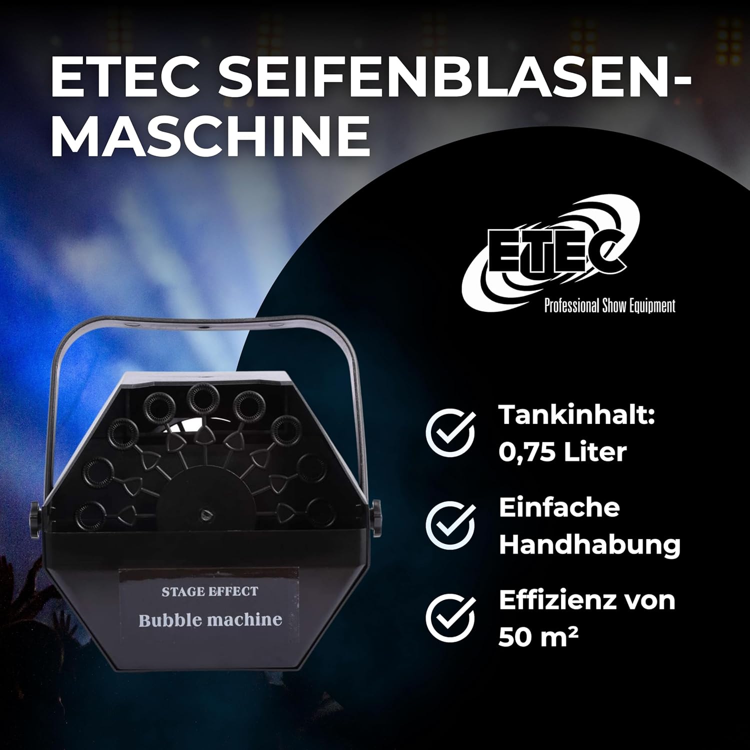 L'ETEC E500 è una macchina per bolle adatta ai non addetti ai lavori ed è adatta per il montaggio a parete e a soffitto. La messa in servizio e l'utilizzo del dispositivo sono estremamente adatti ai principianti. Il serbatoio del liquido può essere riempito e svuotato senza smontare l'apparecchio. Dopo l'accensione, la matrice delle bolle di sapone viene spostata da un motore integrato e le bolle di sapone vengono spinte nella stanza dalla ventola integrata. Questo liquido per bolle a base d'acqua è progettato specificamente per: macchine per bolle di intrattenimento e produce bolle non tossiche. Questo liquido inodore non lascia residui ed è assolutamente innocuo per la salute. Adatto a quasi tutte le macchine per bolle. La tanica contiene 5 litri di liquido per bolle già pronto, che può essere utilizzato immediatamente. Attenzione: tenere lontano dalla portata dei bambini! Non ingerire liquidi! Collegamento elettrico: AC110V-220V 50/60Hz
