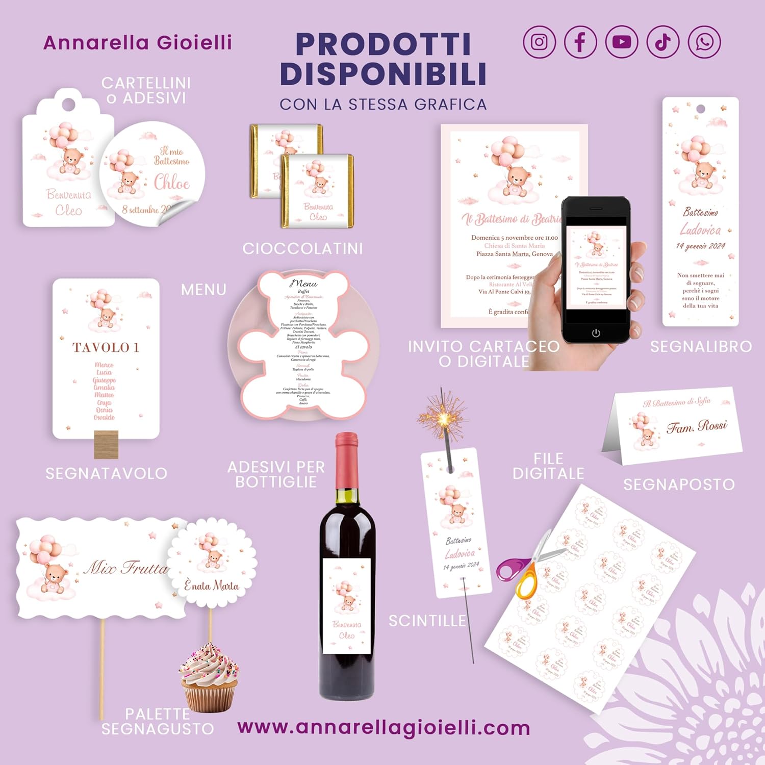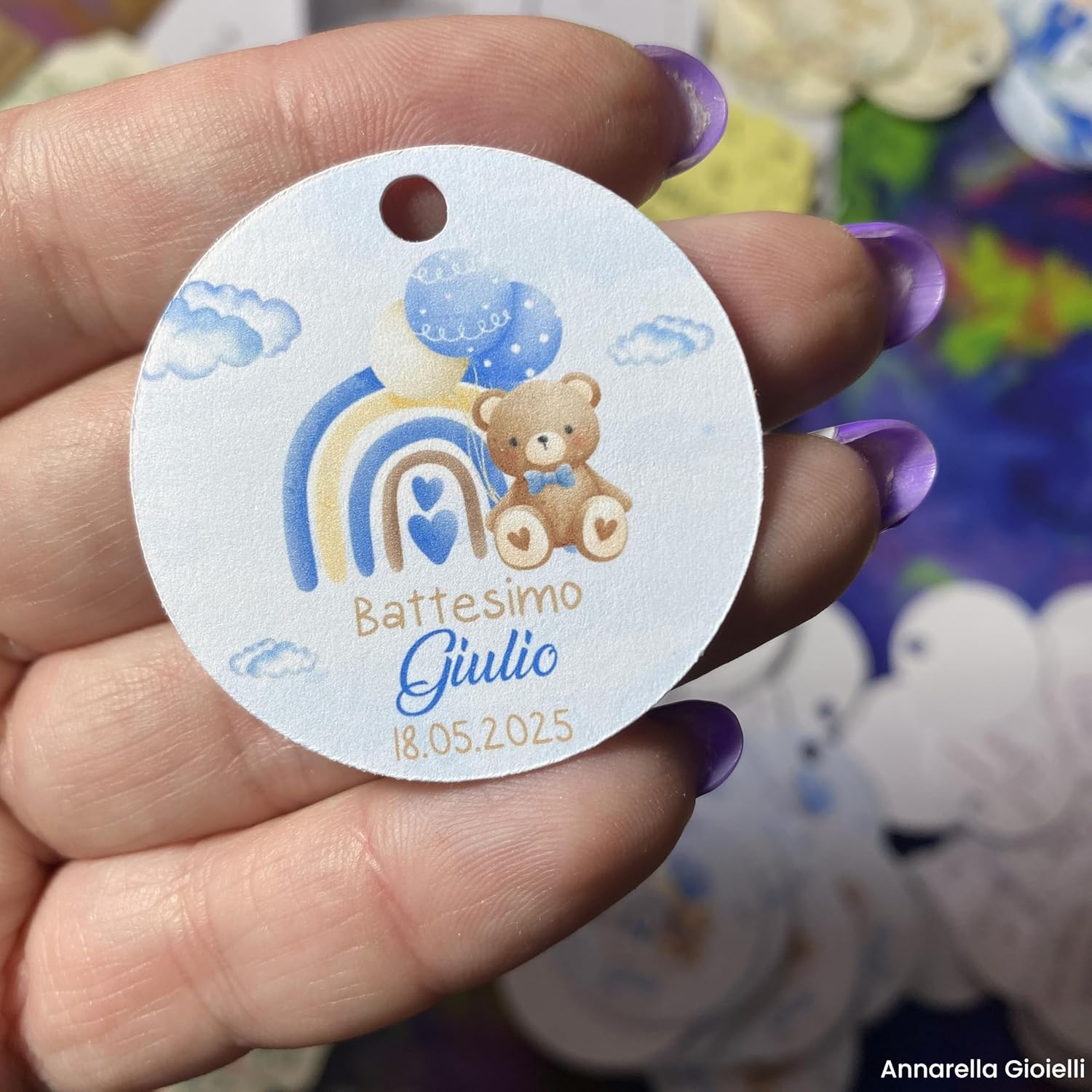 Personalizzati con Nome e Data – Ideali per bomboniere, battesimi e baby shower Design Dolce e Tenero – Illustrazione acquerello con orsetto, palloncini e arcobaleno in versione rosa o azzurra Forme e Dimensioni Disponibili – Tag 30×46 mm, Classico 35×50 mm, Cuore 37×46 mm, Nuvola 30×46 mm, Quadrato 30/40/50 mm, Tondo Ø30/40/50 mm, Fiore Ø40/50 mm Stampa Professionale – Cartoncino 200 g/m² per cartellini o carta adesiva 80 g/m² per adesivi, colori vivaci e resistenti Come Ordinare – Inserisci nome e data nel campo personalizzazioni → scegli colore e quantità (10 pezzi) → aggiungi al carrello e completa l’acquisto