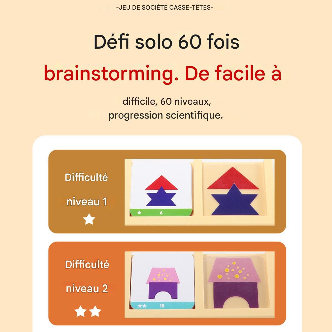 Kit architettonico educativo: consente di sperimentare con blocchi 3D per affinare il loro ragionamento spaziale e affrontare sfide interattive di riconoscimento delle forme. 4. Design educativo evolutivo: progettato con un sistema di difficoltà graduata, questo tangram combina puzzle di sviluppo cognitivo e blocchi evolutivi. Crea opportunità di apprendimento graduale per il risveglio spaziale e la risoluzione dei problemi, accompagnando naturalmente la crescita intellettuale del bambino. Complicità in famiglia: apprendimento e divertimento per stringere i legami emotivi, ideale per momenti di qualità in famiglia attraverso esercizi di costruzione creativa condivisa. Sicurezza ed ecologia: questi tangrammi in legno offrono bordi perfettamente lisci e materiali ecologici per la massima sicurezza. Certificati per la sicurezza, sono un'opzione affidabile per l'apprendimento attraverso il gioco, garantendo al contempo la protezione dei piccoli utenti. Stimola la riflessione: Set di puzzle touch progettato per affinare l'analisi critica e sviluppare le capacità di risoluzione dei problemi, incoraggiando l'apprendimento interattivo a blocchi per
