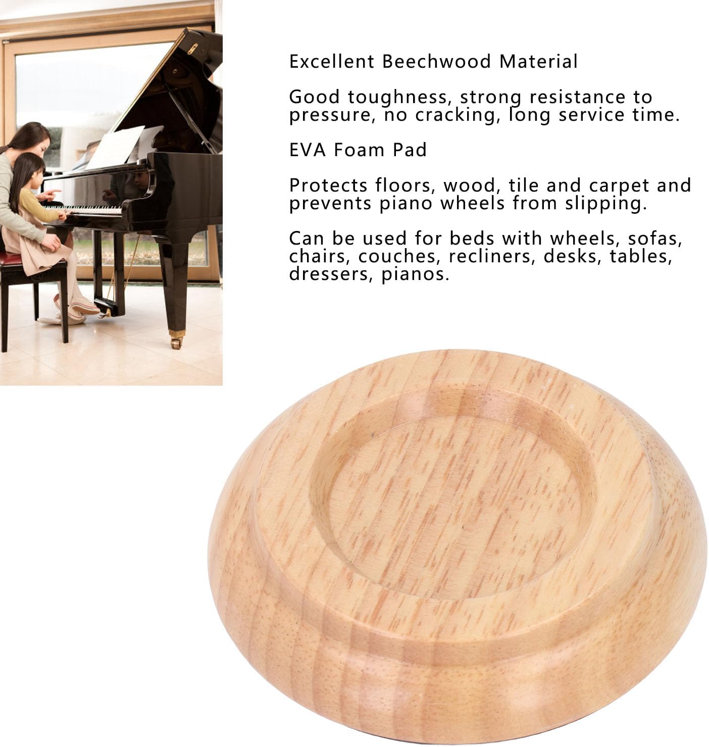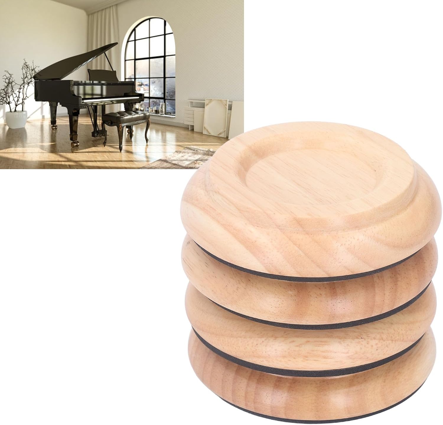 [FACILE INSTALLAZIONE]: con un processo di installazione, queste protezioni per il pavimento delle gambe del pianoforte sono facili da usare e non richiedono attrezzi per imbottirle sotto gli strumenti musicali o i mobili. [DESIGN MULTIFUNZIONALE]: il cuscinetto in feltro spesso nella parte inferiore si adatta sotto le gambe del pianoforte su pavimenti e tappeti, fornendo isolamento acustico e assorbimento degli urti per prestazioni migliori. [AMPIA APPLICAZIONE]: I nostri protettori per pavimenti sono adatti a una varietà di mobili con ruote come letti, divani, sedie e pianoforti, fornendo una protezione versatile per i tuoi pavimenti. [PAD IN SCHIUMA EVA]: Con i cuscinetti in schiuma EVA, queste protezioni per il pavimento impediscono lo scivolamento su varie superfici come legno, piastrelle e tappeti, garantendo che le ruote del tuo pianoforte rimangano al sicuro. [MATERIALE IN LEGNO DI FAGGIO]: le nostre coppe per pianoforte sono realizzate in resistente legno di faggio, garantendo robustezza, resistenza all'usura e una lunga durata.