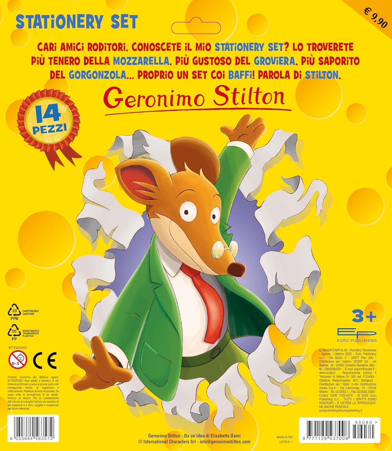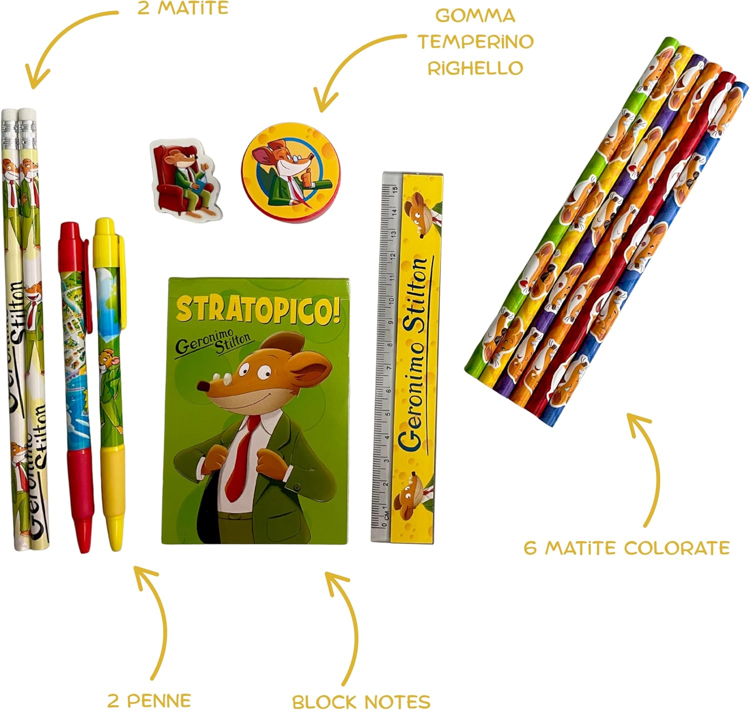 🧀 LICENZA UFFICIALE GERONIMO STILTON: Il set perfetto per tutti i fan di Geronimo Stilton. Porta in classe l’energia e la simpatia del topo giornalista più famoso dell’Isola dei Topi. 100% ufficiale, ricco di dettagli colorati ispirati alle sue avventure stratopiche. ✏️ SET COMPLETO DA 14 PEZZI: Il kit include: 2 matite, 6 matite colorate, 2 penne, un righello, una gomma, un temperino e un block notes – tutto ciò che serve per la scuola o il tempo libero. Ideale per sentirsi parte della squadra Stilton! 🎨 DESIGN TOPESCO E ORIGINALE: Ogni elemento è decorato con le grafiche di Geronimo Stilton, perfetto per portare un tocco di allegria nello zaino di ogni giovane esploratore della conoscenza. 🎁 UN REGALO STRATOPICO: Rientro a scuola? Rientro in ufficio? In stile con i nostri set cancelleria. Sono ottime idee regalo per tutti sia grandi che piccini! 😊Perfetto per i lettori e lettrici che seguono le avventure di Geronimo Stilton. 🛒 IN EDICOLA E GRANDE DISTRIBUZIONE: lo trovate al prezzo di 7,90€. 🛍️ EURO PUBLISHING: Visita il nostro Amazon Store e scopri tutti i prodotti 😊