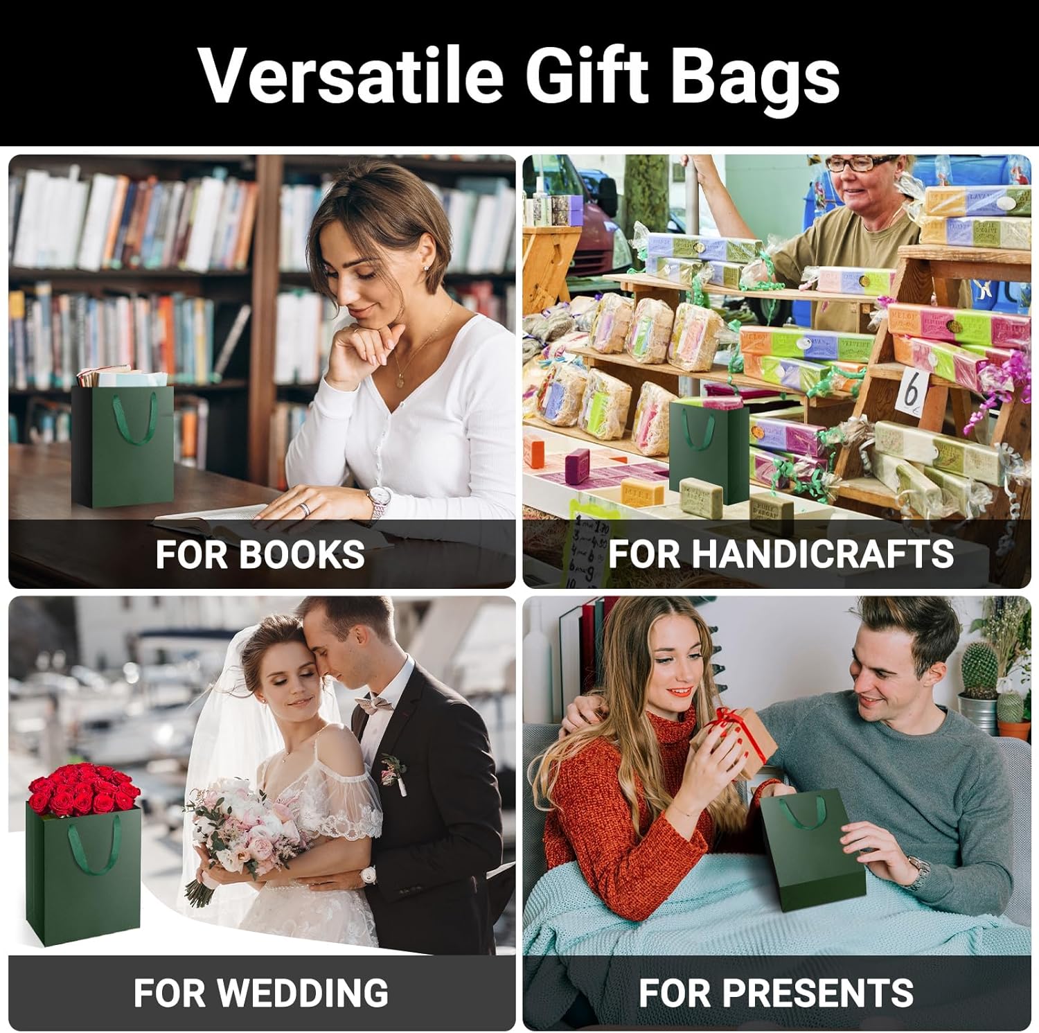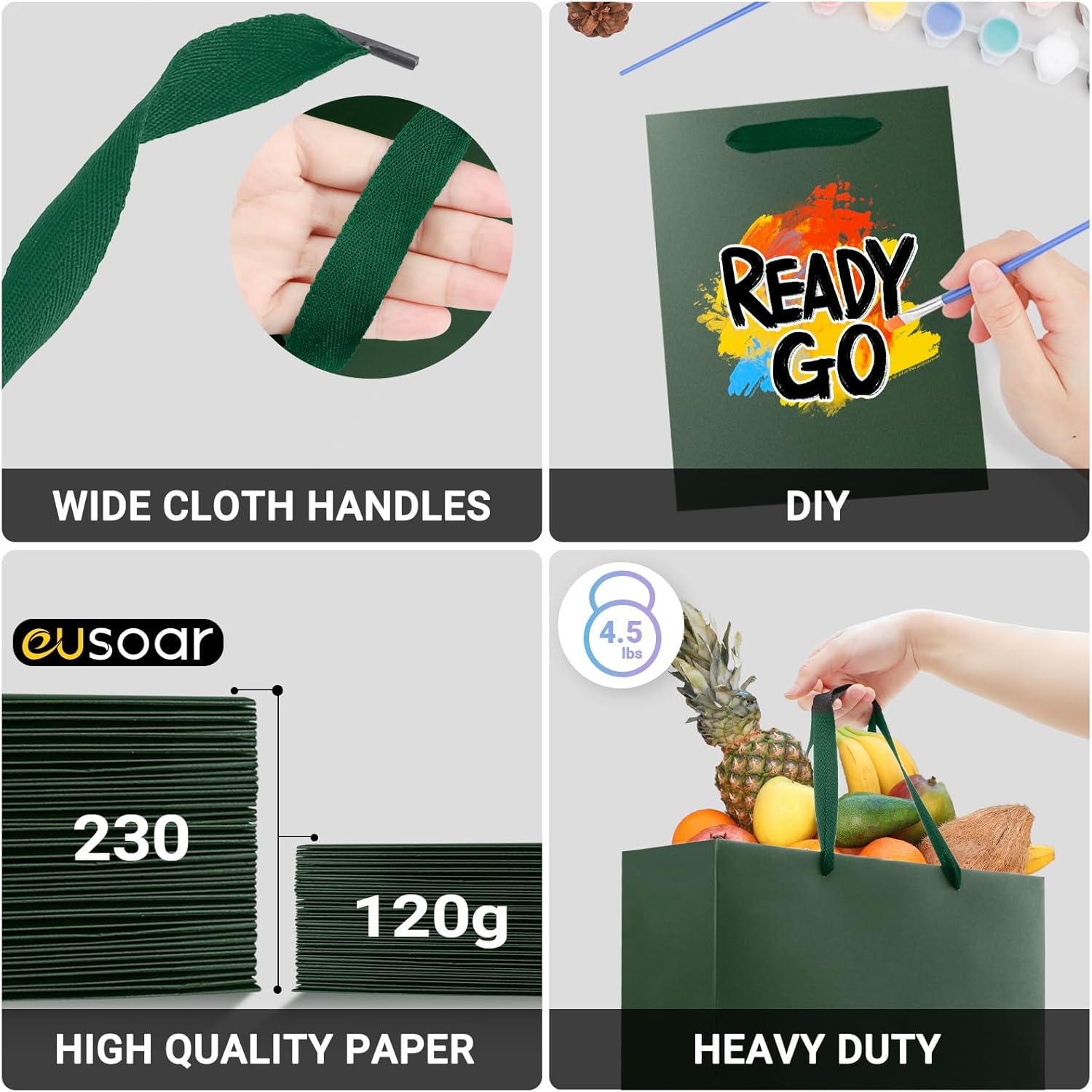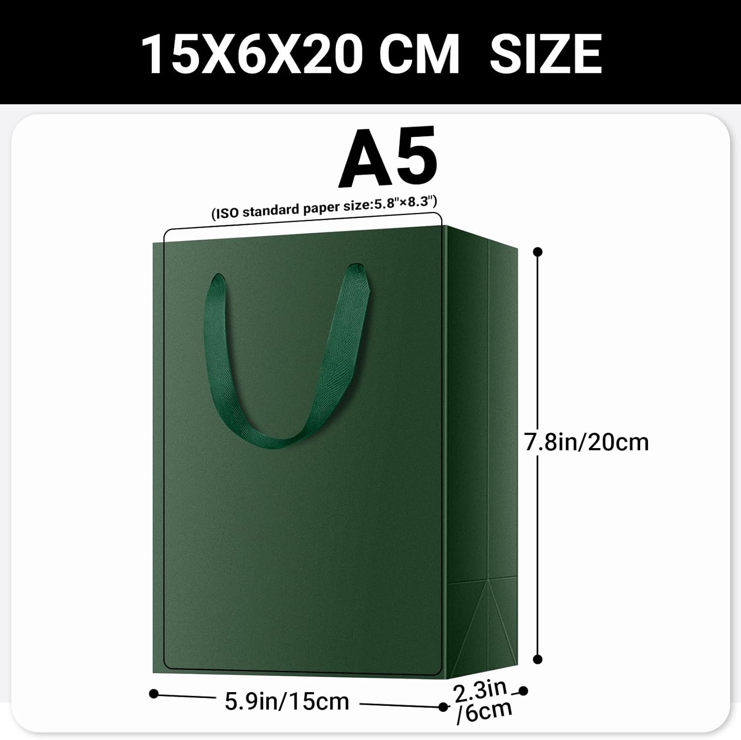 Piccolo sacchetto regalo --- Questo set da 10 sacchetti regalo verde scuro realizzati in carta kraft spessa colpisce per la sua eccezionale stabilità e resistenza allo strappo. (Dimensioni: S 15x6x20 cm) Pratico set di sacchetti regalo --- La lavorazione è di alta qualità, cosa che si nota particolarmente nelle maniglie dal design accattivante. Ideale per confezioni regalo come compleanno, festa del papà, laurea, matrimonio, Capodanno, Natale. Sacchetti regalo molto eleganti --- Il loro design sottile ed elegante rende questi sacchetti la scelta perfetta per confezionare regali con stile senza distrarre dal contenuto. Robusto materiale in carta kraft da 230 g/m² --- La carta dei sacchetti è molto stabile, quasi cartone, in modo che i sacchetti siano molto stabili quando sono aperti. Anche i manici in tessuto sembrano di altissima qualità, in modo che anche i regali più pesanti possano essere trasportati senza problemi. Fai da te come desideri --- Grazie alla superficie blu opaca e ai manici in tessuto, i sacchetti regalo sembrano molto eleganti. Posso anche immaginare che possano essere personalizzati molto facilmente se necessario. Non vedrai l'ora di incartare il tuo prossimo regalo!