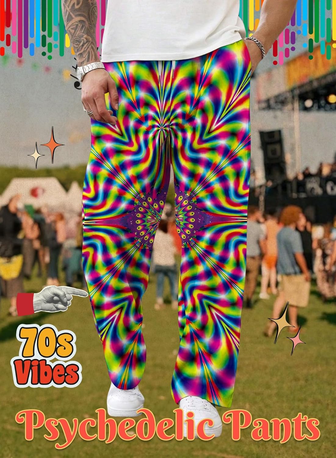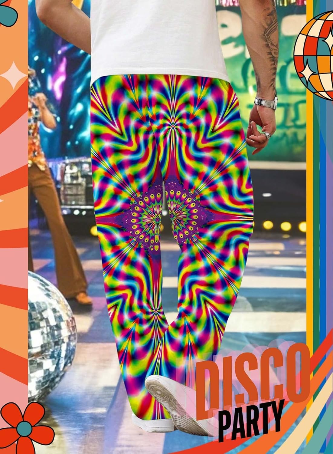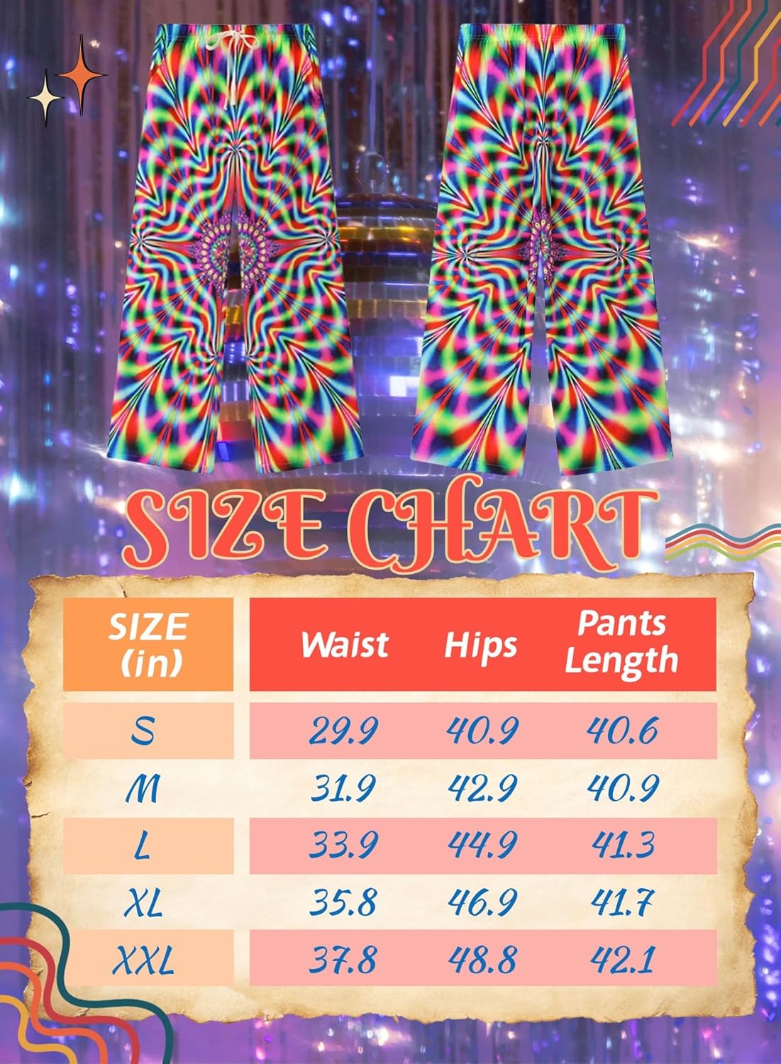 This trial pair of fancy dress psychedelic trousers look groovy! I am about a 32inch waist and just under six feet tall and these are a comfortable fit for a bit of fancy dress fun. They are draw string so early adjust to smaller or bigger waist sizes. The cheap and cheerful material is quite thin and has a "slippy" texture and will get sweaty wearing for a while. Obviously it needs s a matching top to complete the look. An easy bit of dress up fun!