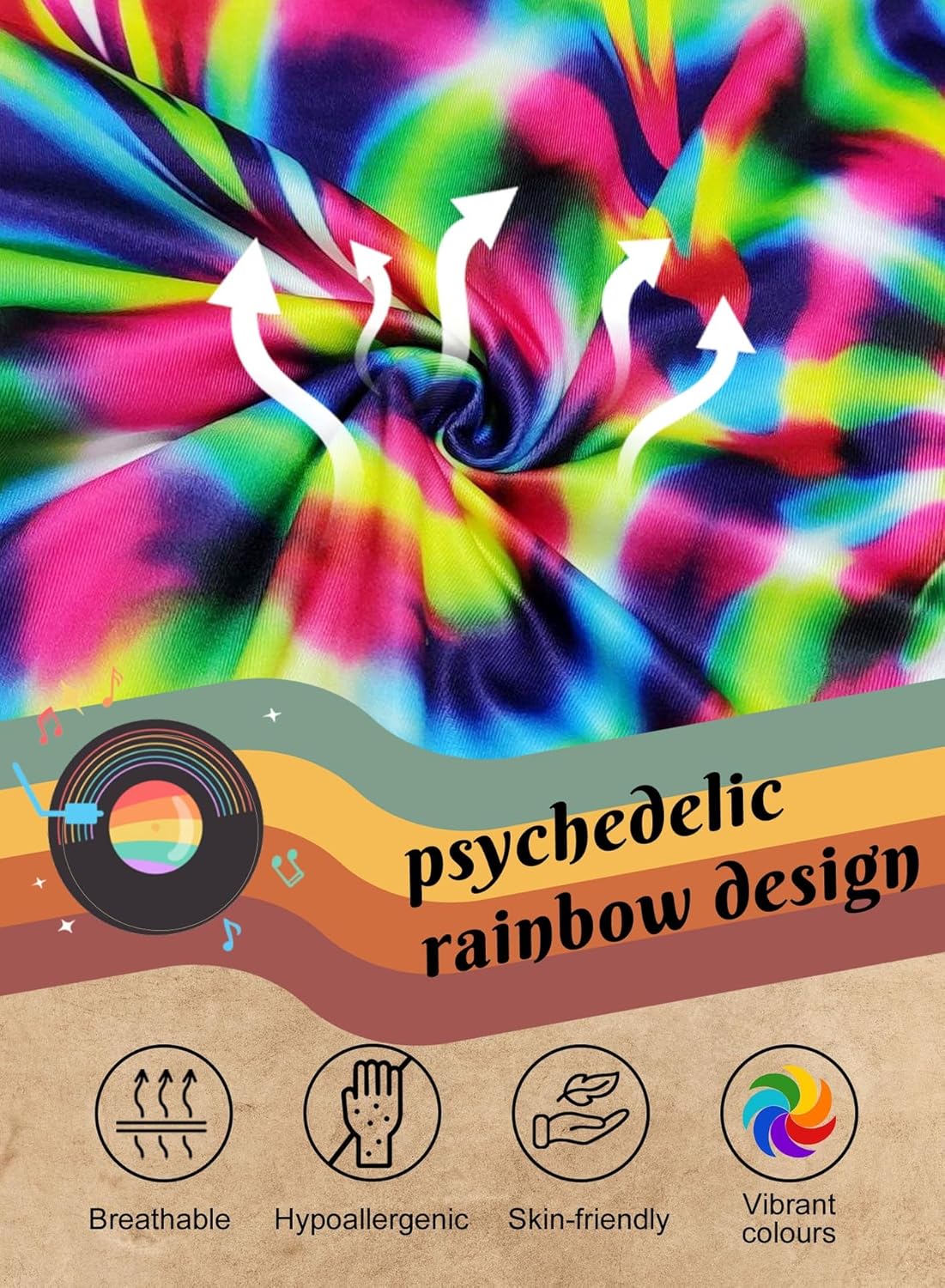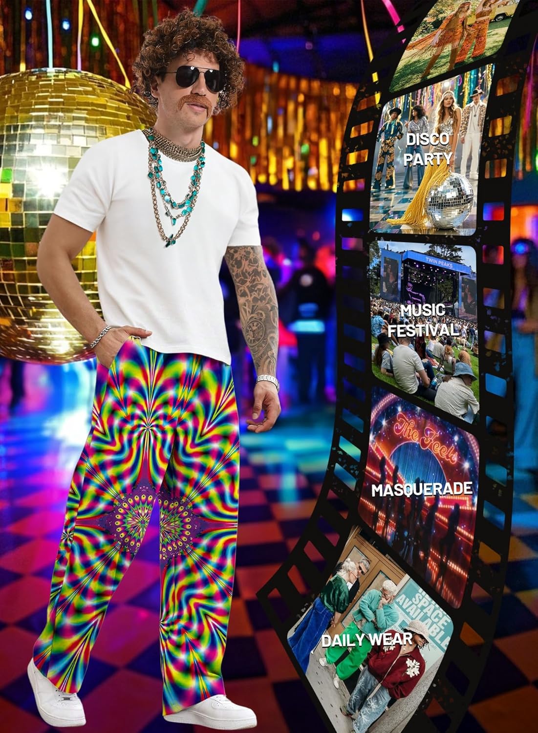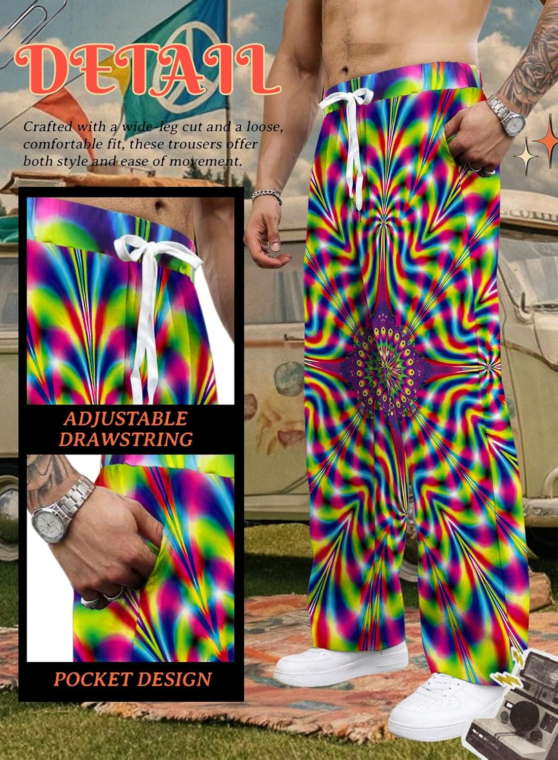 This trial pair of fancy dress psychedelic trousers look groovy! I am about a 32inch waist and just under six feet tall and these are a comfortable fit for a bit of fancy dress fun. They are draw string so early adjust to smaller or bigger waist sizes. The cheap and cheerful material is quite thin and has a "slippy" texture and will get sweaty wearing for a while. Obviously it needs s a matching top to complete the look. An easy bit of dress up fun!