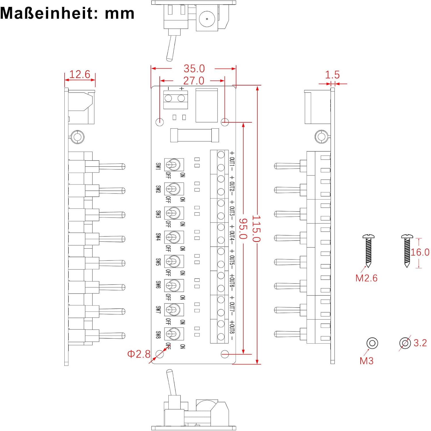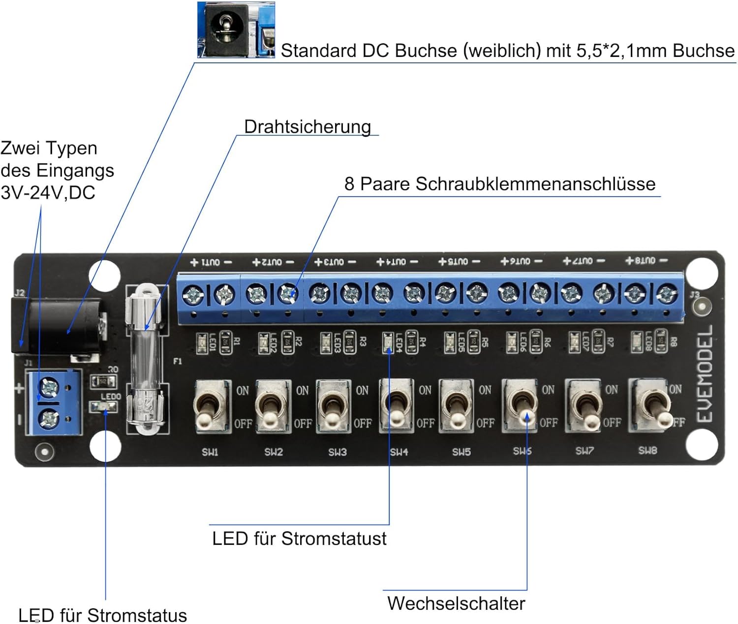 1 distributore di corrente con 4 viti e 4 distanziatori. Ingresso alimentazione: presa DC standard 3-24 V DC Con LED per lo stato di funzionamento. Prodotto di alta qualità.