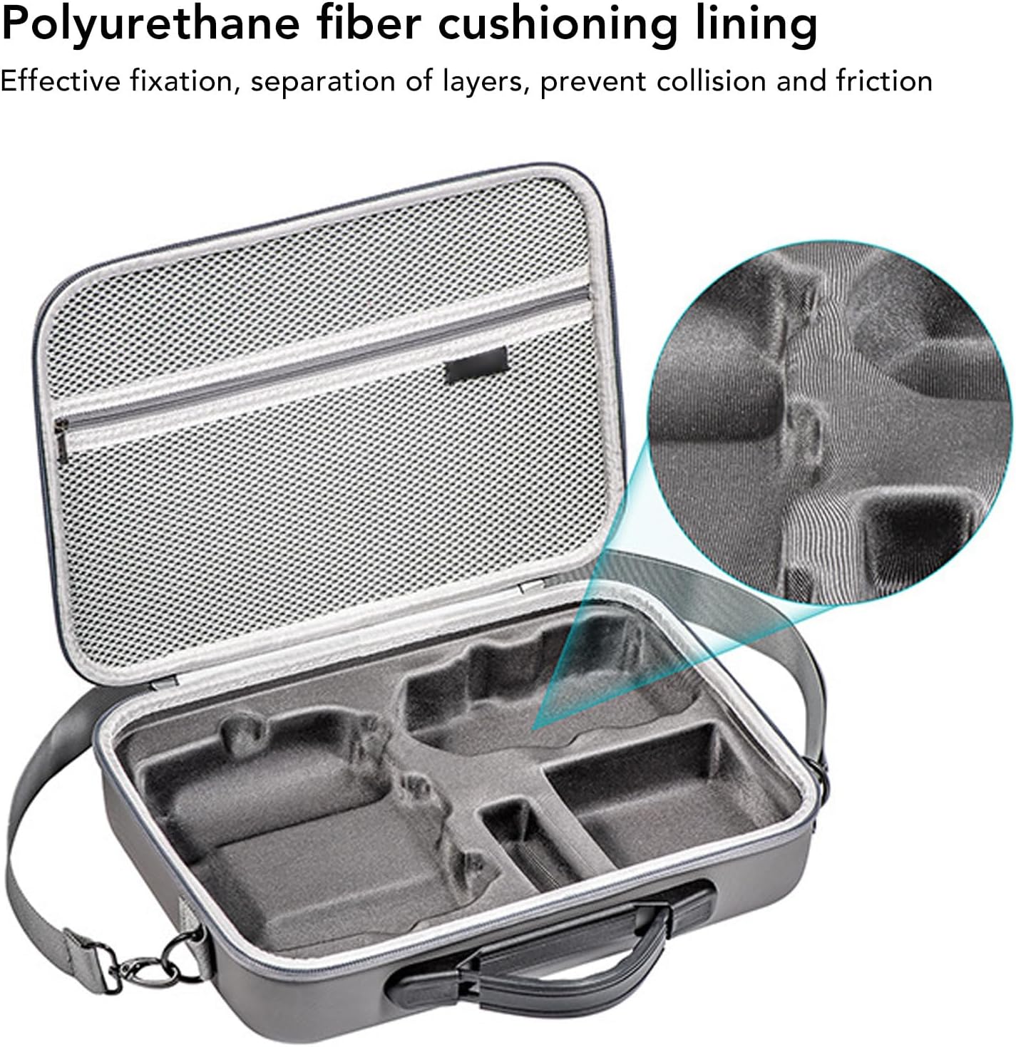 Spazio completo per gli accessori: questa custodia per il trasporto è progettata specificamente per ospitare un set completo di accessori per Mini 4 Pro. Con scomparti e partizioni separate, massimizza l'utilizzo dello spazio e soddisfa tutte le tue esigenze di viaggio. Protezione efficace: questa custodia per il trasporto presenta un trattamento superficiale che protegge schizzi, graffi e usura. Le gocce di pioggia scivolano via velocemente senza penetrare, proteggendo efficacemente gli oggetti all'interno dall'umidità. Ammortizzazione adeguata: il rivestimento ammortizzante all'interno della custodia fornisce un fissaggio efficace, prevenendo collisioni e attriti. Offre una forte resistenza alla compressione, garantendo che il tuo dispositivo sia ben protetto dagli urti e dalle cadute quotidiane. Maniglia per il carico: dotata di una maniglia resistente all'usura ed estensibile, questa custodia per il trasporto può resistere alla pressione e alla di trazione dell'uso quotidiano. Ha una grande capacità di carico ed è progettato per durare, garantendo longevità e prestazioni affidabili. Con tracolla: la tracolla allargata e ispessita è progettata per adattarsi al contorno del corpo, riducendo il carico e offrendo il massimo comfort durante il trasporto. Permette un trasporto senza sforzo, rendendo la tua esperienza di viaggio più piacevole.