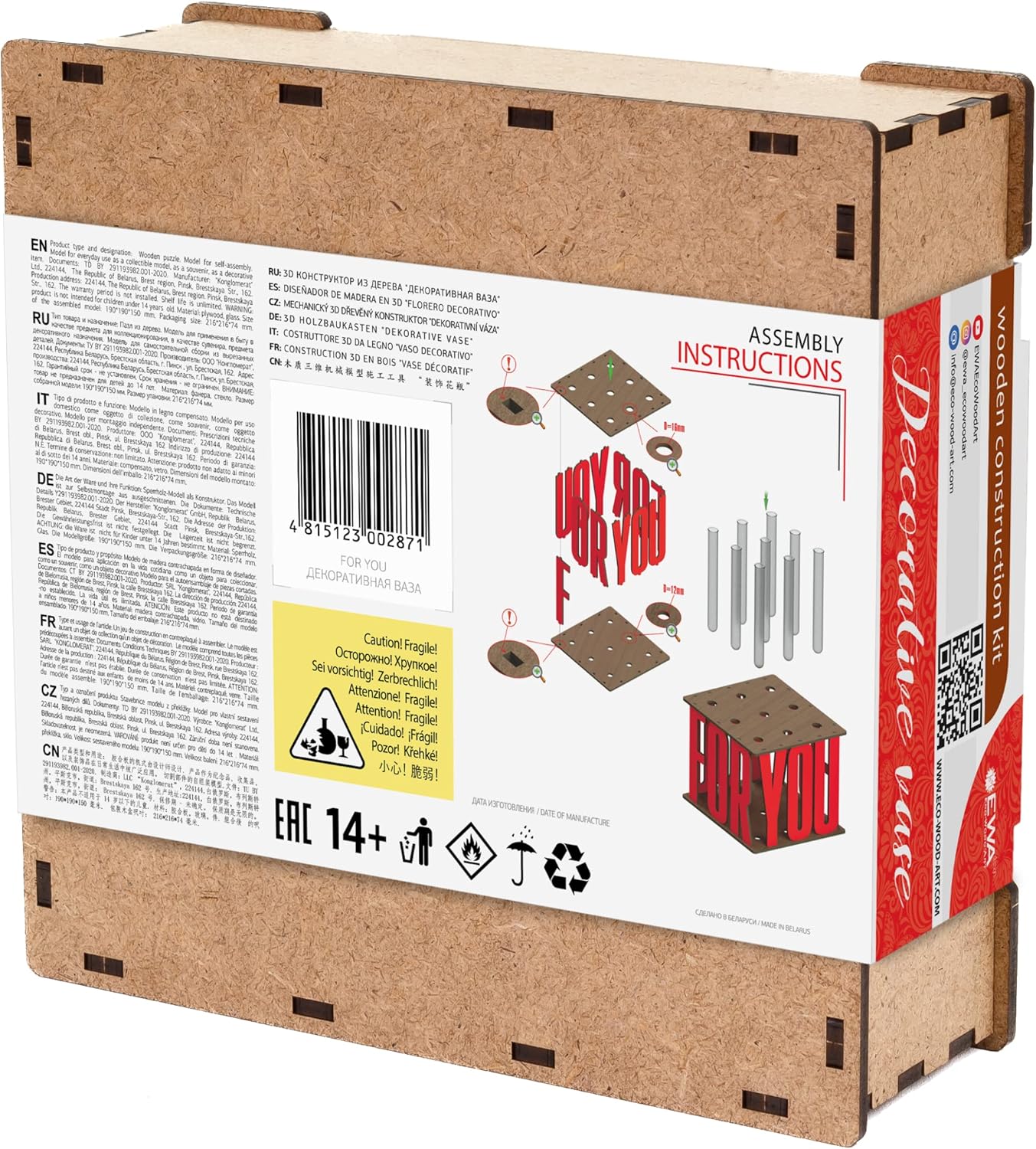 Kit di costruzione 3D per l'autoassemblaggio di supporti per piccole fiale-vasi per fiori con facce sotto forma di iscrizioni di congratulazioni Con l'aiuto di istruzioni di costruzione molto dettagliate, tutta la famiglia sarà in grado di montare questo interessante modello, composto da 12 pezzi Il modello è realizzato in compensato di alta qualità e non richiede colla Il modello assemblato ha le seguenti dimensioni: 190*190*150 mm