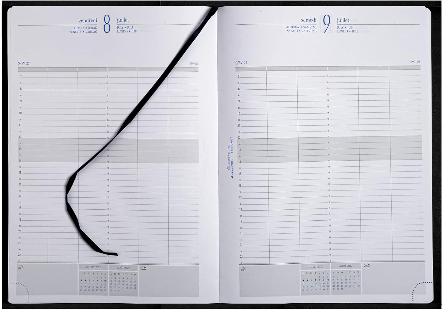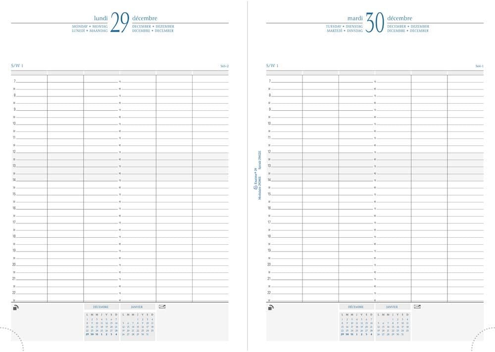 Destinato ai professionisti, per gestire contemporaneamente la programmazione da 3 a 6 utenti. Fascia oraria ampia. Il giorno su 1 pagina, griglia verticale, appuntamento ogni 1/4 d'ora dalle 7:00 alle 22:45, multilingue. Rivestimento sfoderabile in plastica liscia, finiture curate (cucitura a sella). Rilegatura in brossura per una maggiore resistenza. I +: - stampa in blu e grigio, su carta Clairefontaine bianca, riconosciuta per la sua qualità e per consentire una scrittura morbida e fluida, - bordo naturale, - angoli staccabili, per un rapido accesso alla settimana corrente, - segnalibro, - elenco telefonico rimovibile. Certificazioni: PEFC (fibre di carta provenienti da foreste gestite in modo sostenibile) - Imprimvert (stampa ecologica). Nato nei Vosgi, prodotto in Francia e pensato per voi!