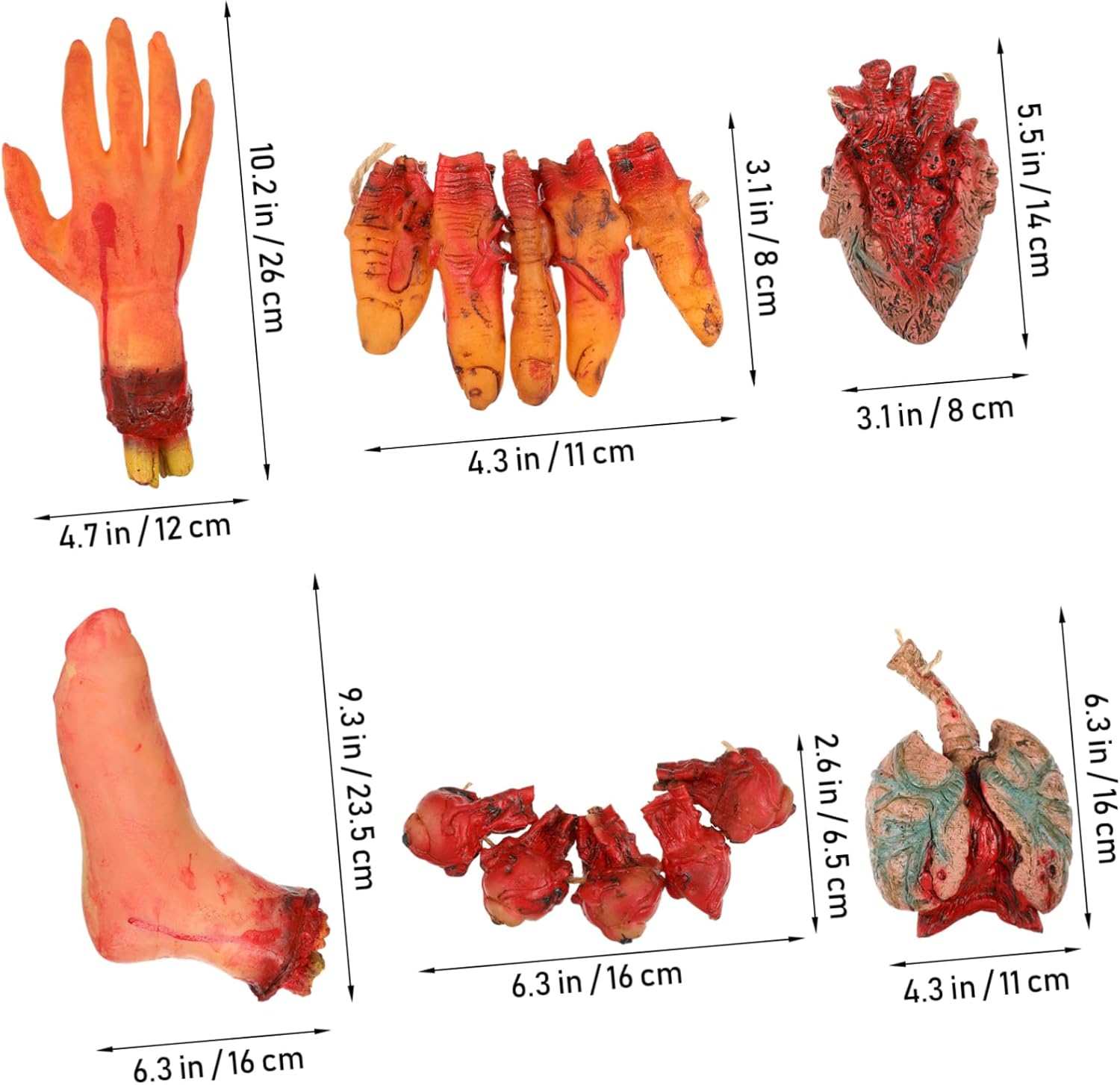 Il pacchetto include: Riceverai 1 set di oggetti di scena insanguinati di Halloween (1x mano finta / 1x piede falso / 1x cuore falso / 1x dito falso / 1x occhi finti / 1x polmone falso) in totale 6 pezzi, un oggetto decorativo perfetto per Halloween. Materiale: queste parti finte del corpo sono realizzate in lattice di alta qualità, imbottite con cotone PP ecologico, morbide al tatto e sembrano vera pelle. Design realistico: si tratta di una varietà di classici oggetti di scena horror, organi umani finti insanguinati e design spaventoso di mani e piedi, ideali per allestire scene come case infestate, cimiteri, feste di Halloween, ecc. Compatto e facile da riporre per un uso ripetuto. Facile da montare: i finti polmoni/cuore/occhi/dita sono dotati di una corda insanguinata per appenderli. Facile da appendere al muro o decorare il tuo striscione di Halloween. Ampia occasione: decorazioni insanguinate e spaventose con parti del corpo finte non sono adatte solo per Halloween, ma anche per oggetti di scena, oggetti di scena per il primo di aprile e altre occasioni. Te ne offrono uno bello per fare scherzi con i tuoi amici o da posizionare da qualche parte per spaventare qualcuno.