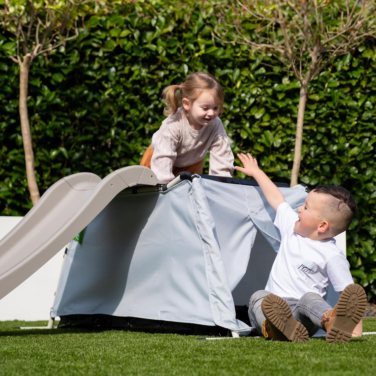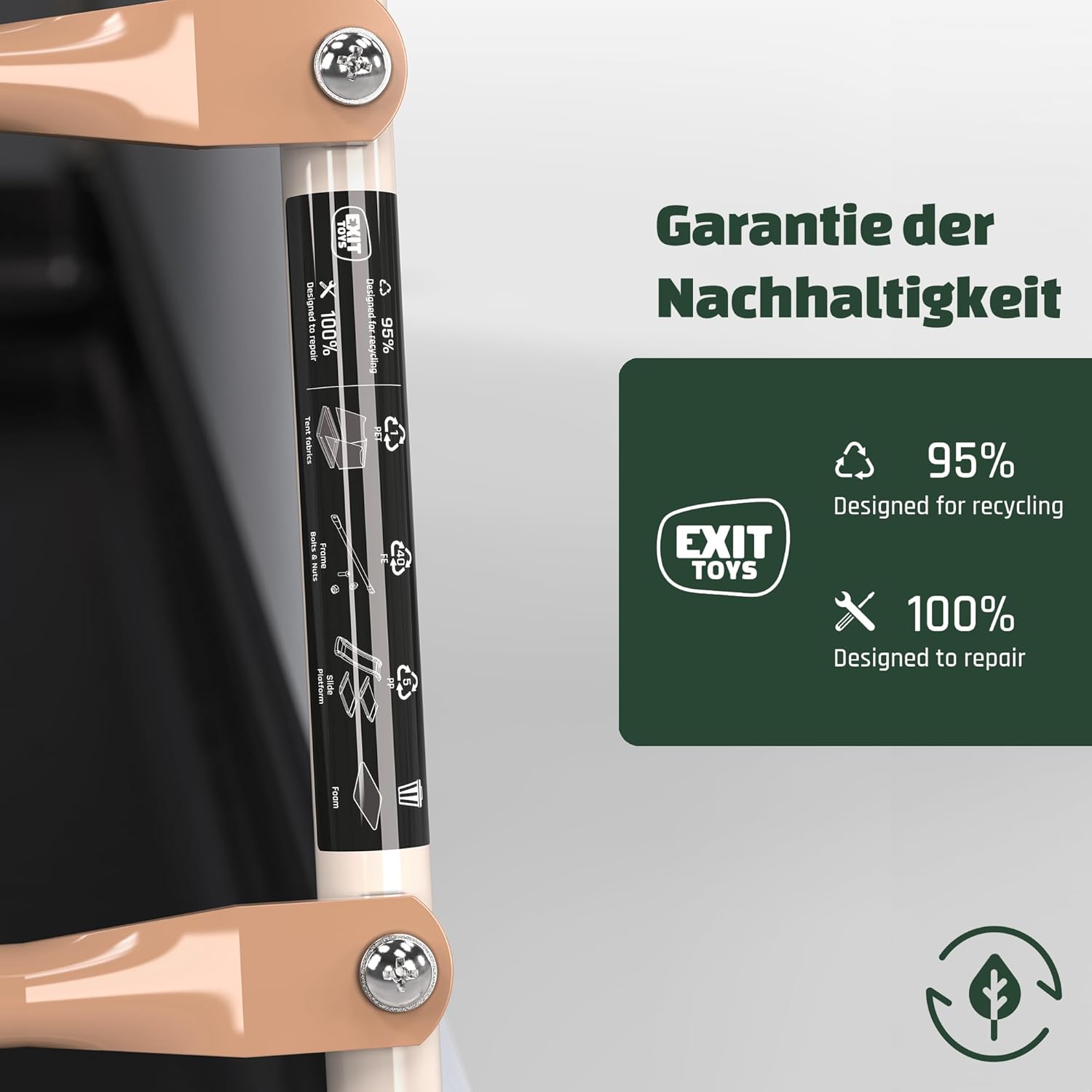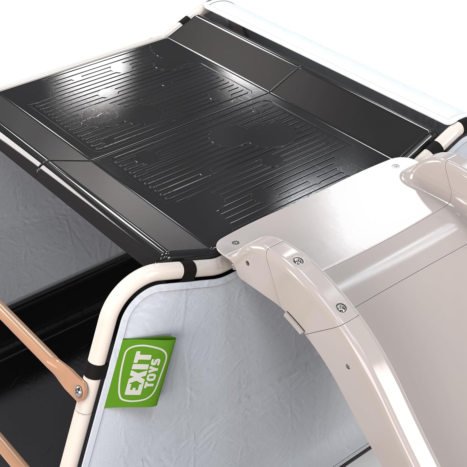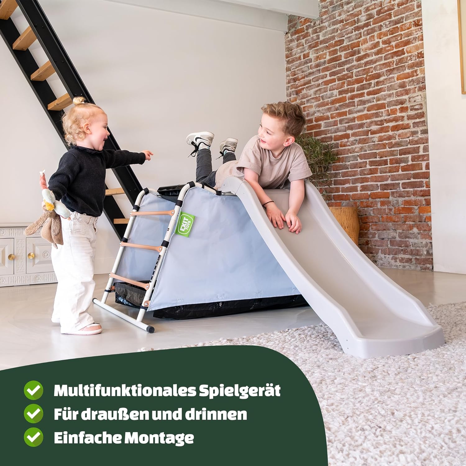 EXIT My First Multiplay è dotato di scivolo e tenda, ideali per consentire a più bambini di arrampicarsi, scivolare, giocare e riporre i giocattoli contemporaneamente. Il multiplay con scivolo e tenda da gioco è compatto e leggero e può quindi essere facilmente spostato. Il multiplay può essere utilizzato sia all'interno che all'esterno. La tenda da gioco ha uno strato di schiuma sul soffitto che protegge dagli urti. La tenda da gioco con scivolo per bambini piccoli ha i seguenti certificati: TÜV, CE, EN 71. Questa tenda multiplay ha un robusto telaio in acciaio. Il telaio è zincato a caldo e verniciato a polvere, in modo che la ruggine non abbia alcuna possibilità e lo scivolo resista a tutte le condizioni atmosferiche. I bambini dai 2 anni in su possono giocare con EXIT Toys My First Multiplay.