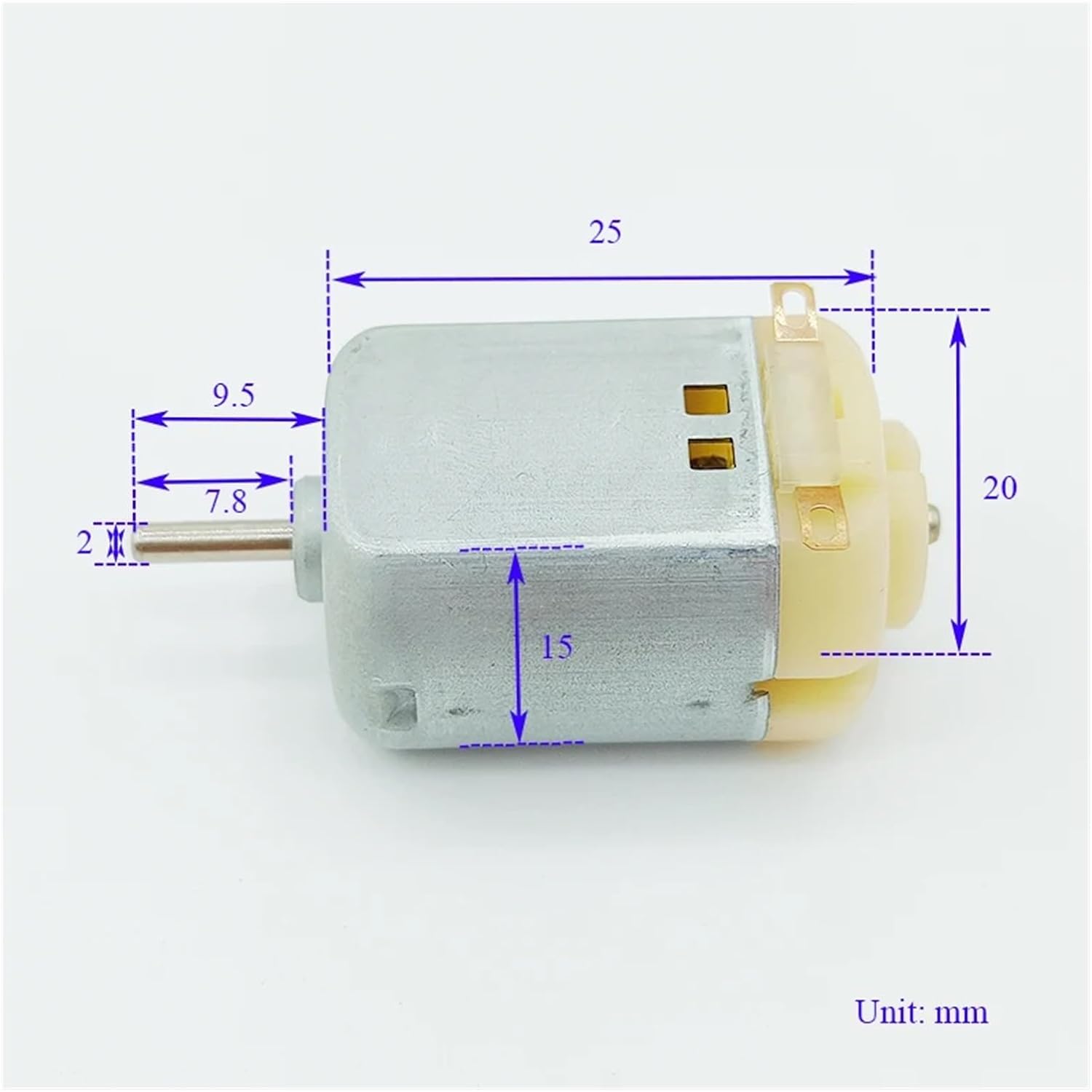 RRBXXUYN Specification: 2. Model: FA-130RB-18100 3. electronic starter specification: 25mm*20mm*15mm (length * width * height) 4. Shaft diameter: 2mm / Shaft length: 7.8mm 5. Weight: 17g 6. Voltage range: DC 1.5V-5.0V 7. Test data: Voltage: DC1.5V No-load current: 120mA No-load speed: 6350RPM Voltage: DC3.0V No-load current: 150mA No-load speed: 12300RPM Voltage: DC3.7V No-load current: 170mA No-load speed: 14000RPM Voltage: DC5.0V No-load current: 200mA No-load speed: 16800RPM