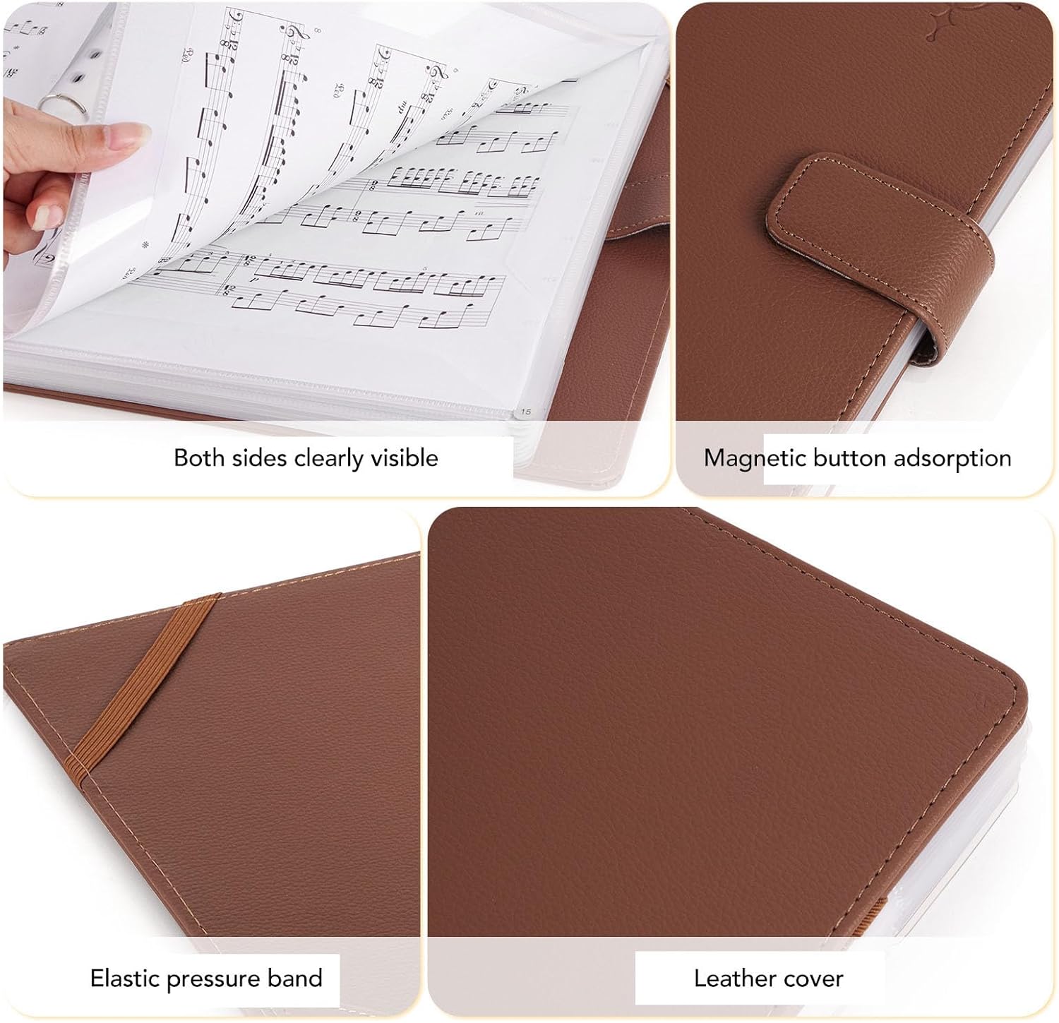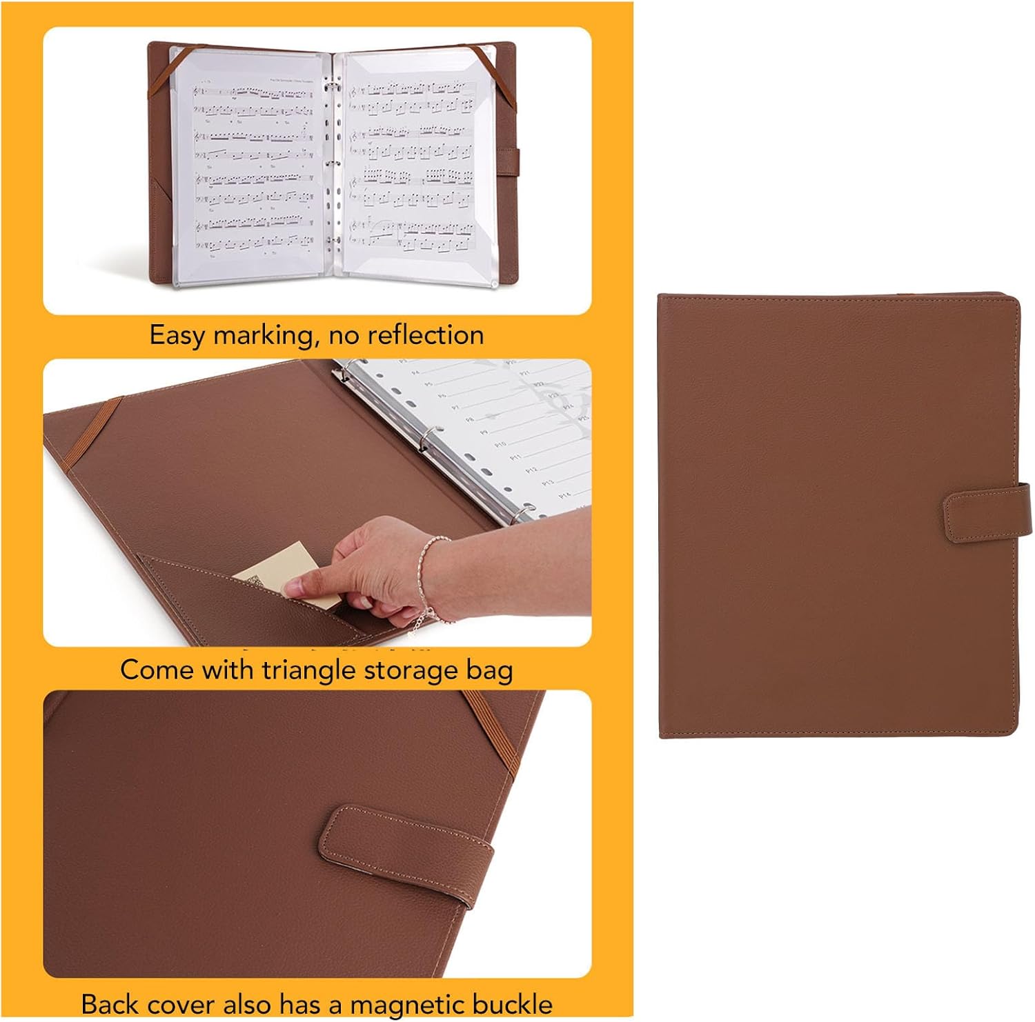 [NUMERI DI PAGINA PER UNA FACILE RIFERIMENTO] Le pagine catalogate facilitano la ricerca della musica [FACILE DA INSTALLARE] Il design del telaio garantisce un facile posizionamento e modifica degli spartiti [MULTIFUNZIONALE] Può essere utilizzato su desktop senza supporto con funzione di elastico [SPAZIO DI ARCHIVIAZIONE EXTRA] Tasca triangolare sul retro per riporre segnalibri, biglietti da visita e altro [MATERIALI DUREVOLI] Pelle PU di alta qualità e PVC impermeabile per una protezione della musica di lunga durata