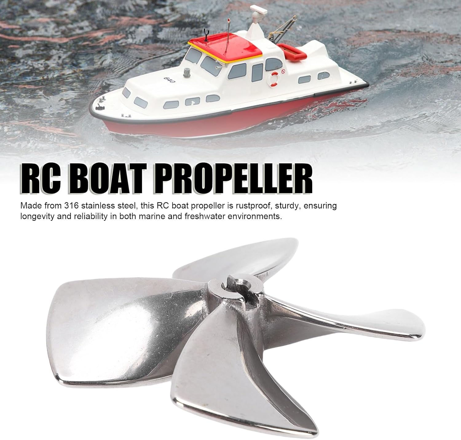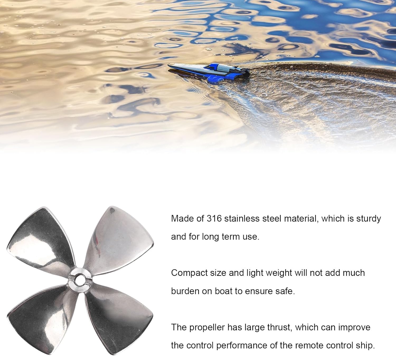 Materiale in acciaio inossidabile: realizzata in acciaio inossidabile 316, questa per barche RC è antiruggine, robusta e garantisce longevità e affidabilità sia in ambienti marini che d'acqua dolce. Lavorazione CNC: l' presenta un diametro di 80 mm e un passo di 1,2 mm, realizzata mediante lavorazione CNC. Il suo design a 4 pale garantisce un eccellente equilibrio dinamico per prestazioni efficienti. Diametro del foro di 6 mm: con un diametro del foro di 6 mm, questa di aggiornamento per barche RC è compatibile con la maggior parte dei diametri dell'albero motore tradizionali, semplificando l'aggiornamento o la sostituzione delle eliche in varie applicazioni marine. Applicazioni versatili: adatta per l'installazione su modellini di barche, imbarcazioni senza equipaggio o pescherecci, questa migliora l'efficienza di propulsione, rendendola un accessorio essenziale per qualsiasi appassionato di . Facile da usare: progettata per prestazioni eccezionali, questa resiste a condizioni marittime difficili, offrendo una lunga durata. È facile da installare e non è facile cadere una volta installato.