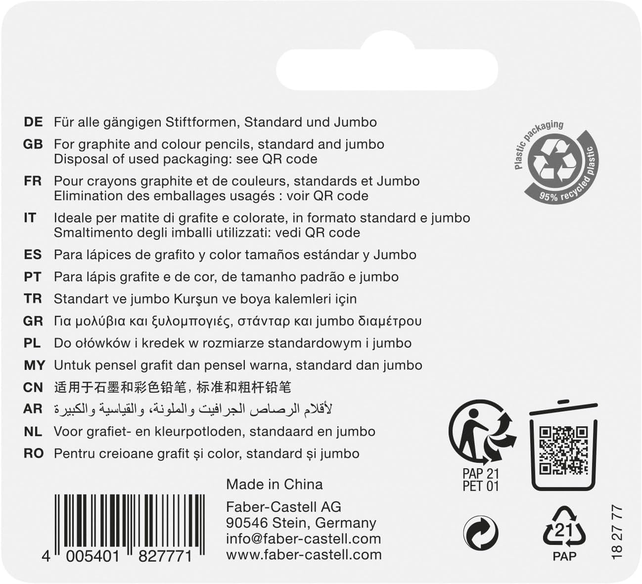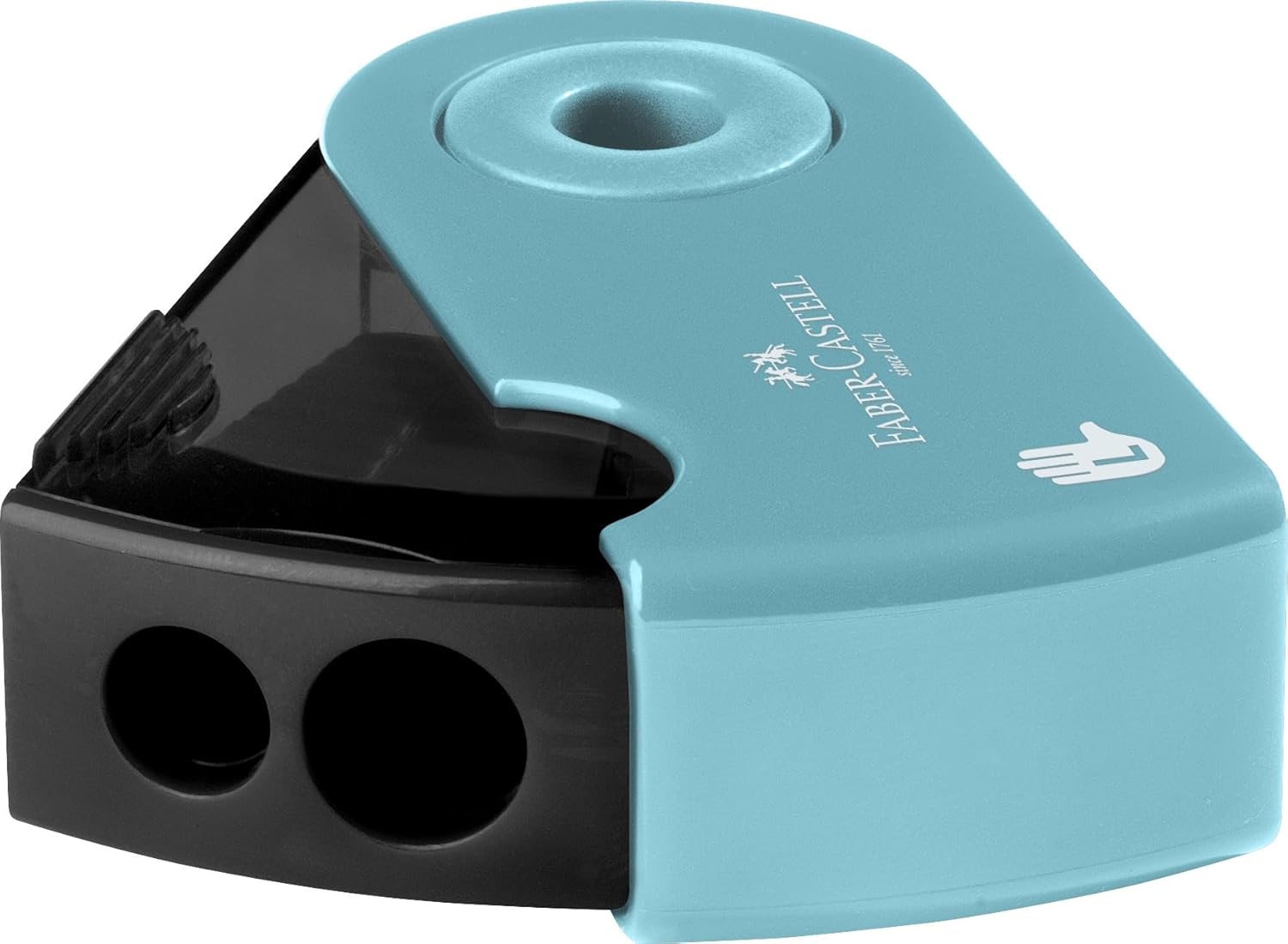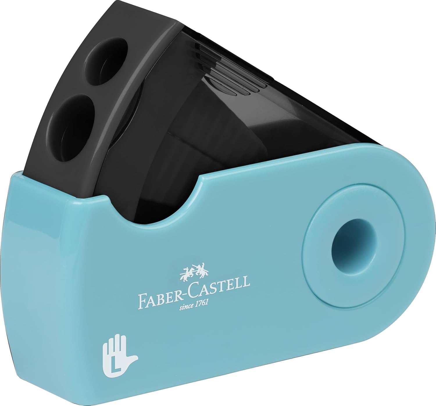 Design specifico: temperamatite doppio appositamente progettato per utenti mancini, con forma ergonomica e finitura turchese DOPPIA FUNZIONE: Dispone di due diversi fori di affilatura per matite standard e dimensioni jumbo, adattandosi a molteplici esigenze Marchio Premium: prodotto Faber-Castell, azienda tedesca fondata dal 1761 con rinomata traiettoria in articoli da scrittura CARATTERISTICHE PRATICHE: Include serbatoio per trucioli e design compatto che facilita il trasporto e lo stoccaggio COMPATIBILITÀ UNIVERSALE: Adatto per affilare matite in grafite e colorate in formati standard e jumbo