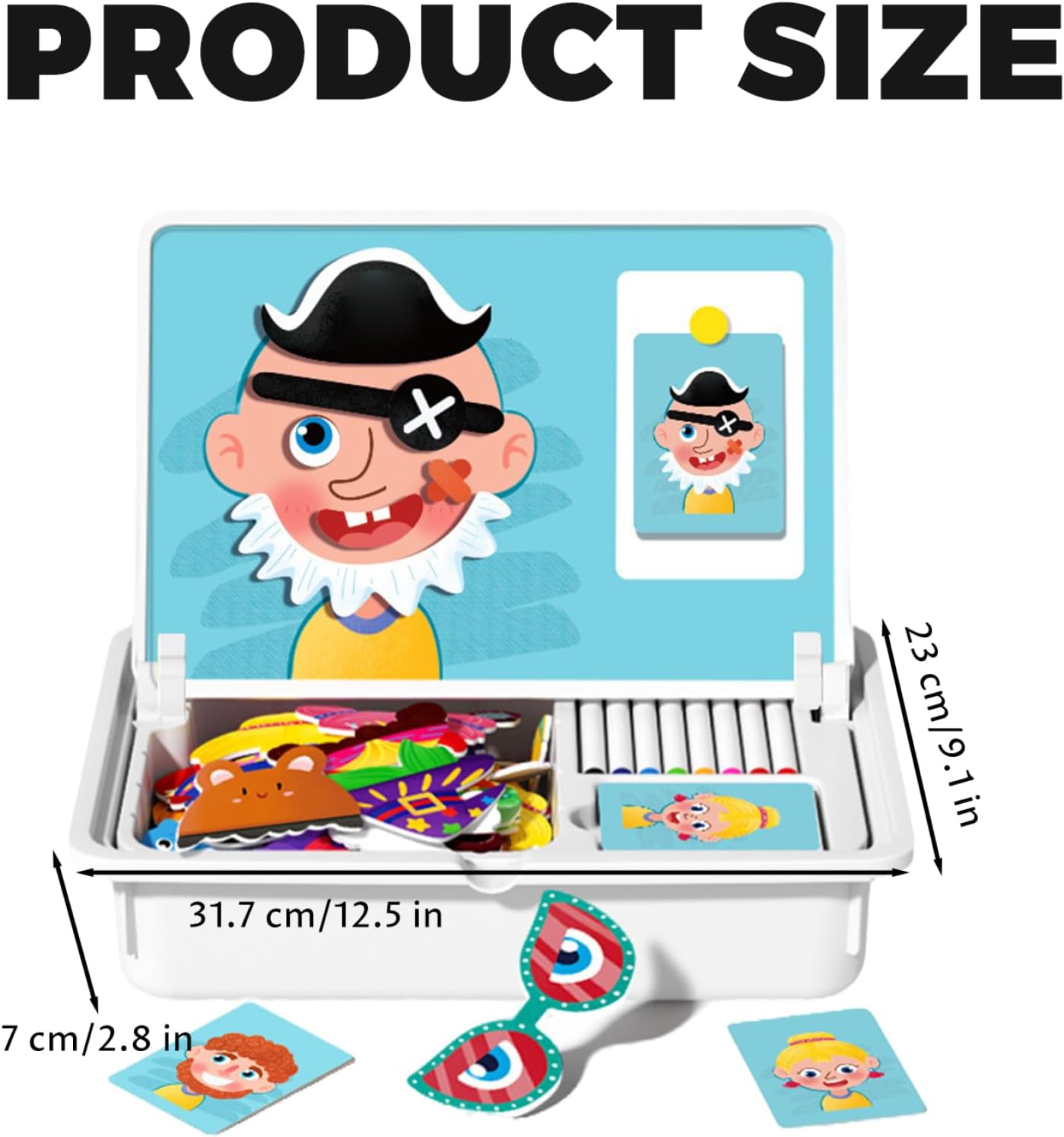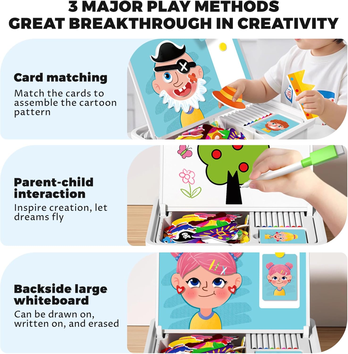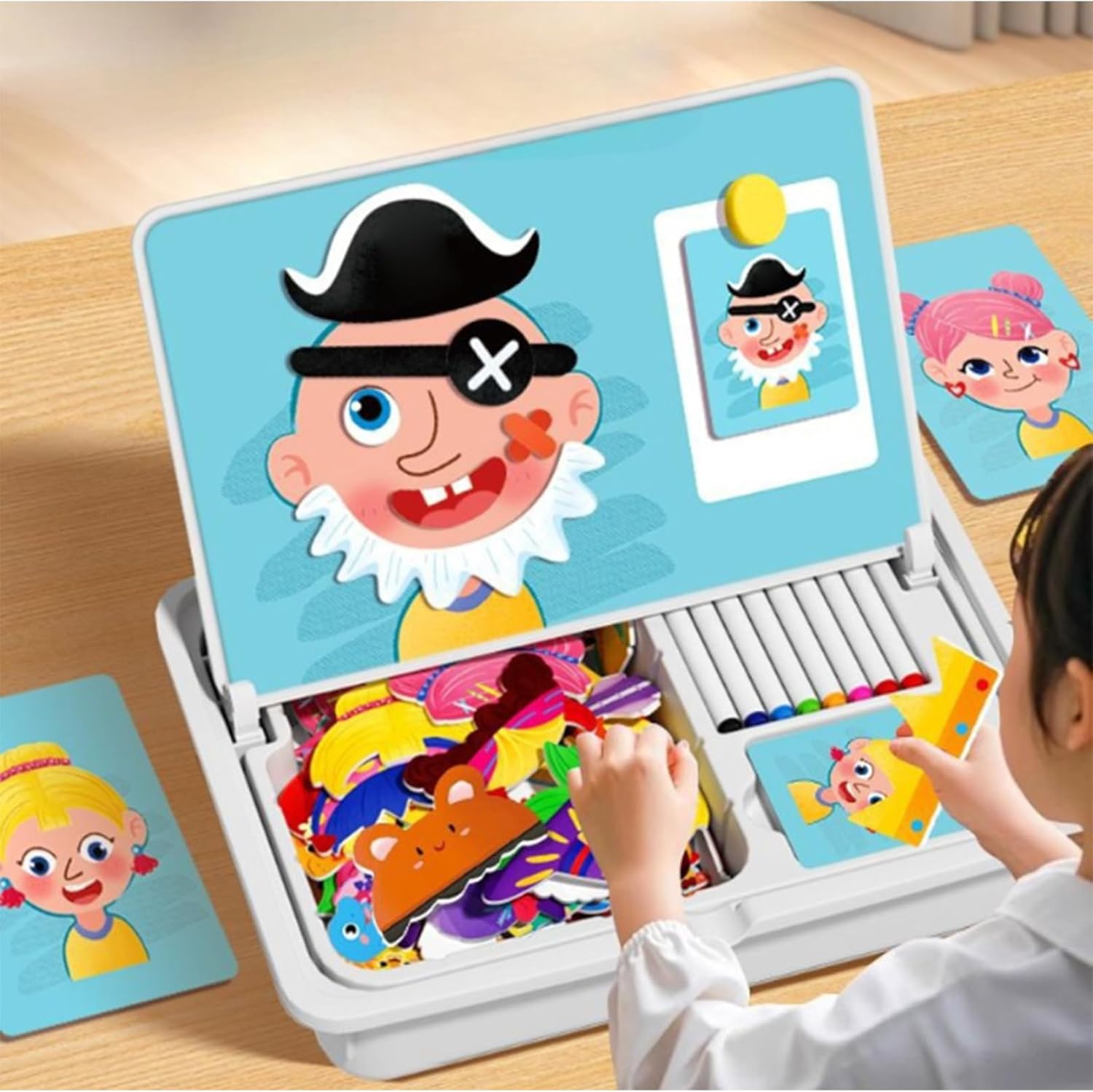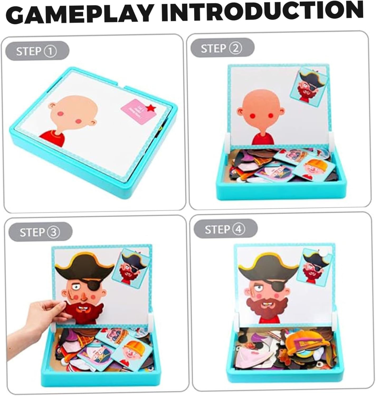 Gioco educativo coinvolgente: il set comprende 12 carte a doppia faccia, 6 carte con motivi e 6 tutorial di disegno, che ispirano l'immaginazione e guidano il pensiero logico..I bambini possono seguire gli esempi o creare le proprie forme, migliorando la risoluzione dei problemi e la coordinazione visiva. Lavagna creativa a doppia faccia: questo set di puzzle magnetici presenta un design a doppia faccia con una lavagna magnetica su un lato e una lavagna sull'altro, offrendo infiniti modi per giocare, disegnare e imparare..I bambini possono facilmente passare dall'assemblare modelli magnetici all'esprimere la creatività attraverso il disegno o la scrittura. Accessori completi: dotato di 8 pennarelli a base d'acqua, 1 molletta magnetica e 12 carte, questo set fornisce un kit completo di strumenti per il gioco fantasioso..I pennarelli sono facili da pulire, garantendo un'esperienza riutilizzabile e senza problemi. Interazione genitore-figlio e scatola portaoggetti: progettato per il divertimento della famiglia, questo set incoraggia il gioco interattivo e la comunicazione..La scatola compatta mantiene tutti i componenti organizzati e portatili, rendendolo ideale per l'uso a casa o in viaggio. Design magnetico per un facile assemblaggio: i pezzi magnetici fissano saldamente alla lavagna, consentendo ai bambini di assemblare facilmente facce di cartoni animati, animali o forme creative..Ciò promuove la coordinazione occhio-mano e lo sviluppo motorio fine.