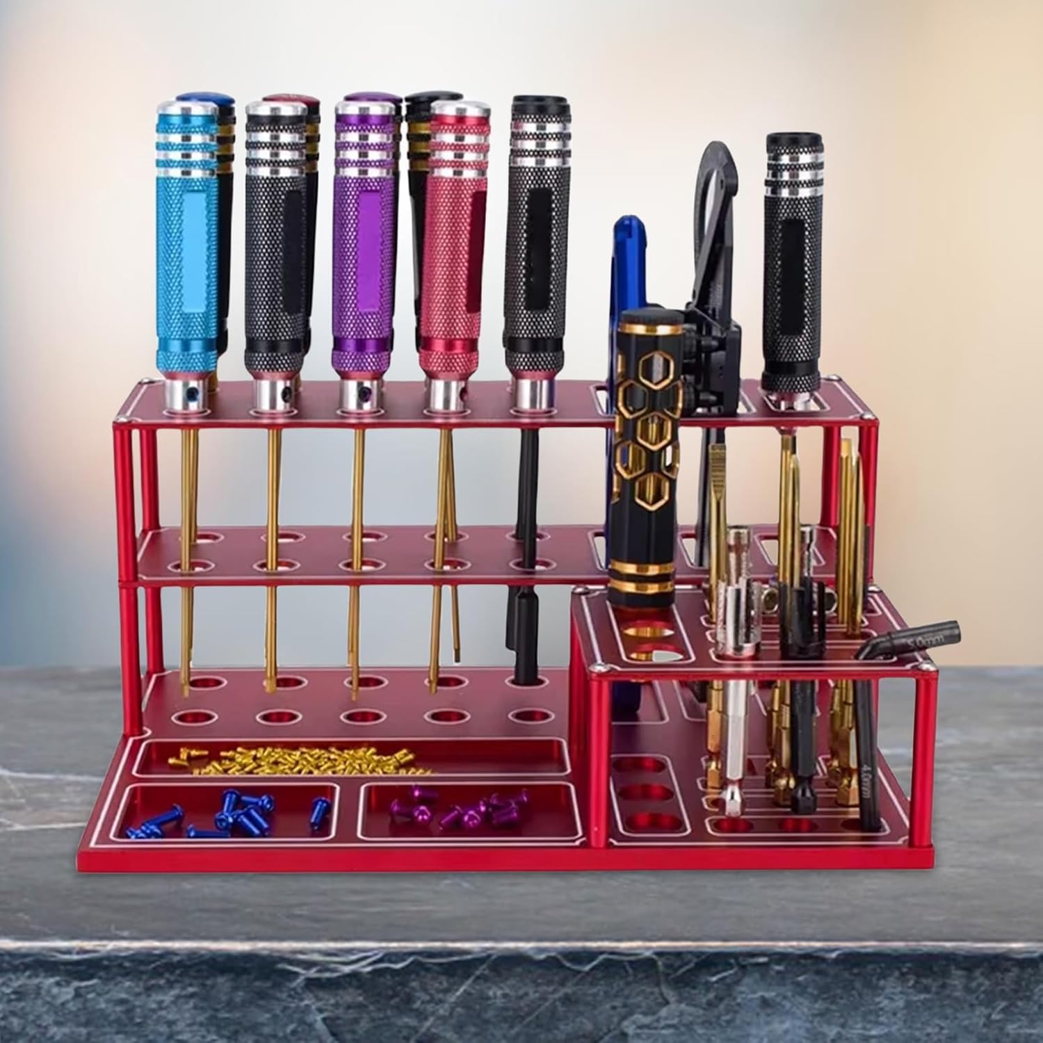 Perfetto per studi, officine e banchi da lavoro domestici dove conservare ed esporre gli strumenti di modellini di auto è essenziale Mantieni i tuoi strumenti ordinati e organizzati con il nostro rack organizer per strumenti di modellini di auto, progettato per gli appassionati di modellini di auto per trovare rapidamente gli strumenti di cui hanno bisogno Migliora le tue aree di lavoro con questo organizer facile da installare, assicurando che i tuoi strumenti siano a portata di mano e che il tuo processo creativo rimanga ininterrotto Adatto per gli appassionati di modellini di auto, hobbisti artigianali, costruttori di modelli professionisti e chiunque abbia bisogno di un efficiente stoccaggio degli strumenti Questo resistente rack è realizzato in lega di lega e contiene design pratici che completano vari stili di decorazione