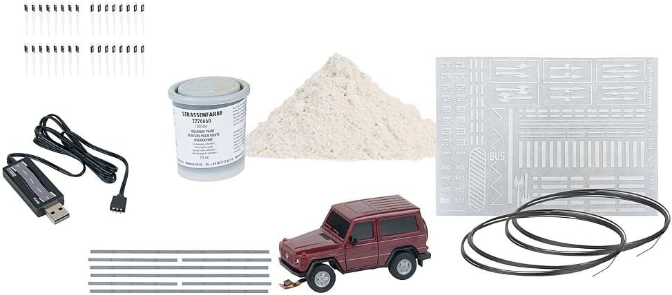 Questo kit è ideale per l'inserimento nel sistema dell'auto. Contiene tutto ciò di cui i principianti hanno bisogno per iniziare subito Il pezzo forte è un SUV Mercedes-Benz Classe G rosso Inoltre, il kit include un cavo di guida, un caricatore USB con spegnimento automatico, vernice stradale, mastice e una varietà di decorazioni stradali