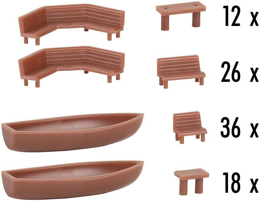 Con 64 panche e 30 tavoli abbinati in effetto legno possono essere abbelliti in modo eccellente i luoghi di soggiorno, parchi e aree barbecue per gli abitanti in miniatura del modellismo. Le tovaglie abbinate sono incluse. Inoltre, nel set sono incluse due piccole imbarcazioni, che possono essere utilizzate, ad esempio, per progettare un piacevole viaggio su un lago del parco.