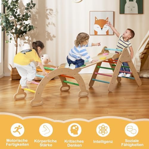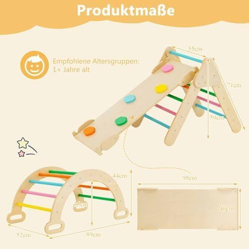 Design 4 in 1: questo set da arrampicata Montessori è composto da un triangolo da arrampicata, un arco da arrampicata e uno scivolo. Tutte le parti possono essere assemblate in diverse combinazioni. Lo scivolo ha un design a doppia faccia ed è dotato di 5 pietre da arrampicata che simulano l'alpinismo, consentendo ai bambini di scivolare o arrampicarsi a piacimento. Struttura stabile: il design del triangolo da arrampicata, dell'arco da arrampicata e dello scivolo è robusto e impedisce ai bambini di cadere durante il gioco. È particolarmente importante che le connessioni stabili aumentino la stabilità complessiva del set. Materiali durevoli e design sicuro: la struttura da arrampicata è realizzata in legno di faggio naturale, che è durevole e sicuro e offre una lunga durata. Inoltre, i bordi sono levigati e la superficie è infrangibile. Ciò significa che i bambini possono tranquillamente usare il triangolo da arrampicata. Rinforzato e ingrandito: la piastra da arrampicata lunga 98 cm e la struttura triangolare da arrampicata sono realizzate in legno più spesso. L'arco da arrampicata di grandi dimensioni 89 x 52 x 44 cm offre spazio per due bambini. La dimensione più grande assicura che i bambini possano giocare in modo più sicuro. Regalo perfetto per i più piccoli: il set di giocattoli da arrampicata in legno è un regalo perfetto per bambini a partire da 1 anno. I bambini possono promuovere il loro equilibrio, apprendimento, abilità sociali e altre abilità quando giocano con il set di triangoli da arrampicata in legno.