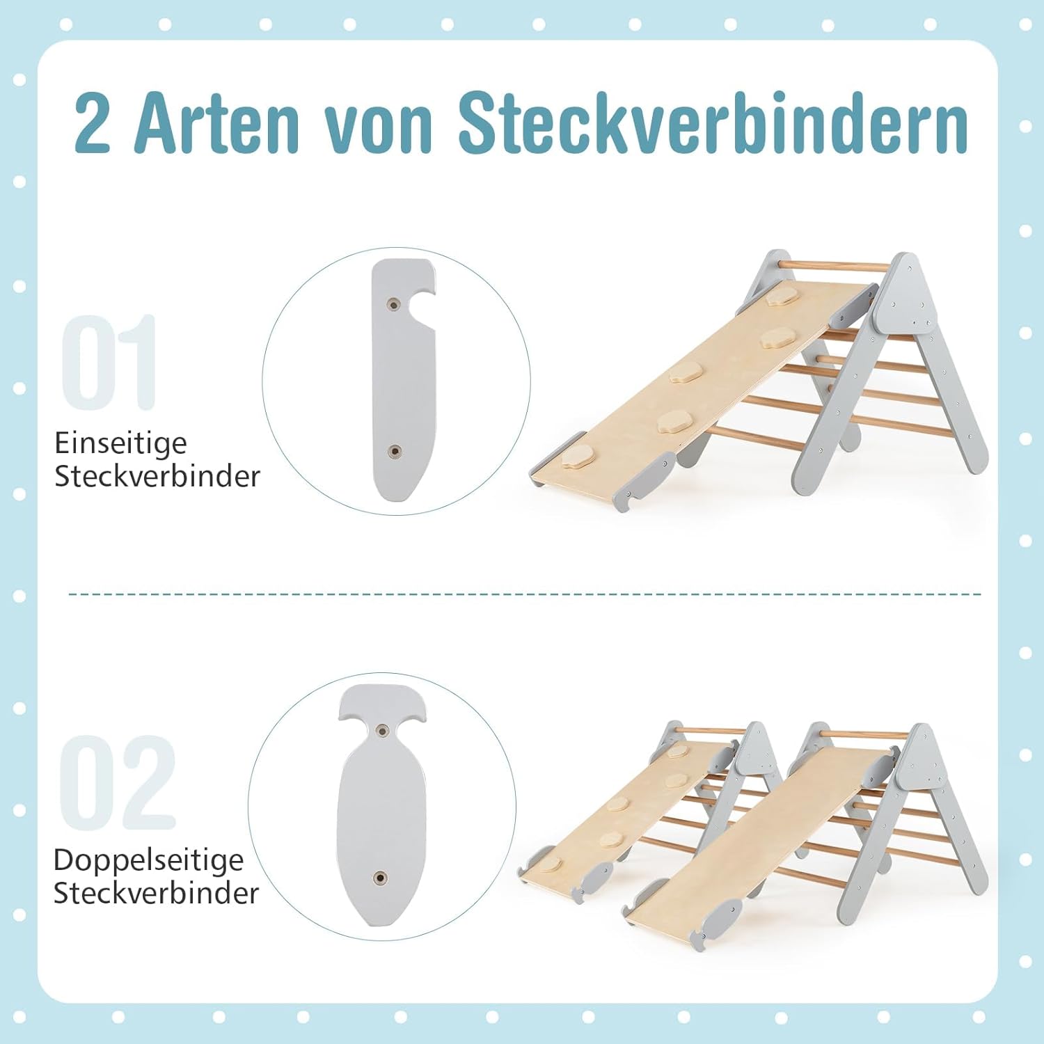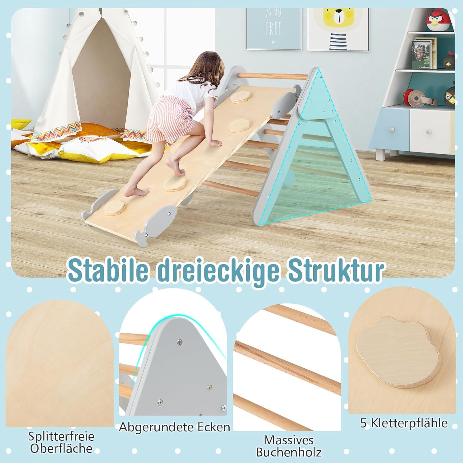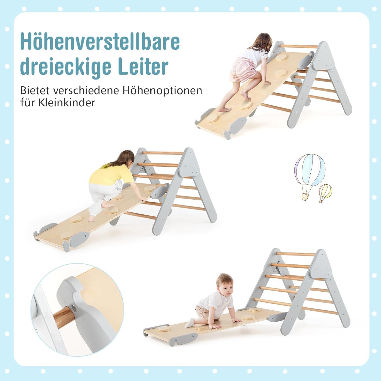 Combinazioni di gioco flessibili: questo set da arrampicata Montessori comprende un triangolo da arrampicata, un arco da arrampicata e una rampa, che possono essere utilizzati singolarmente o insieme a seconda dei desideri dei bambini, garantendo un divertimento senza fine. Funzione rampa versatile: la rampa può essere salita liberamente, può essere combinata con il triangolo per diverse altezze e l'arco può anche essere utilizzato come un'altalena capovolgendolo. Materiali robusti e sicuri: realizzato in legno di faggio di alta qualità con bordi lisci e lucidati e una superficie priva di schegge, il set offre un ambiente di gioco duraturo e sicuro per i più piccoli. Struttura complessiva stabile: triangolo, arco e rampa sono costruiti solidamente per evitare scivolamenti, mentre le connessioni solide aumentano significativamente la stabilità. Opzione di montaggio aggiuntiva: il set viene fornito con quattro pezzi in ferro che possono essere fissati al pavimento se necessario per migliorare ulteriormente la sicurezza durante il gioco.