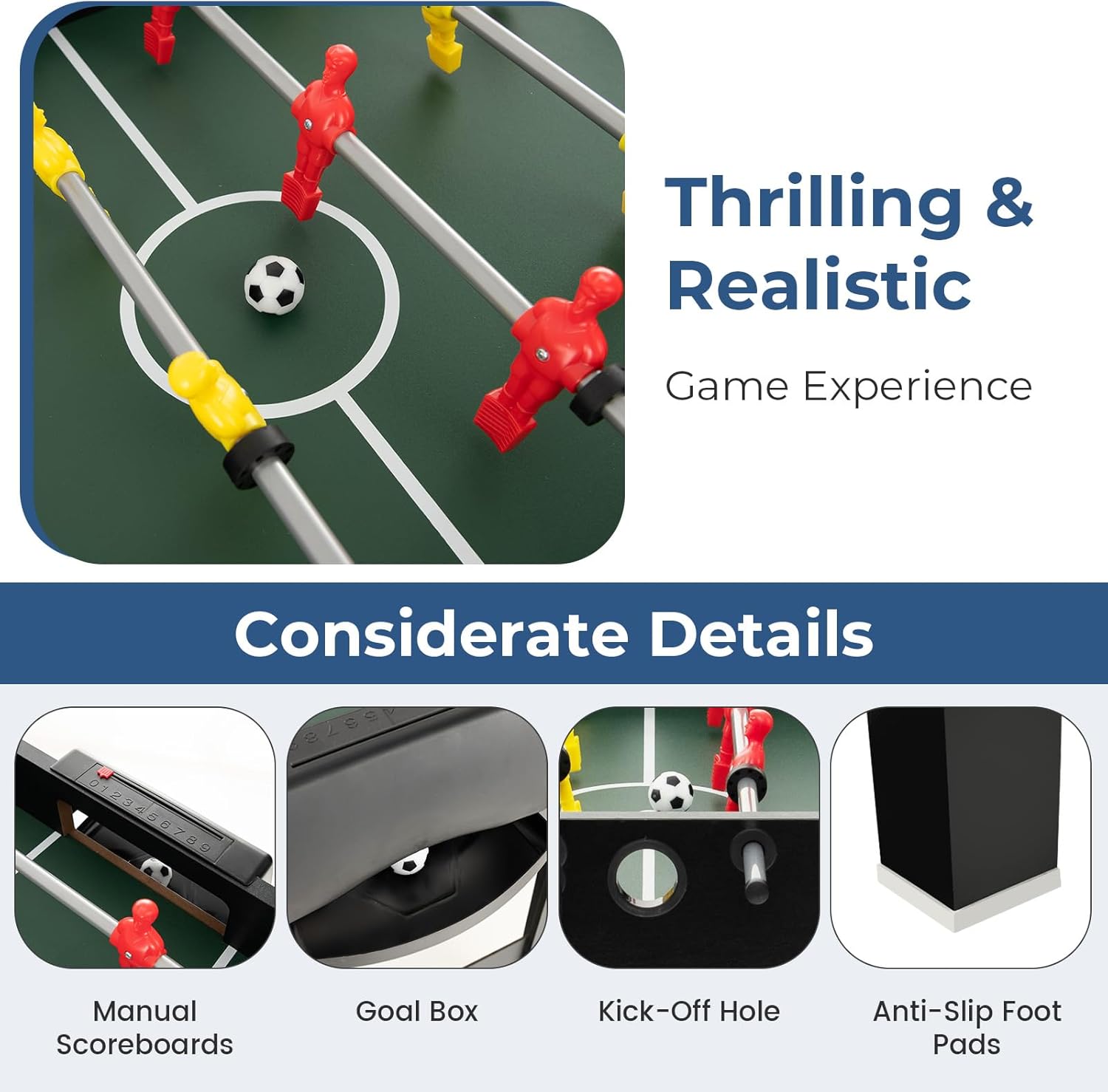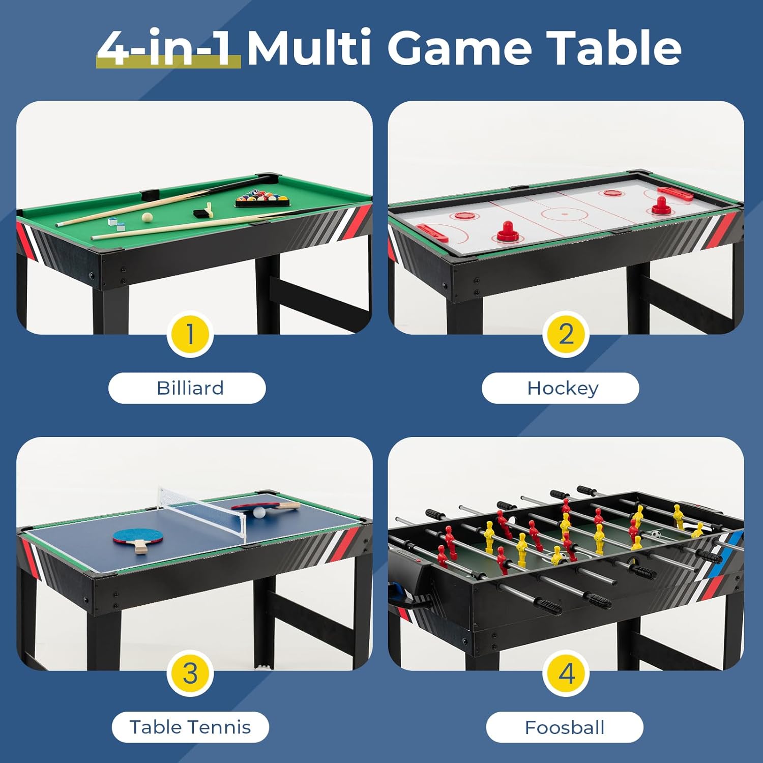 Quattro giochi in uno: il tavolo da gioco multifunzionale unisce calcio balilla, hockey, biliardo e ping pong in un unico posto, così potrete divertirvi in modo vario alle feste o alle riunioni di famiglia. Cambio rapido del gioco: grazie al design intelligente dell'impilamento, le superfici di gioco possono essere facilmente scambiate, il che non solo facilita il passaggio da un gioco all'altro, ma consente anche di risparmiare spazio. Esperienza di gioco realistica: dettagli attenti come tabelloni segnapunti, aree della porta e buche di calcio d'inizio garantiscono una sensazione di gioco autentica, mentre le aste in metallo liscio con maniglie antiscivolo offrono un controllo ottimale. Ampio set di accessori: tutta l'attrezzatura di gioco necessaria è inclusa, così puoi iniziare subito senza dover acquistare accessori aggiuntivi. Adatto a grandi e piccini: con le dimensioni di 125 x 97 x 83 cm il tavolo da gioco offre spazio sufficiente per bambini e adulti e si adatta perfettamente a soggiorni, uffici, bar o dormitori studenteschi.