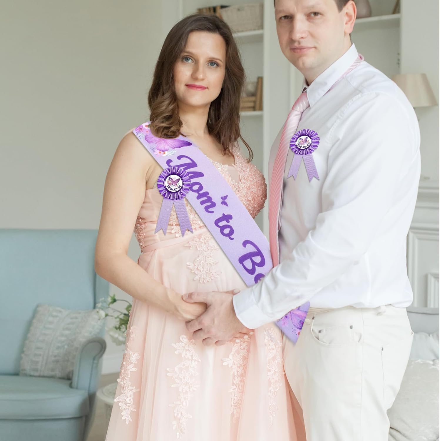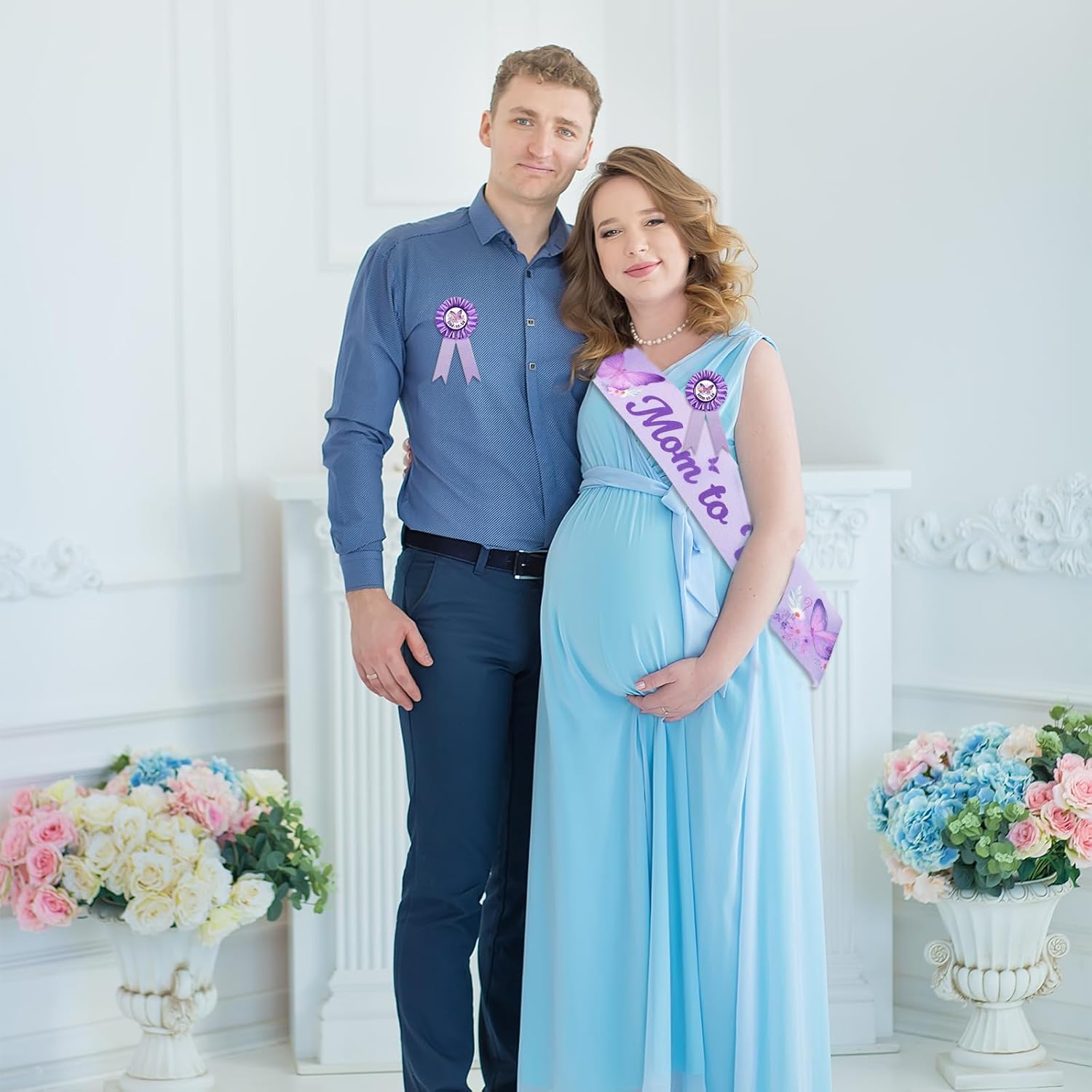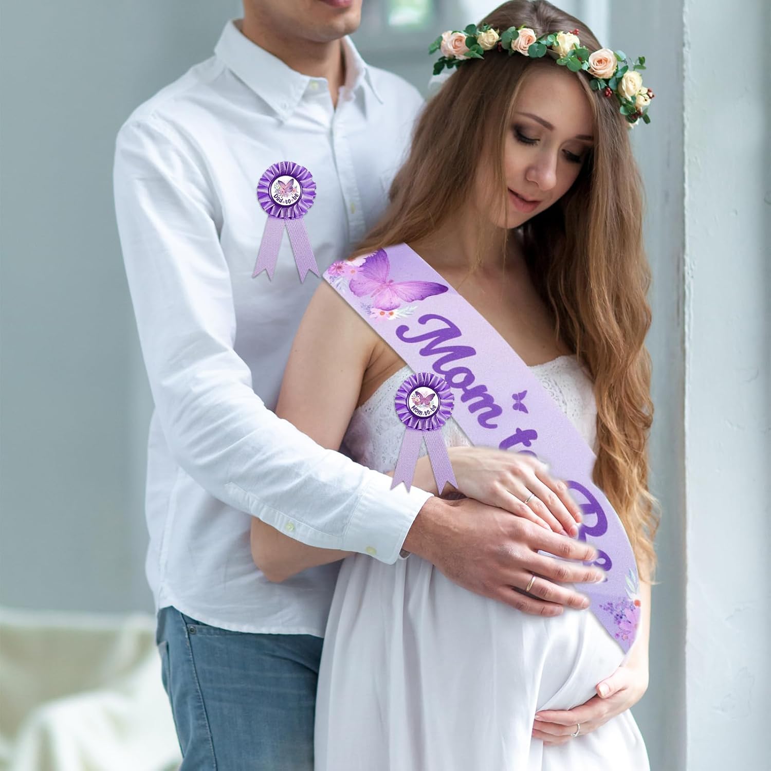 Set per Baby Shower: Include 1 fascia gravidanza, 1 distintivo gravidanza, 1 distintivo futuro papà e 1 coroncina floreale, ideale per celebrare l'arrivo di una bambina e creare ricordi indimenticabili per la maggior parte delle persone Decorazioni Baby Shower a tema farfalla: La fascia gravidanza e il distintivo sono a tema farfalla lilla e stampati con le scritte "Mom to Be" e "Dad to Be". Puoi utilizzare questa splendida fascia, distintivo e corona per creare un'atmosfera festosa per un baby shower o una festa di annuncio del genere Ampia applicazione: Questa fascia gravidanza a tema farfalla lilla sarà un bellissimo regalo e ricordo per i genitori del neonato. Perfetta per un annuncio del genere, una festa di baby shower o un servizio fotografico di party Misura adatta: La fascia gravidanza è di circa 160,02cm x 9,39cm, una misura adeguata per far sembrare la futura mamma splendida. Il distintivo futuro papà è di circa 4,57cm, perfetto per molti tipi di camicie Materiale affidabile: Queste decorazioni per baby shower per bambina sono principalmente realizzate in tessuto e nastro. Questo set di fascia e distintivo a tema farfalla è affidabile e durevole, non si rompe né si deforma facilmente