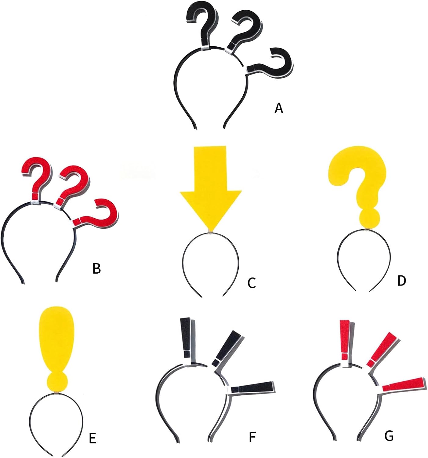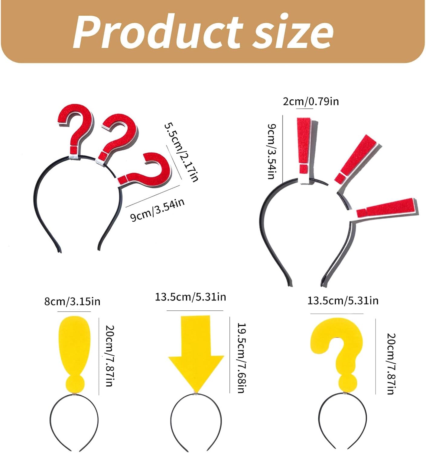 Fascia per bambini per festa punto esclamativo per festival musicali puntelli fotografici per fotografia ragazza Caratteristiche: Ottieni un'acconciatura accattivante con il nostro divertente copricapo. Realizzato in tessuto, questo copricapo è in punto esclamativo/punto interrogativo/forma. Per donne e ragazze di tutte le età che vogliono mettere in risalto il proprio look o mettere in risalto il proprio outfit in occasioni speciali. Adatto per una varietà di occasioni come matrimoni, balli, feste o anche solo una giornata informale. Il nostro copricapo è adatto per donne, ragazze e bambini che amano gli accessori per capelli alla moda. È un must per coloro che vogliono aggiungere un tocco di stile alle proprie acconciature. Specifiche tecniche: Componente: Panno Tipo: come da immagine. Circonferenza del cappello: circa 55-60 cm. La confezione include: 1 fascia per capelli. Nota: 1. Si prega di considerare un margine di errore di 1-2 cm dovuto alla misurazione manuale. 2. A causa delle differenze tra i diversi monitor, l'immagine potrebbe non riflettere esattamente il colore dell'articolo.