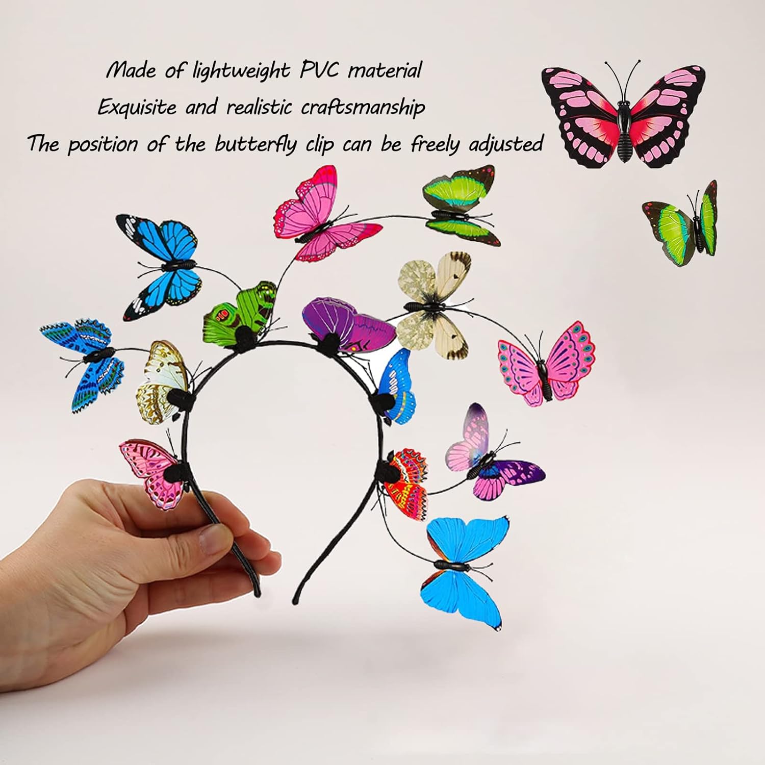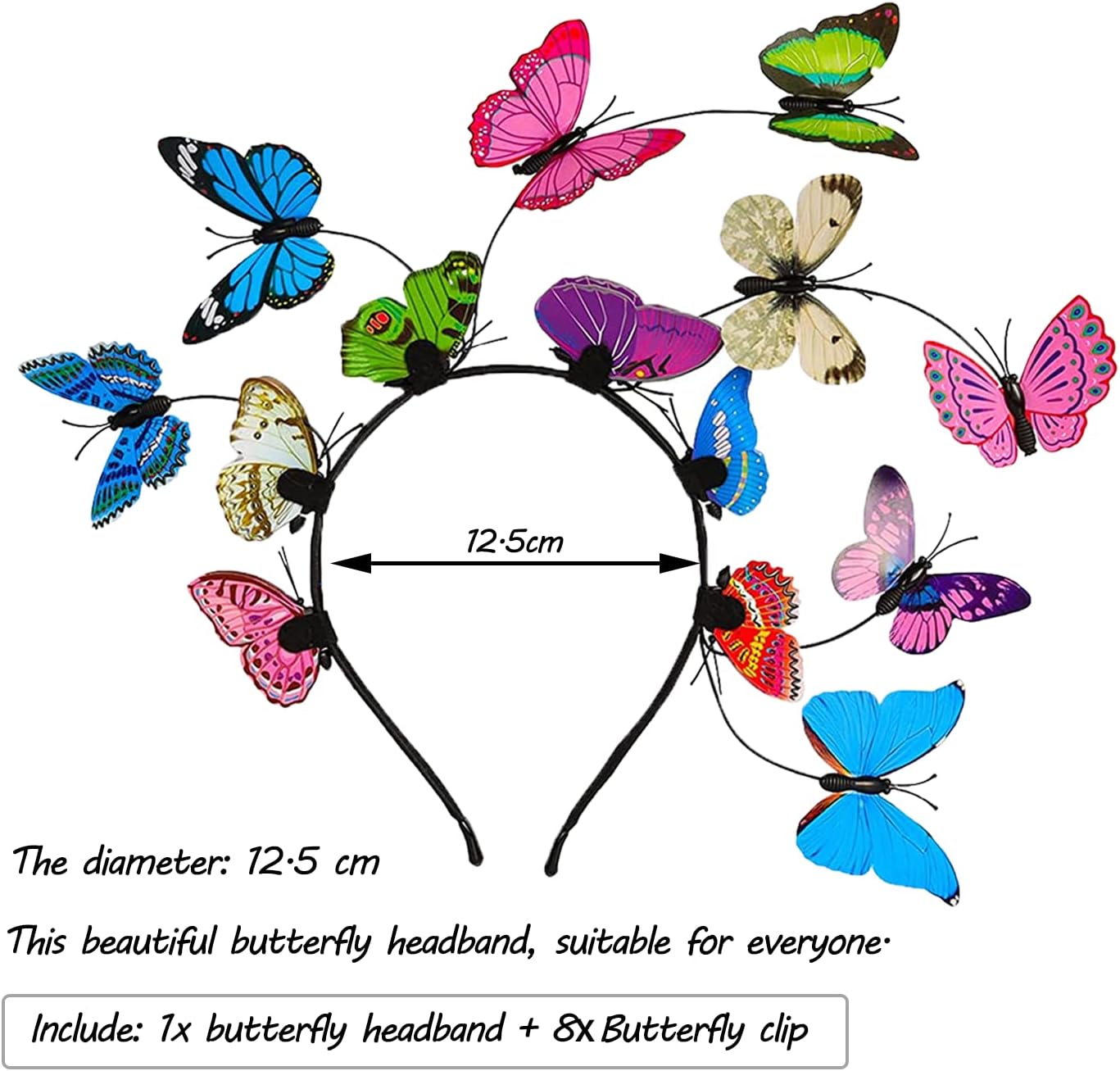【Bellissima fascia per capelli a farfalla】 Riceverai 1 bellissima fascia per capelli da fata a farfalla colorata. Contiene una fascia per capelli a farfalla e 8 clip a farfalla colorate. Puoi cambiare la posizione della farfalla come desideri. Fata Fascia Farfalla ti rende una fata farfalla tra i fiori. 【Dimensione perfetta】 La dimensione della fascia a farfalla è di 12,5 cm. I gioielli per capelli a farfalla possono essere facilmente personalizzati per adattarsi alla testa di donne e ragazze. 【Artigianato squisito】 La ghirlanda di farfalle è realizzata in PVC leggero, delicata come una vera farfalla. Le farfalle sulla ghirlanda di farfalle sono collegate da un filo morbido e sottile. Puoi creare la tua protezione per la testa a farfalla regolando la posizione e l'altezza delle linee sottili. 【Bellissima clip a farfalla】 la nostra clip a farfalla può essere spostata. Puoi spostare queste clip a farfalla per personalizzare i tuoi vestiti e i tuoi capelli. Otto forcine a farfalla ti fanno sembrare più una fata delle farfalle. Multifunzionale: l'oggetto di scena a forma di farfalla per feste è un oggetto molto versatile per giochi di farfalle, feste di fate, feste in giardino, case da tè, fotografia, sfilate di moda e altre occasioni speciali. La fascia colorata a farfalla ti fa brillare alla festa.
