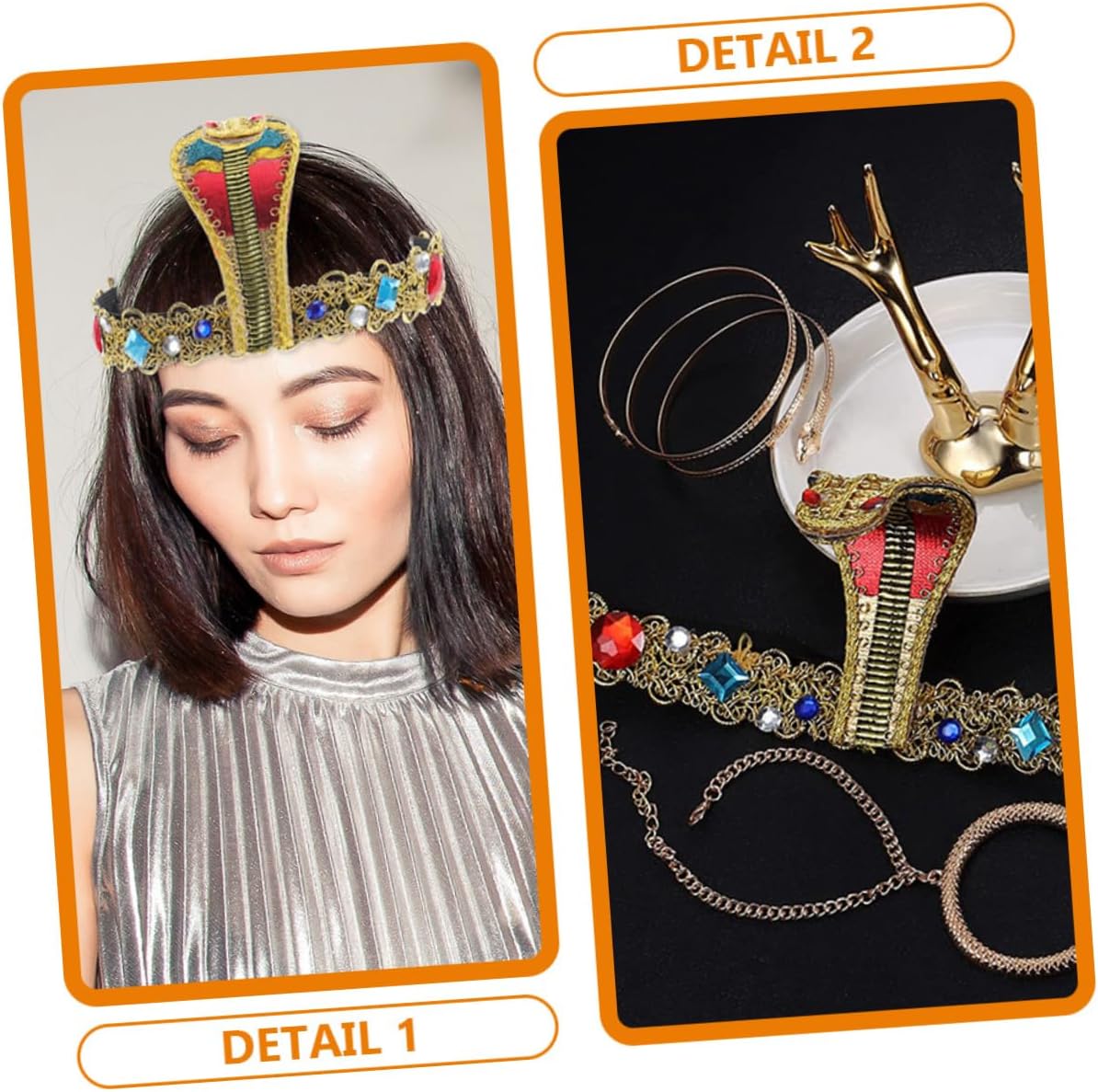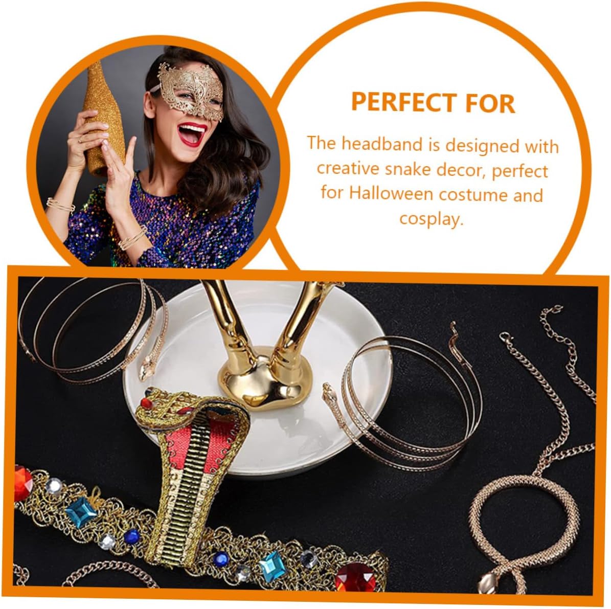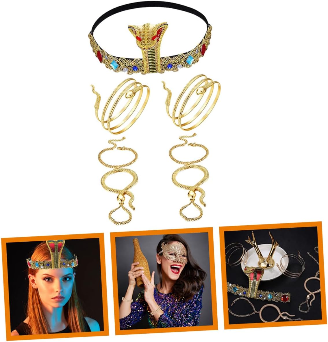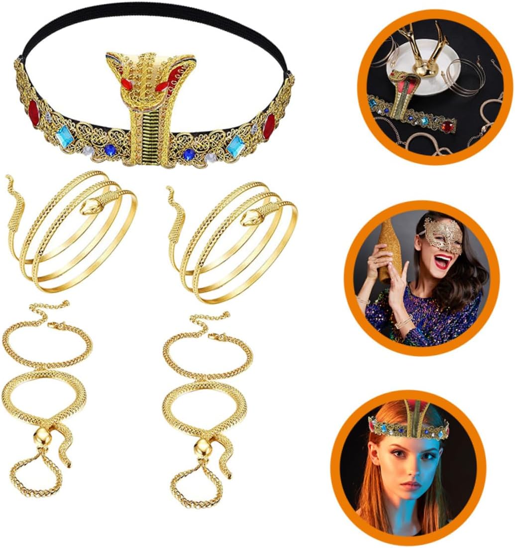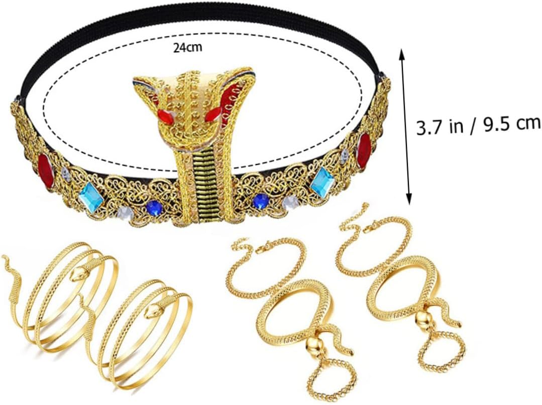 Il pacchetto include 1 fascia per egiziana per cosplay 4 braccialetti Caratteristiche - Materiale: stoffa, fascia per in metallo a forma di serpente per Halloween - Dimensioni della fascia per : 24,00X9,50X1,00 cm/9,43X3,73X0,39 pollici Decorazione per fascia per di Halloween - Eccellente lavorazione, curata in ogni dettaglio per conferire un aspetto chic e sorprendente ai costumi di Halloween. - Fascia decorativa con colori assortiti - Un fantastico per tua moglie, la tua fidanzata o la tua amante in occasioni speciali: regala loro dei piccoli cerchietti per a forma di serpente da festa. - Ampiamente utilizzato per celebrare diverse feste come Halloween, carnevale, feste in maschera, il cerchietto può facilmente soddisfare le tue esigenze di accessori per costumi egiziani. - Come accessorio elegante, aggiungerà brillantezza tuo look. Adatto a donne di tutte le età. Bracciale a forma di serpente. - Con elementi a forma di serpente, questa fascia e i braccialetti ti renderanno ancora più affascinante. Fascia per di Halloween. Descrizione della merce Decorazioni per cerchietti di Halloween Possono aggiungere un'atmosfera più piacevole alla tua celebrazione. Accessorio per cosplay C'è un copricapo interessante per la festa di Halloween, il carnevale, la festa in maschera o altre attività di celebrazione, realizzati con materiale sicuro, durevole da usare