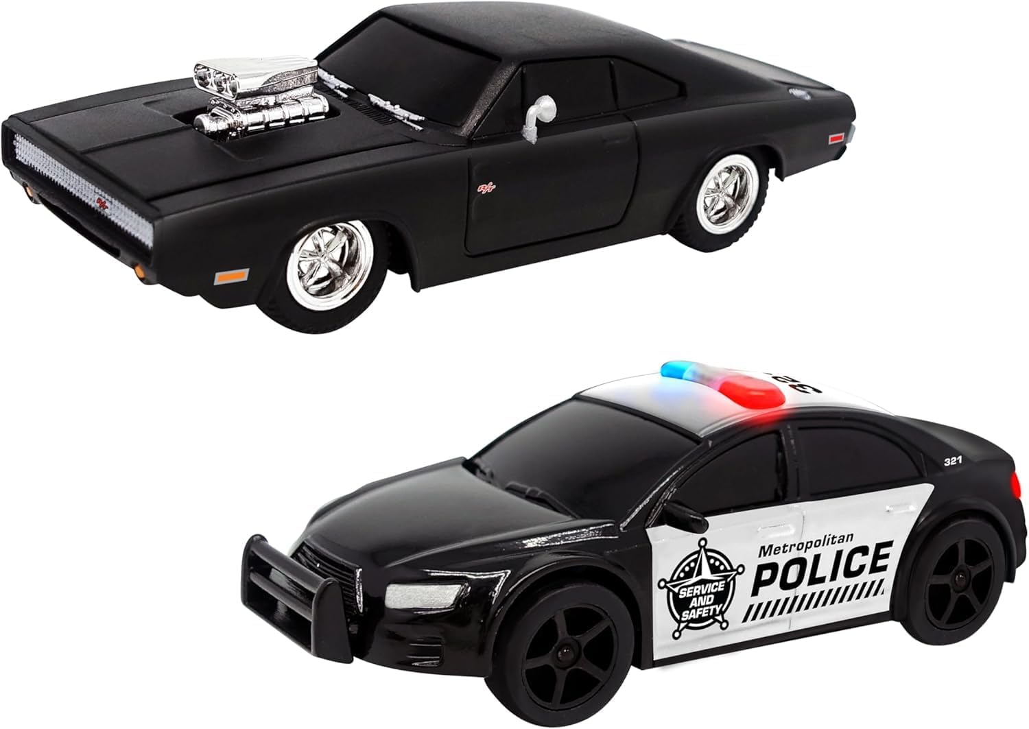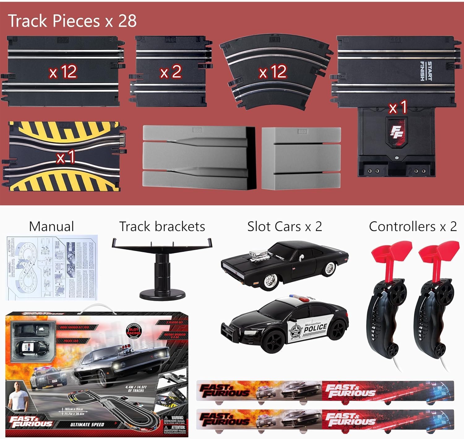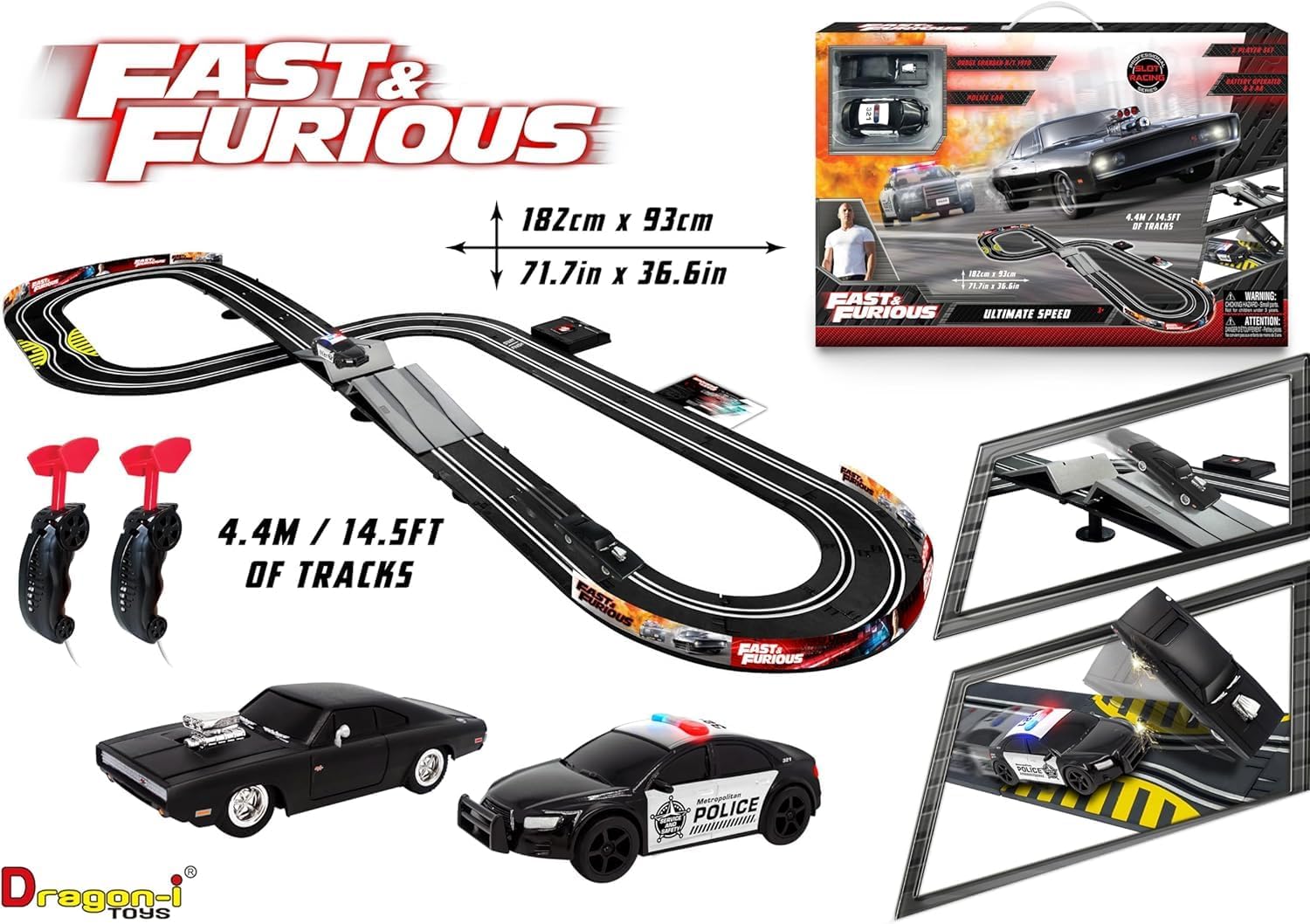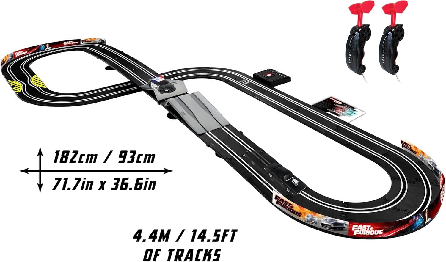 With the Fast & Furious Ultimate Speed racetrack, you can race Dom's iconic Dodge Charge R/T 1970 against a police car with flashing lights! Take control of the Dodge Charger and help Dom and his crew as they continue their global exploit in the unstoppable franchise built on speed. The racetrack is 14.5 feet long and comes with two 1:43 scale vehicles and 2 speed controlers. Friends and family, both young and old, will joy competing as they race around the track with the cars. Gear up for non-stop action with the Fast & Furious Ultimate Speed racetrack!