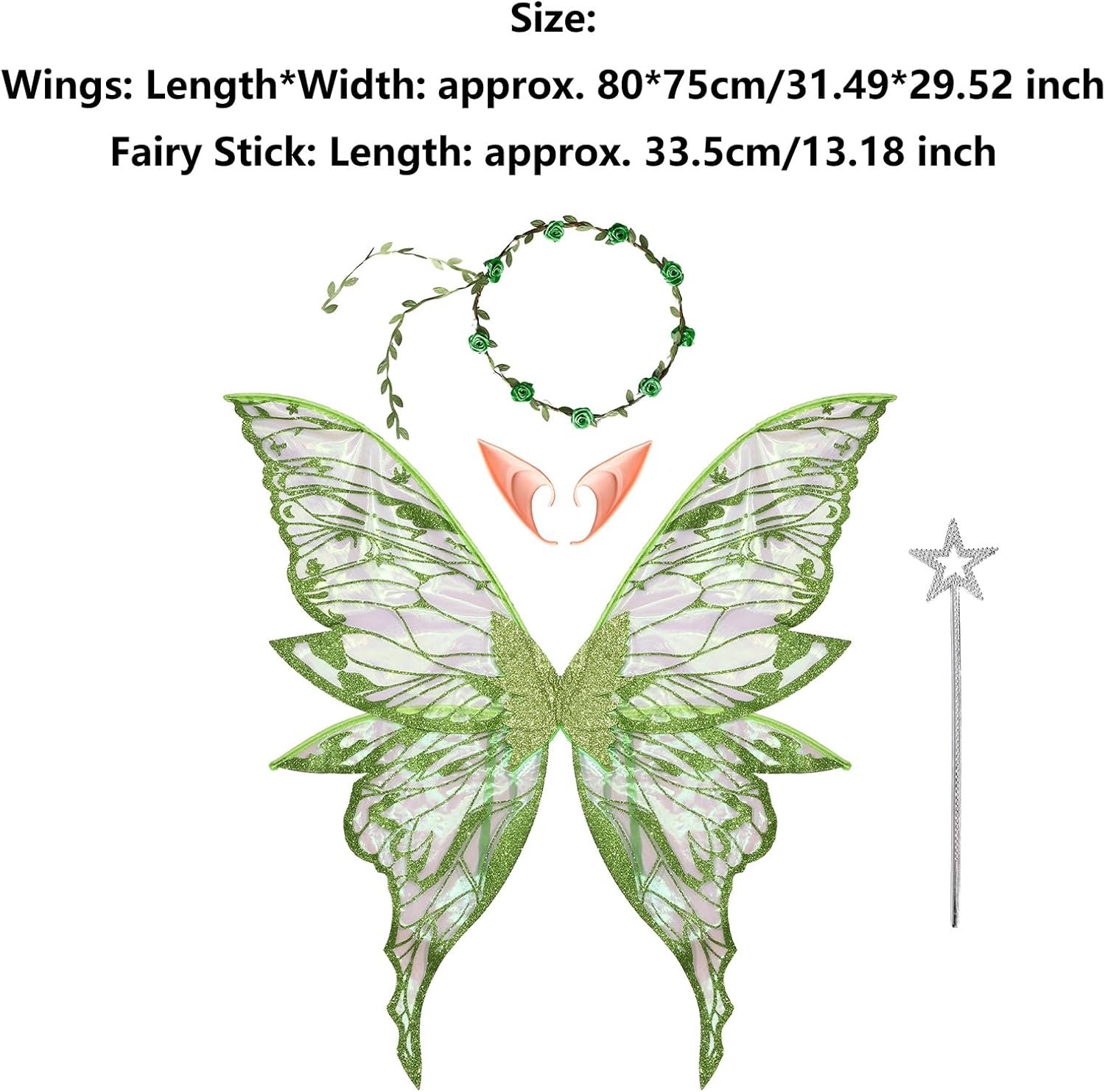 Descrizione prodotto Imposta include : 1 paio di ali, 1 paio di orecchie da elfo, 1 bastoncino da fata, 1 ghirlanda Condizione : Nuovo con etichette Materiale : 90% poliestere, 10% plastica Ali: Lunghezza*Larghezza: circa 80*75cm/31.49*29.52 pollici Fairy Stick: Lunghezza: circa 33.5cm/13.18 pollici Avviso di sicurezza Il borsa non è un giocattolo. Tenere lontano da fuoco e fiamme.