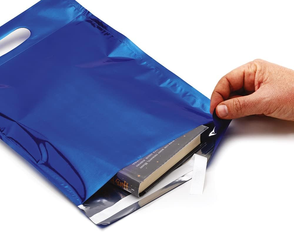 Confezione 20 buste monocolore Blu Metallizzato Aletta di chiusura con adesiva resistente e pratica maniglia ergonomica Confezione da 20 buste formato 35x41 cm Colore lucido e brillante Made in italy