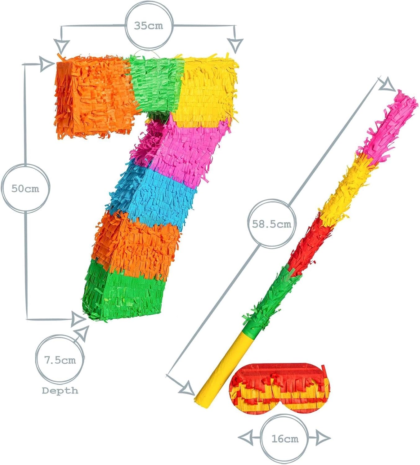 Robusta ma leggera, questa piñata è realizzata in cartone resistente e decorata con festose nappe di carta. È abbastanza leggero da poterlo appendere facilmente, ma abbastanza forte da consentire agli ospiti di aprirlo e rivelare il tesoro! Perfetto per qualsiasi traguardo: disponibile nei numeri da 0 a 9, può essere combinato per commemorare compleanni, anniversari e altro ancora. Il design numero 7 è ideale per celebrare traguardi importanti o qualsiasi evento gioioso! Facile da riempire e divertente da distruggere: riempi semplicemente l'apertura nascosta con le tue caramelle, dolcetti o sorprese preferite. Dimensioni: Larghezza: 35 cm, Profondità: 7,5 cm, Altezza: 50 cm. Lunghezza bastone: 58,5 cm. Preparati per la festa della piñata definitiva! Porta divertimento al tuo evento: festeggia con stile con la Piñata Numero 7 di Fax Potato! Perfetta per compleanni, anniversari o per l'inizio del nuovo anno, questa piñata aggiungerà entusiasmo a qualsiasi evento o celebrazione. Una tradizione di gioia: ispirato alla tradizione globale della piñata, questo divertente accessorio celebra le culture dal Messico alla Cina e offre un modo unico e vivace per godersi la tua occasione speciale.