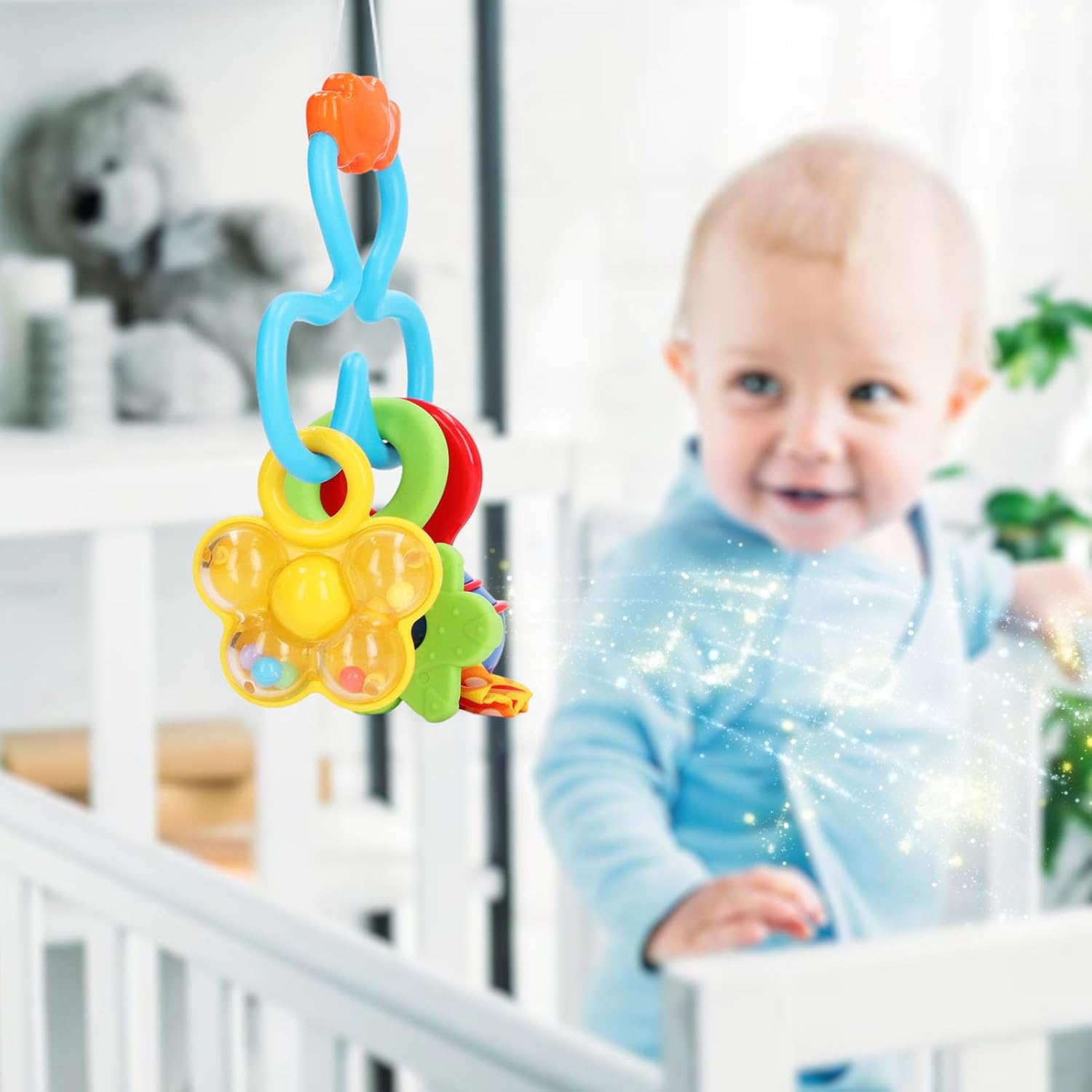 [SUONO CAMPANELLA MORBIDO]: produce un suono morbido che attira i bambini, migliora la stimolazione sensoriale e supporta lo sviluppo dell'udito. [NEONATO]: crea un bambino premuroso, adatto a varie occasioni come compleanni, Natale, baby shower e attività genitore-figlio. [FORMA ATTRAENTE]: presenta colori vivaci, motivi ad alto contrasto e forme carine per coinvolgere il tuo bambino e sviluppare le sue capacità di riconoscimento dei colori. [MATERIALE PLASTICO]: realizzato in plastica, sicuro ed ecologico per la tua tranquillità e la sicurezza del tuo bambino. [DESIGN PORTATILE]: leggero e facile da appendere a una carrozzina o a un lettino per un comodo uso interno ed esterno.