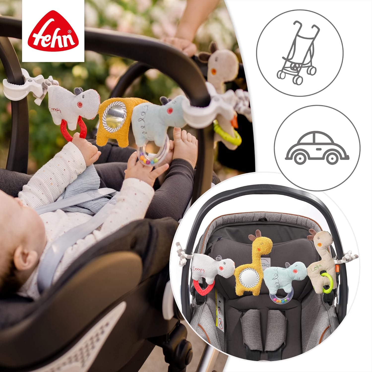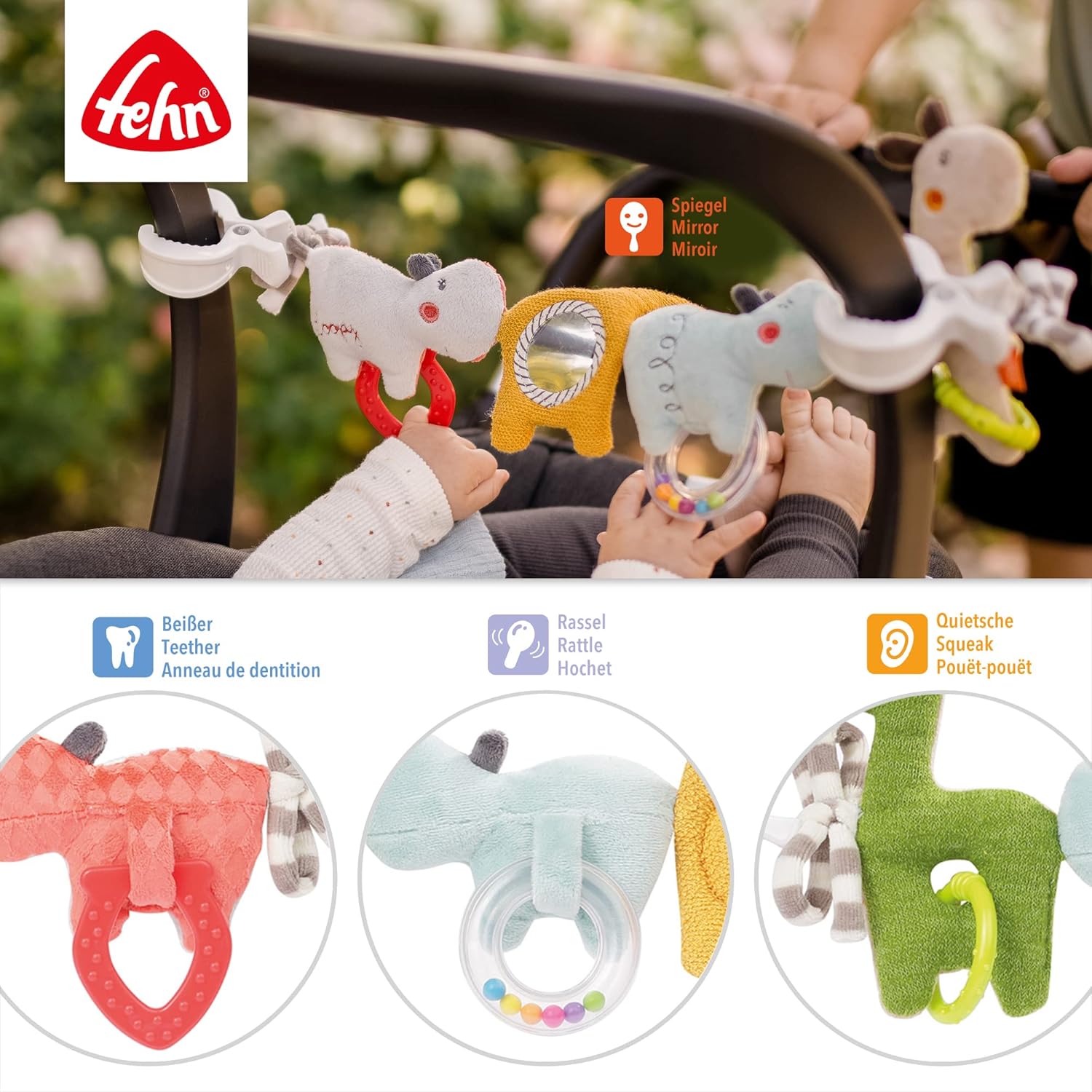 MOLTE FUNZIONI - Con la catena di giocattoli Loopy & Lotta di Fehn non avete comprato solo un giocattolo, ma diversi giocattoli in una volta: ragazze e ragazzi si divertono con la versatile catena sospesa DIVERTIMENTO COLORATO - L'ippopotamo grigio ha lo squeaker e il morbido massaggiagengive, sulla giraffa gialla c'è uno specchio - l'anello sonaglio è attaccato all'ippopotamo blu e la giraffa marrone tiene l'anello di presa ABILITÀ MOTORIE INCORAGGIATE - Il giocattolo avvincente, la catena di sonaglio e il Gli anelli per la dentizione e il gioco sulla catenella favoriscono la prima coordinazione occhio-mano e lo specchio supporta la percezione di sé GIOCA DIVERTENDO OVUNQUE - Il giocattolo per passeggino può essere portato con te in ogni viaggio, come catena da gioco appesa a casa sopra un arco da gioco o nel box per incoraggiare le sensazioni e la presa CONTENUTO DELLA CONSEGNA - 1x catena per passeggino Loopy & Lotta / Giocattolo mobile per bambini con gancio / Lunghezza: 45 cm / Materiale: velluto, spugna, maglia, nicki, tessuto / lavaggio a mano/codice articolo: 059137