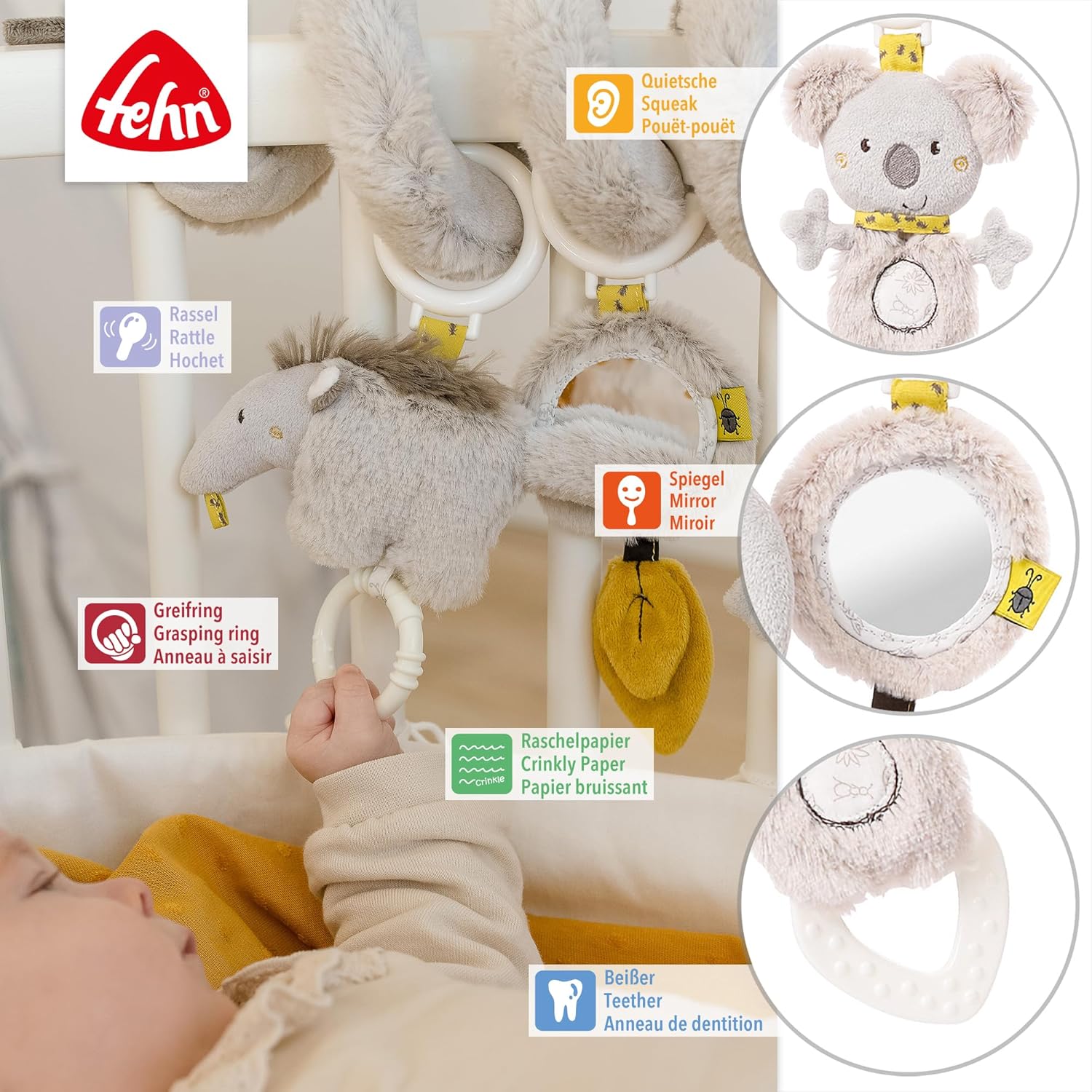 DIVERTIMENTO DA GIOCARE OVUNQUE - Con il simpatico formichiere e il tenero koala, il bambino ha sempre i suoi due migliori amici al suo fianco - sia in viaggio che a casa IMPARARE GIOCANDO - Con il colorato mix di funzioni e colori, i piccoli animali di peluche invitano a osservare, giocare, afferrare e allenare la coordinazione occhio-mano ABILITÀ MOTORIE PROMOTE - Primi tour di scoperta: la spirale viene fornita con un sonaglio, un cigolio e uno specchio Gli elementi 3D fanno illuminare gli occhi del bambino e promuovono giocosamente percezione di sé PRATICA E FACILE CURA - Grazie al pendente mobile, la catena a spirale può essere facilmente avvolta sul letto, nel box, nel passeggino o attorno all'ovetto ed è lavabile a 30°C CONTENUTO DELLA CONSEGNA - 1 x spirale di attività della collezione Australia / Dimensioni: 30 cm di lunghezza / Materiale esterno: morbido velluto, peluche, tessuto / Lavabile a 30°C / Codice articolo: 064100
