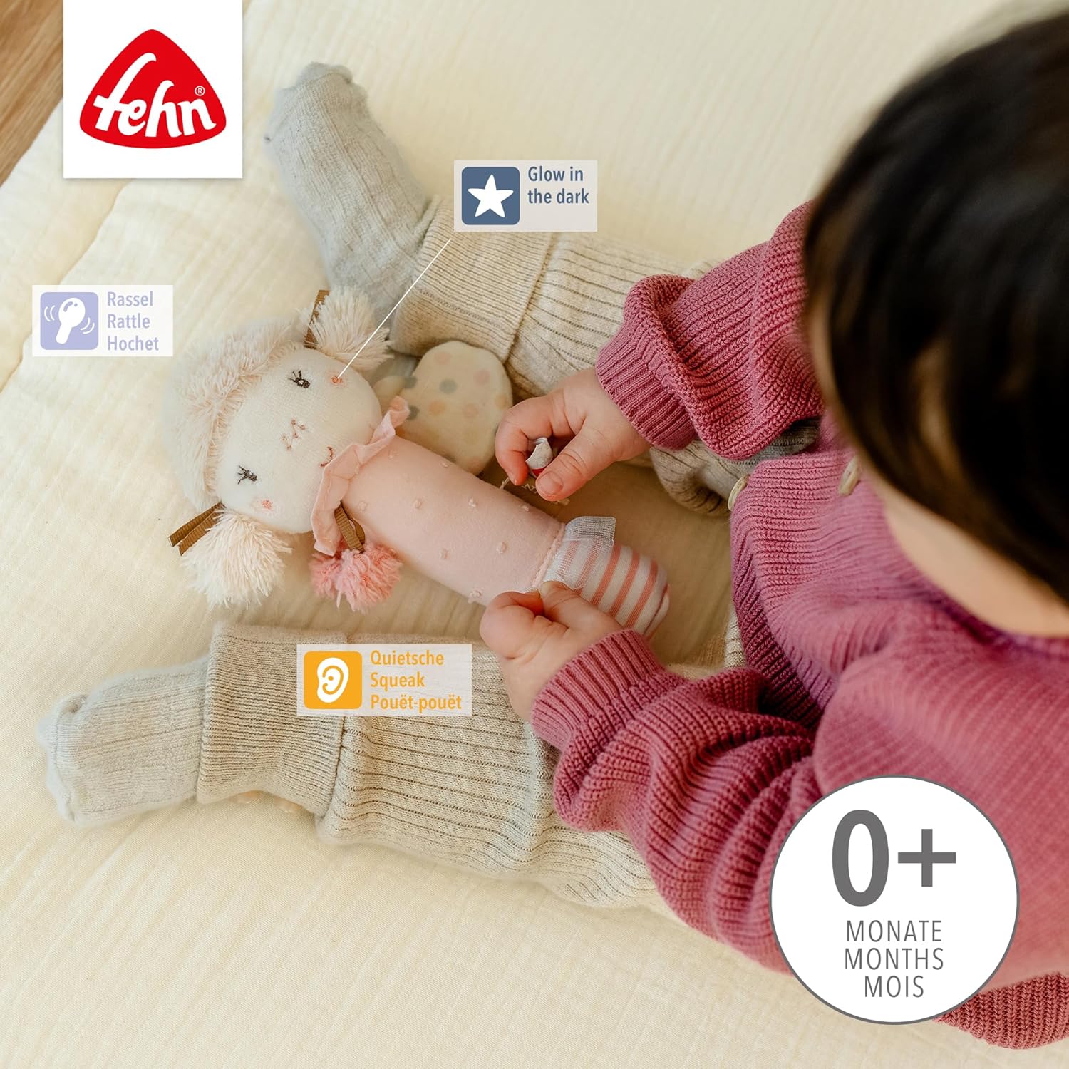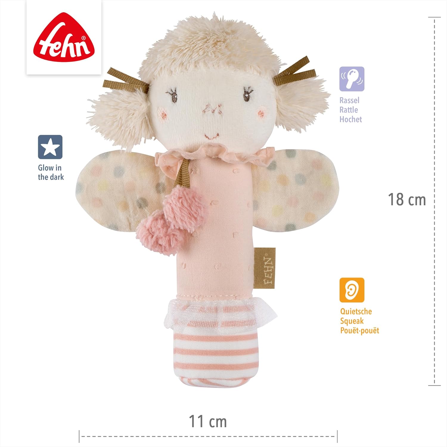 Facile da impugnare, supporta la curiosità naturale e incoraggia la presa e il gioco: lo squeaker a bastoncino è un compagno fedele per i bambini fin dalla nascita. Con trecce, ali e pompon in un emozionante mix di materiali, la simpatica fata dai colori delicati conquista in un batter d'occhio il cuore del bambino. Gli elementi "fosforescenti" della simpatica fatina allontanano la paura del buio del bambino quando si addormenta e garantiscono sicurezza. Il giocattolo da presa promuove facilmente le capacità uditive, di presa e di presa, il senso del tatto e le capacità motorie del bambino ed è quindi ideale come regalo per nascita, battesimo o compleanno. Fornitura: 1x fata giocattolo da afferrare con bastoncino con ricamo "fosforescente", cigolio e sonaglio / misura 18 cm / materiale esterno: nicki, mussola, peluche, bouclette, jersey, tulle / imbottitura: poliestere / lavabile a 30°C / art. 045109